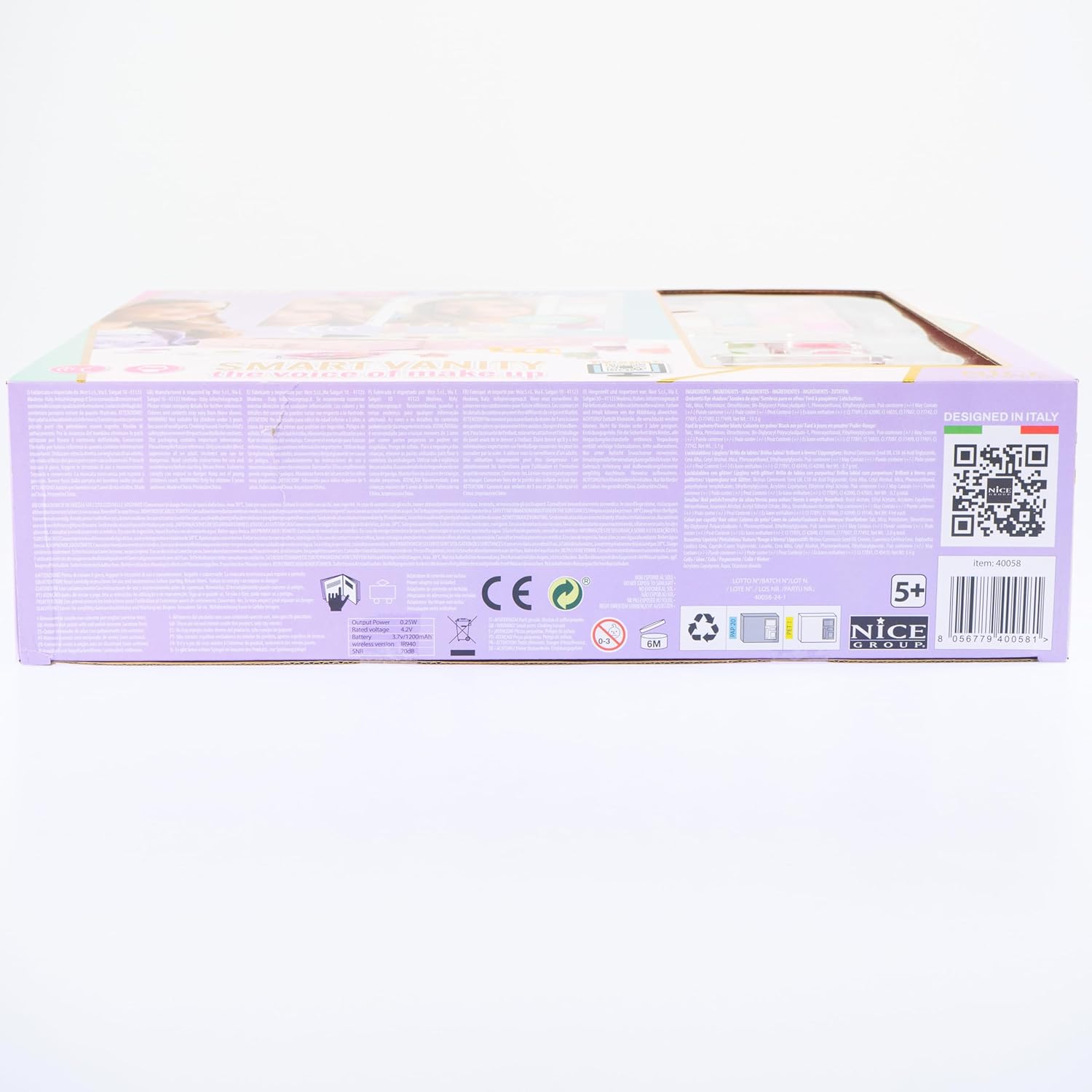 PINK IT SMART VANITY: è una specchiera interattiva parlante e portatrucchi, con led e rilevamento della presenza, con 4 specchi di cui uno ingranditore. USO: seguendo i consigli audio suggeriti dalle card che vanno inserite nel lettore della specchiera, le bambine si divertiranno a truccarsi il volto e creare nuovi look con il set di trucchi in dotazione, imparando ad abbinare i colori degli ombretti e dei lucidalabbra. CONTENUTO: 1 specchiera con cassettiera in cui si possono inserire gli 10 ombretti, 3 fard, 5 lucidalabbra, 1 rossetto, 3 applicatori, 3 smalti, 1 separadita, 2 colori e 3 decorazioni per capelli, 1 foglio di gemme adesive. Presenti anche 25 carte stile, 5 carte consigli di trucco, 5 carte armocromia. DIMENSIONI: L 44 x A 41,5 x P 12 cm. Prodotto Originale PINK IT by Nice Group. Età consigliata: 5+