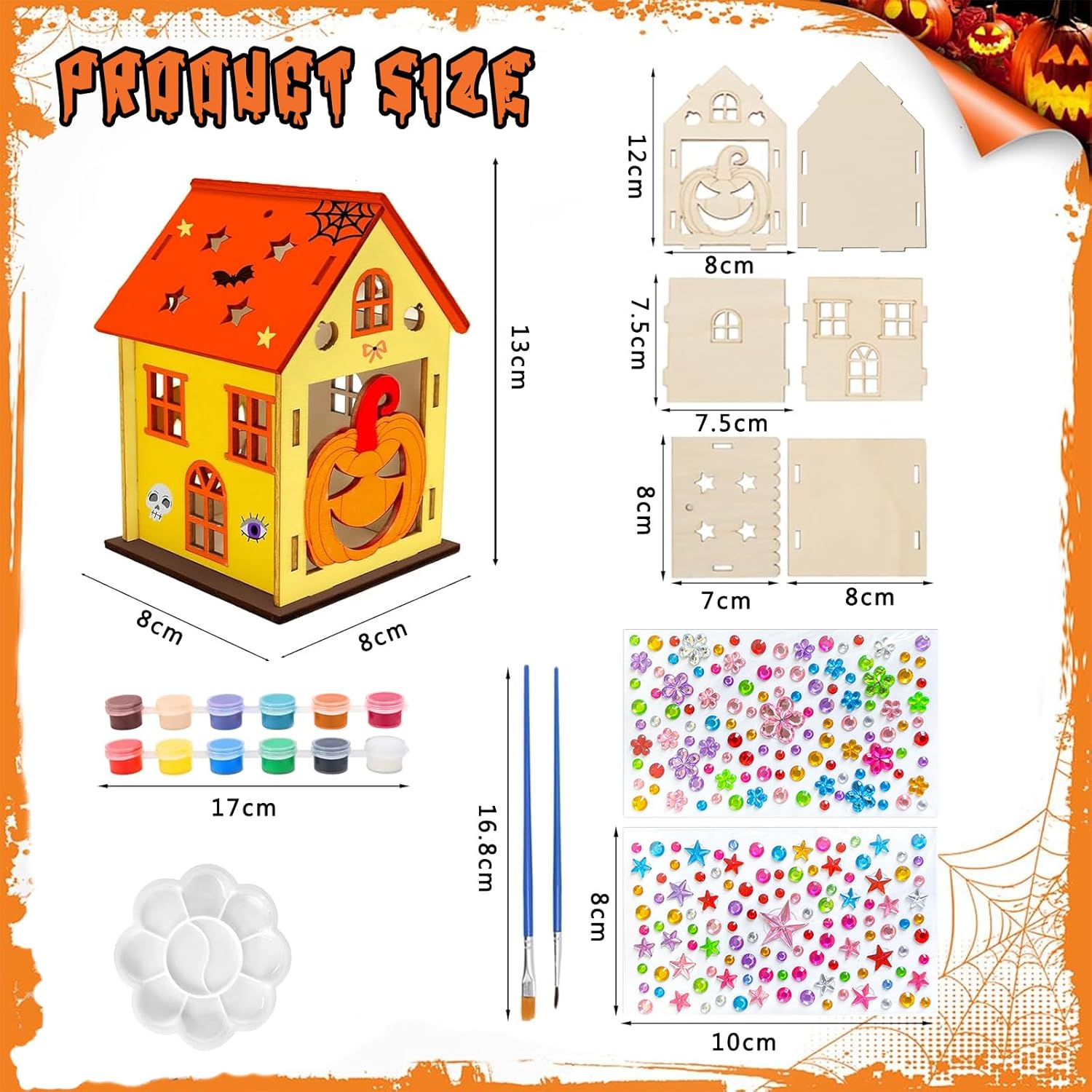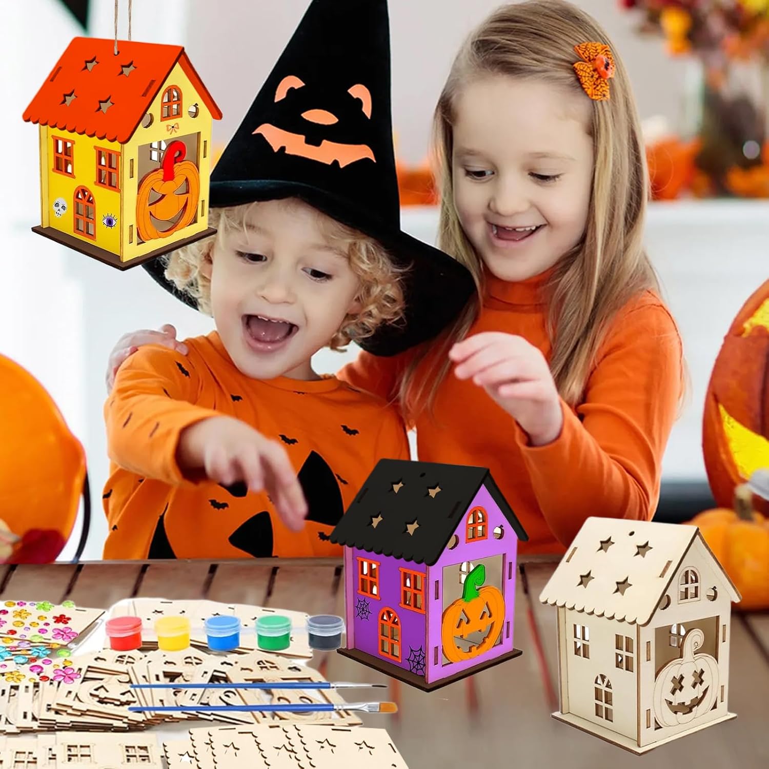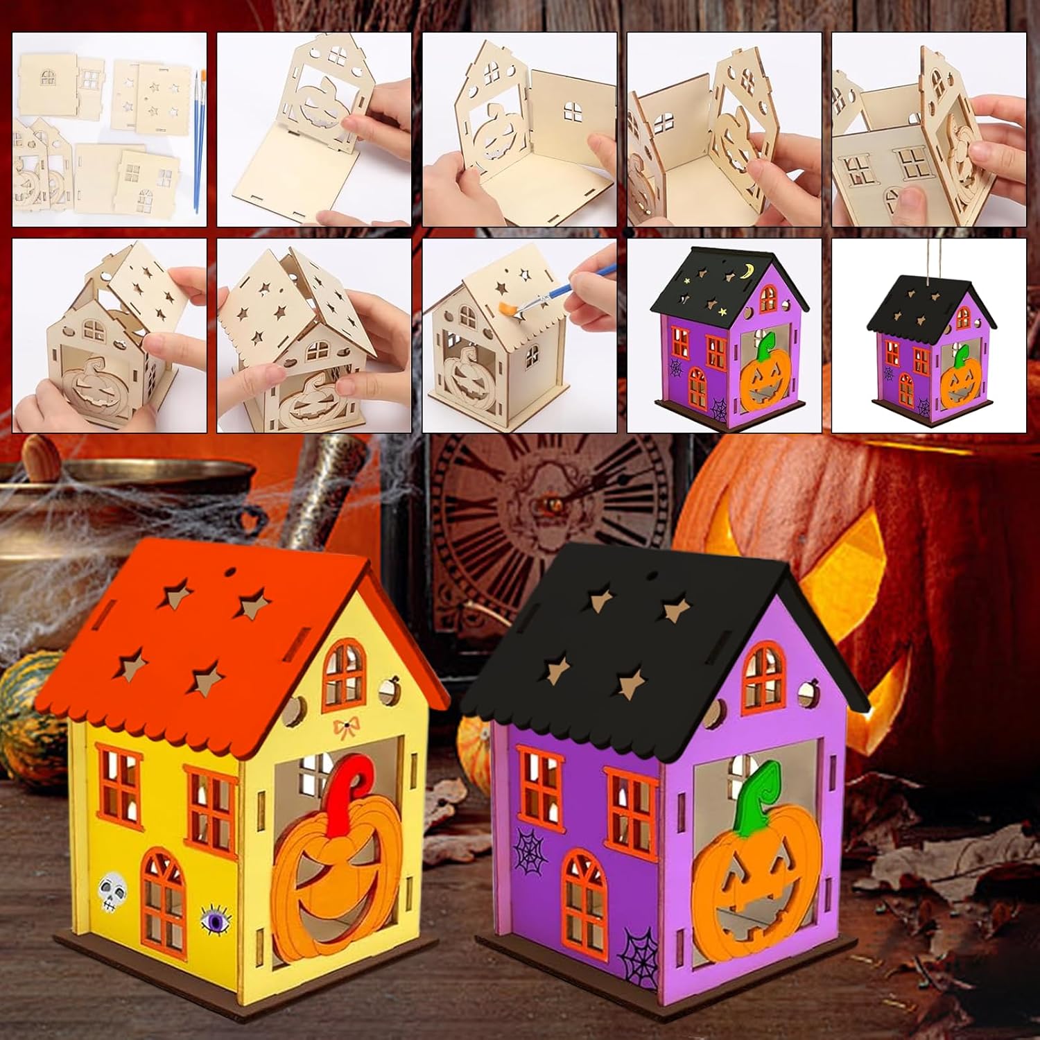 Set per Halloween per bambini: Riceverete 65 pezzi per Halloween per bambini. La confezione contiene 42 pezzi in legno (7 pezzi per ciascuno dei 6 stili), 6 pezzi di corda, 12 colori, 2 pennelli, 1 ciotola per miscelazione, 2 fogli di adesivi con strass Materiali di alta qualità: Il set per bricolage autunnale è realizzato con trucioli di legno naturale, superficie liscia, resistente e durevole, colorazione delicata, senza piccole spine di legno, anche i bambini possono usarlo in sicurezza Facile da utilizzare: La decorazione in legno di Halloween è molto facile da usare, basta trovare la giusta posizione della tavola corrispondente, design a scatto, molto facile da assemblare Decorazioni per Halloween: I nostri kit di creazione di lanterne sono perfetti per il coordinamento occhio-mano, lo sviluppo dell’abbinamento dei colori, questa è un'attività eccezionale per le sessioni scolastiche, domestiche, da soli e in gruppo Regalo perfetto: Il Kit Lanterne Di Legno Di Halloween è il regalo perfetto per i bambini che amano il fai da te e partecipano ad Halloween. Promuove la loro creatività, migliora le loro capacità motorie e offre ore di intrattenimento