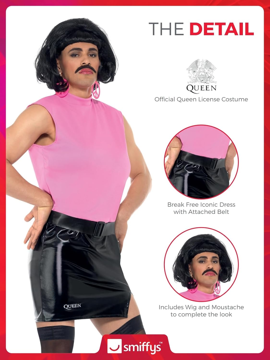 Un fantastico costume divertente che \xe8 perfetto per una serata a tema pop star o anni '80 questo Freddie Mercury ufficiale da Queen costume \xe8 dal 1984 I Want To Break Free video musicale. Questo vestito include una parrucca rosa imbottita vestito e bastone su baffi finti.