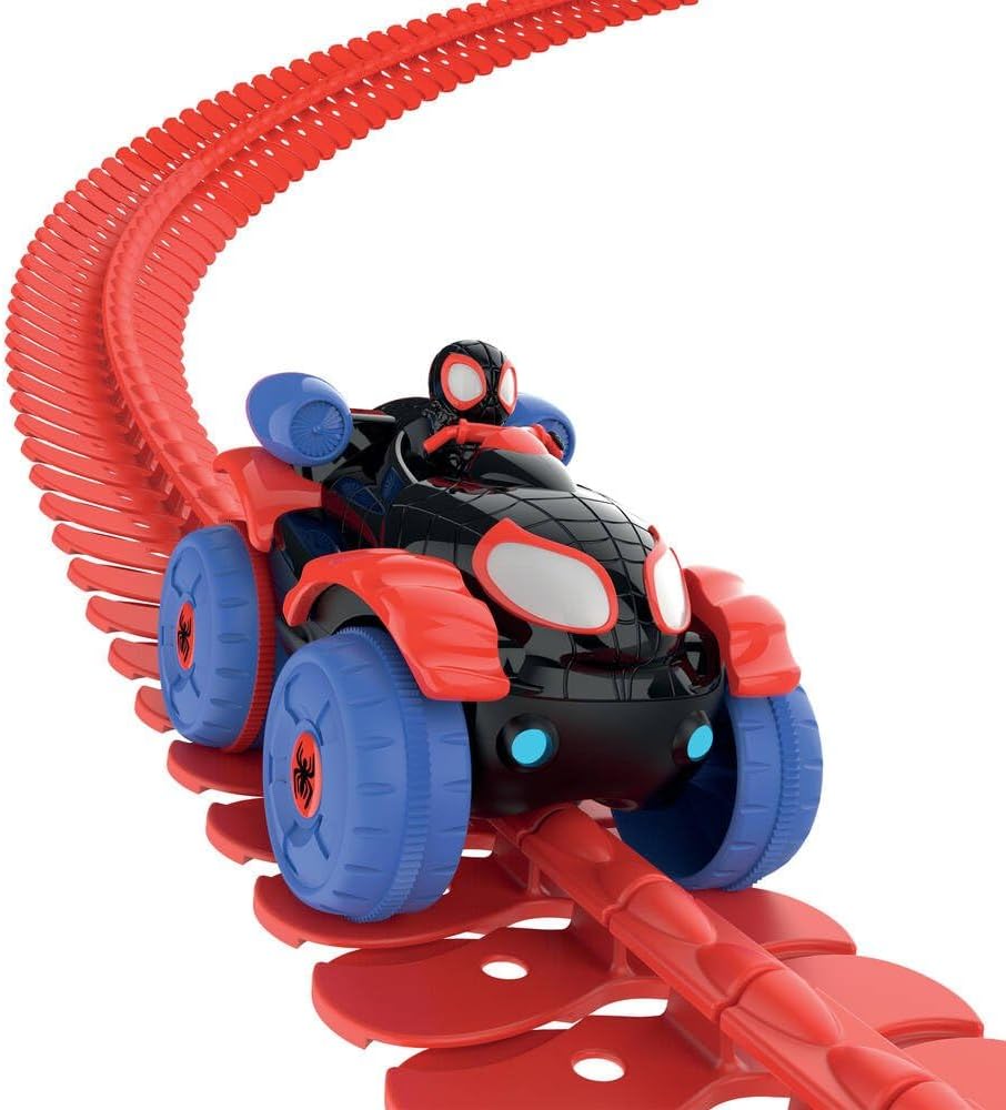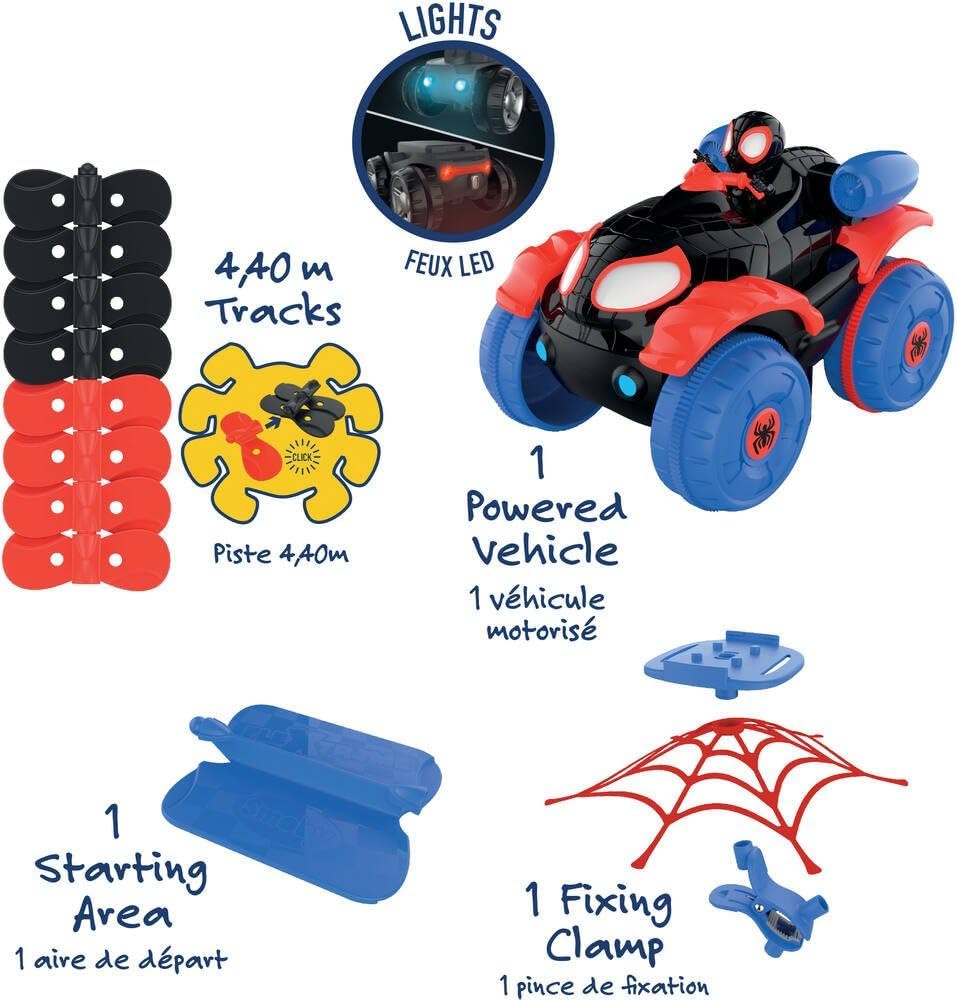 Immergiti nell'incredibile mondo di Flextreme con Spidey e i suoi straordinari amici Immagina e costruisci una moltitudine di circuiti in completa libertà, grazie alle piste flessibili, sfruttando l'ambiente e gli oggetti intorno a te Il veicolo di Spin (Miles Morales) si aggrappa alla pista e si lancia in una corsa pazzesca: salite, discese, passaggi sottosopra, rotazioni, giri della morte, è capace di tutto La ragnatela è montata su un morsetto di montaggio e può essere installata su tantissimi supporti La confezione include 4,4 m di binari, 1 veicolo elettronico luminoso e 1 telo di montaggio con clip 3 batterie LR03 incluse – A partire da 4 anni