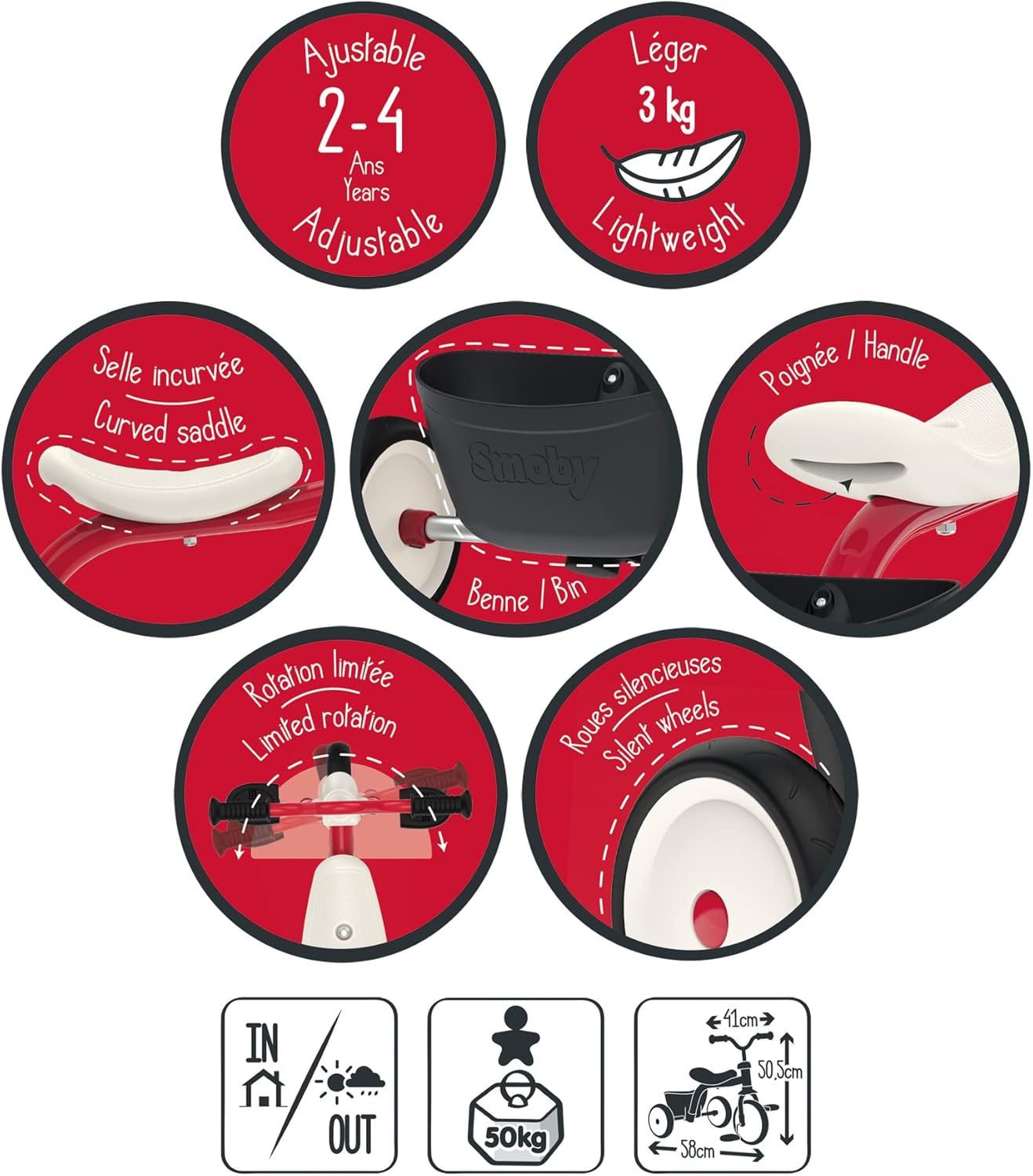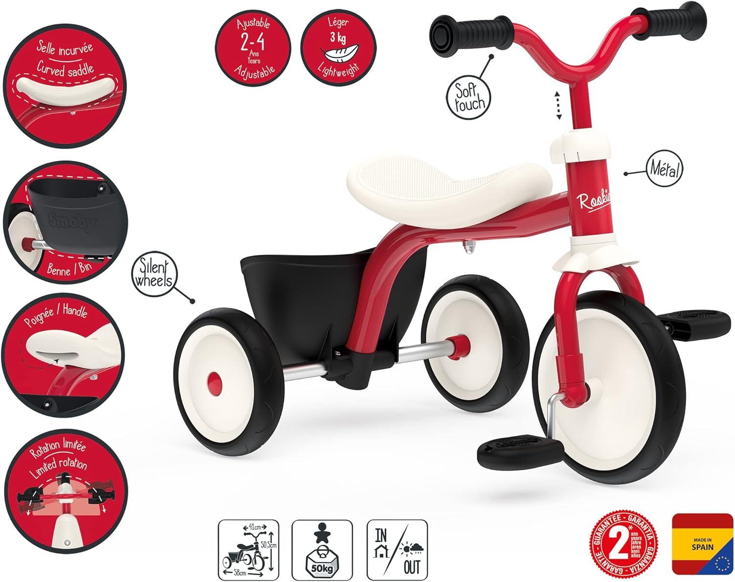 Un triciclo in stile retrò che delizierà il tuo bambino Con telaio e manubrio in metallo e maniglie morbide, questo triciclo promette robustezza e comfort. Dotato di 3 ruote silenziose (EVA), le passeggiate saranno piacevoli e tranquille. Il tuo bambino potrà divertirsi a raccogliere tutto ciò che trova sul suo cammino e a riporre i suoi reperti nella sua scatola portaoggetti. Puoi anche trasportare facilmente il triciclo grazie alla maniglia situata sotto il sedile. Manubrio regolabile in altezza Dai 2 anni - Prodotto in Spagna