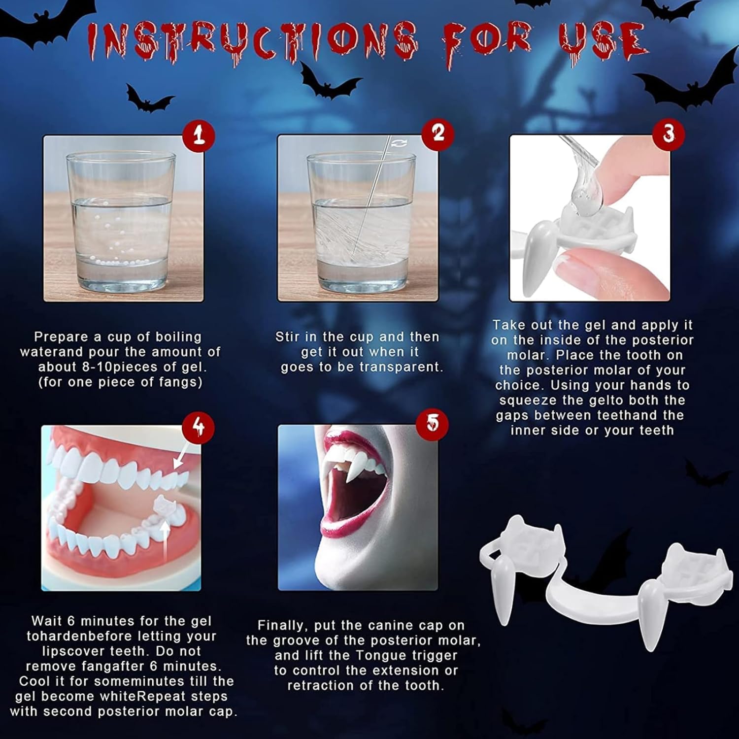 Materiale morbido: queste zanne di vampiri realizzate sono realizzate in addominali e silicone che durano e riutilizzabili, non tossici e inodore, non facili da rompere o deformare, comodi e liscia per morsi in bocca..Puoi lavarli e asciugarli quando non in uso, quindi conservarli nelle caselle fornite per il prossimo utilizzo. Fang da vampiri retrattili: puoi controllare l'aspetto e la scomparsa delle zattere da zampa con la lingua;.Lascia che si allunghino quando vuoi suonare un vampiro e ritirare le parentesi graffe quando non ne hai bisogno, proprio come i veri denti di vampiri. Occasioni applicabili: questi denti da vampiri sono facili da trasportare e usare, ma possono non essere applicati solo nella vita quotidiana, ma anche adatti a feste di Halloween, mascherate, cosplay di costumi e così via.. Il pacchetto include: riceverai 2 pezzi di zanne da vampiri retrattili e 1 colla per denti del tubo..Sono pieni di un piccolo OPP trasparente, che sono sufficienti per soddisfare le esigenze di sostegno del costume di Halloween e le esigenze di sostituzione e ti offrono un meraviglioso ed eccitante tempo di Halloween. Dettagli dimensioni: Dimensione del prodotto: circa 8 cm * 7,8 cm;.Puoi vestirli a feste di Halloween o feste a tema horror..Questi denti ti faranno sembrare molto orribili, queste zanne danno ai costumi di vampiro un nuovo look, avrai una festa indimenticabile.