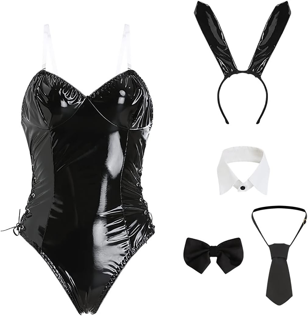 It's quite sexy but not the best on my wife, resulting in quite a bit of wrinkling in the fabric. The collar and ties are good though. The ears are quite long and she felt much less self conscious without them! Nice wet look PVC fabric. Note that no fishnets are included, which are pretty much a necessity with a costume like this.