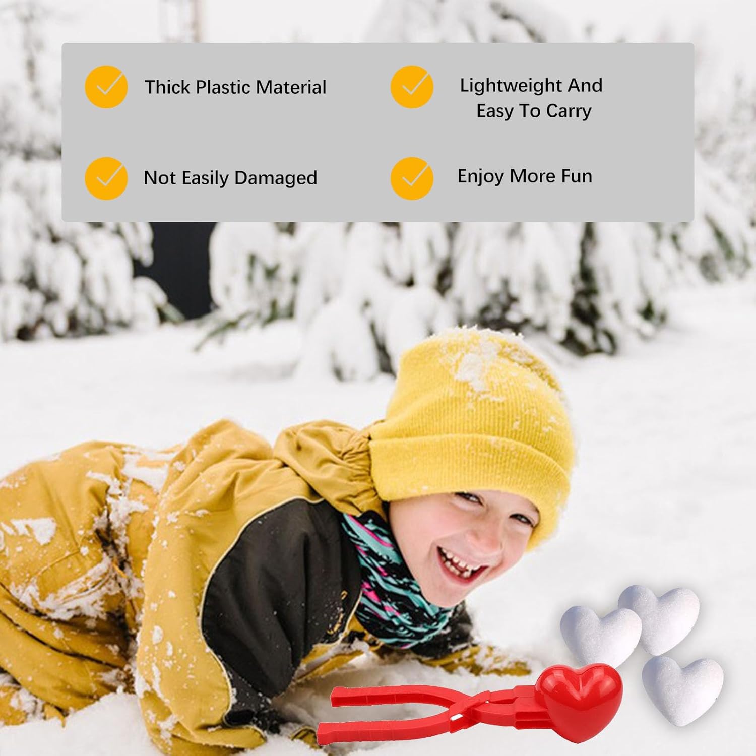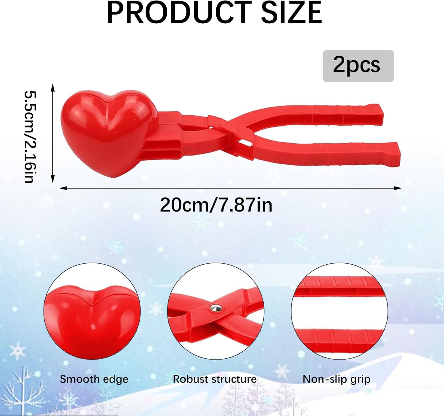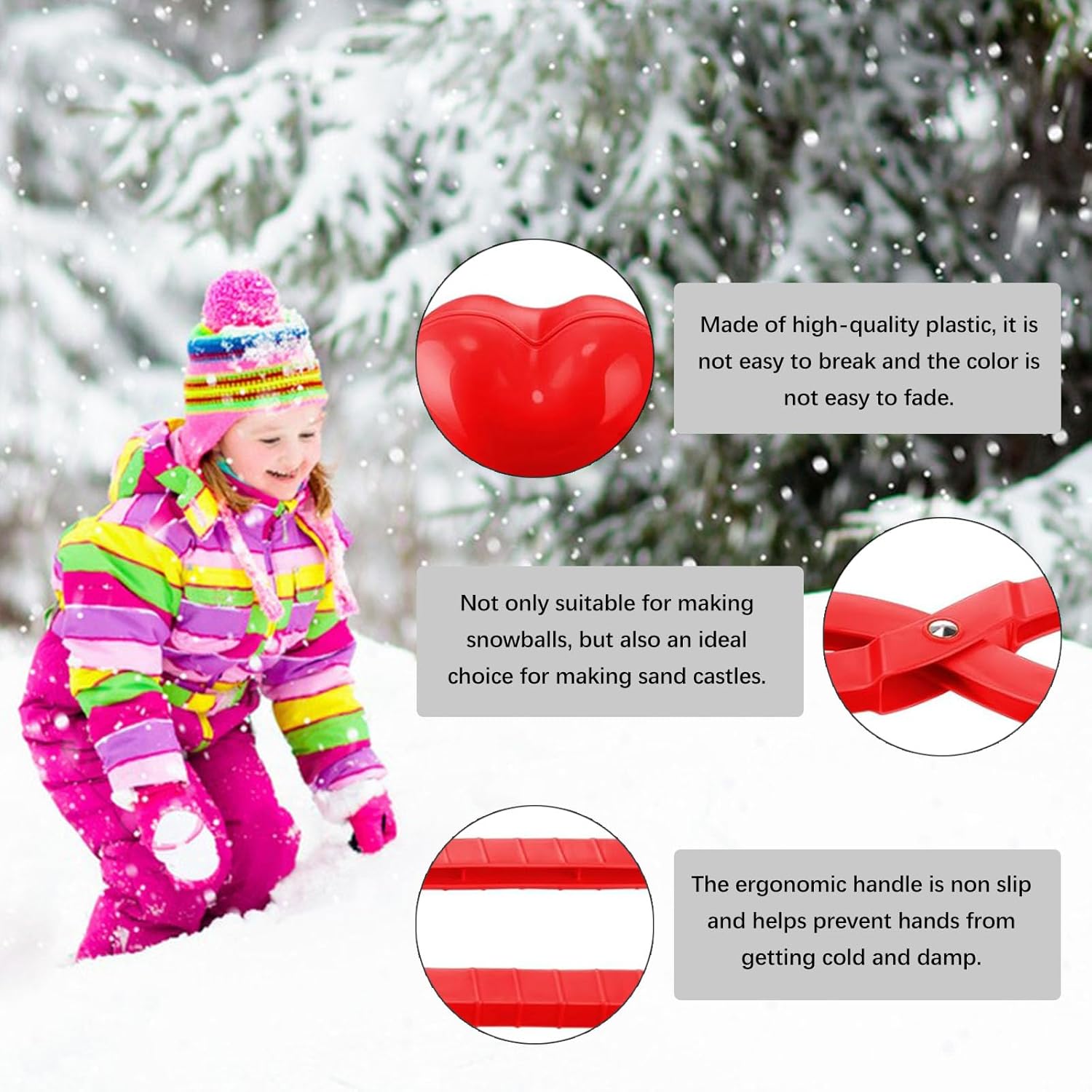 ☃️ 【Design a forma di cuore】 La pinza a palla di neve adotta un design a forma di cuore (21 * 4,5 * 6 cm). Puoi usarlo per creare molte palle di neve a forma di cuore. Posizionali nel tuo giardino o balcone per rendere più bello il tuo giardino e il tuo balcone. ❄️ 【Materiale】 Il nostro giocattolo invernale a palla di neve è realizzato in plastica inodore per garantire la sicurezza dei bambini. Resistente all'usura, senza sbavature, buona resistenza allo scivolamento, maneggevolezza, i bambini possono fare simpatiche palle di neve sulla neve in inverno e palle di sabbia sulla spiaggia in altri periodi dell'anno. ✨ 【Facile da impugnare】 Questo strumento a palla di neve è molto adatto ai bambini. È un buon giocattolo per migliorare il rapporto genitore-figlio e godersi la giornata nevosa. Il creatore di palle di neve a cuore ha un design flessibile, la maniglia è molto comoda da impugnare, puoi usarla per fare palle di neve rapidamente, risparmiare tempo, mantenere le mani calde e pulite e fare un'allegra battaglia a palle di neve sulla neve. ⛄ 【Divertimento sulla neve】 Questo strumento per palle di neve è ideale per i bambini e li aiuta anche a giocare all'aperto in inverno. Inoltre, il giocattolo per la creazione di palle di neve è adatto a persone di tutte le età per battaglie a palle di neve o una divertente giornata sulla neve. 💁 【Applicazione】 Questa clip a palla di neve è adatta per la neve o la spiaggia. Può essere utilizzato per fare palle di neve o palle di sabbia. Incoraggia lo scambio emotivo tra te e la tua famiglia e i tuoi amici nel gioco e porta felicità senza fine. È anche un regalo ideale per i bambini in occasione di festività come Natale, Ringraziamento e compleanni.