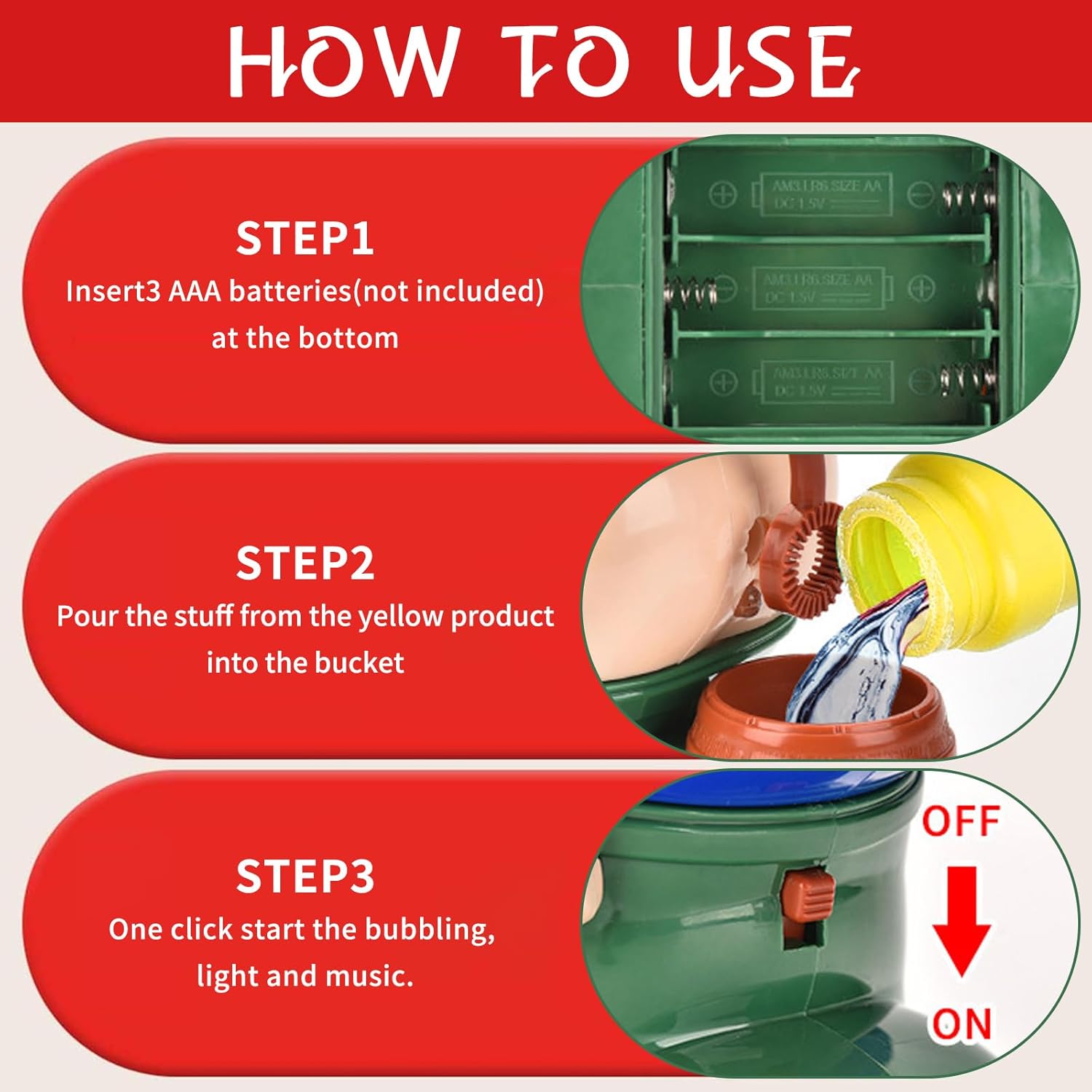 Christmas Santa Bubble Fart Blower: arricchisci lo spirito natalizio con le nostre bolle di Babbo Natale. Quando stringi la bolla, emette suoni di scoreggia e suona anche un'allegra musica natalizia mentre soffi bolle per creare un'atmosfera allegra, La macchina per bolle dal design unico per divertimento e risate senza fine. Materiali della macchina per bolle: Il nostro soffiatore per bolle di scoreggia natalizio è realizzato in plastica ABS resistente e di alta qualità, L'esterno liscio e arrotondato della macchina per bolle è privo di spigoli vivi o superfici ruvide che possono graffiare o danneggiare le mani. Preparati per divertimento e risate senza fine con questa macchina automatica per bolle di Babbo Natale con soffiatore di bolle: il design divertente di Babbo Natale che scoreggia, accompagnato da musica, luci e innumerevoli bolle, farà ridere i bambini. È importante notare che questa macchina per soffiare bolle di scoregge richiede 3 batterie AA (non incluse nella confezione) per attivare il movimento del braccio e l'aria che crea le bolle di scoreggia. Macchina automatica per bolle di scoregge: con i divertenti effetti sonori della macchina per bolle di Babbo Natale, preparati a ridere a crepapelle. Decorato con l'immagine di un personaggio natalizio, aumenta l'atmosfera festosa dei vostri ritrovi. La Macchina per Bolle di Babbo Natale riproduce allegra musica natalizia, aggiunge un tocco di risate stravaganti e, naturalmente, emette suoni divertenti di scorregge. Regalo della Macchina per Bolle per Bambini: Progettato per la versatilità, il nostro soffiatore di bolle per scoregge di Babbo Natale è la tua fonte di intrattenimento durante riunioni di famiglia, feste e attività celebrative, creando un'atmosfera frizzante piena di gioia ed eccitazione. Progettato ingegnosamente per un effetto scorrimento in modo che tutti possano immergersi nelle gioie delle bolle