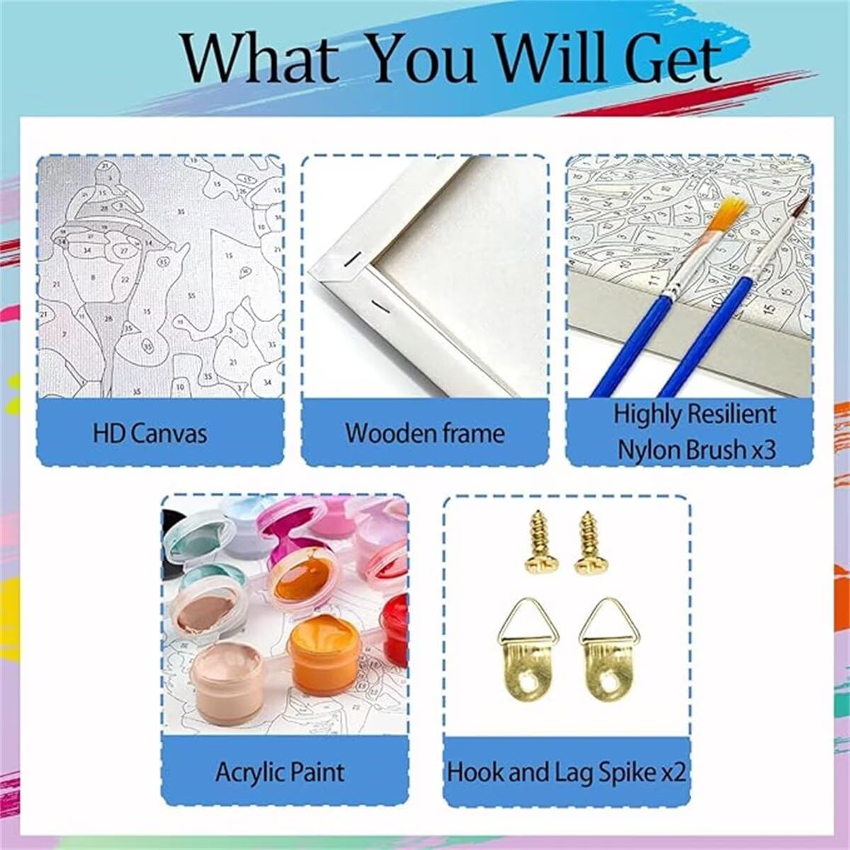【KIT DIPINGERE CON I NUMERI】 Il kit dipingere con i numeri adulti include una tela prestampata testurizzata (con cornice) con cavalletto in legno combinato, 3 pennelli di alta qualità, colori acrilici e ganci per chiodi abbinati, 1 cavalletto in legno combinato e le viti necessarie. 【TELA HD VIBRANTE E FACILE DA VEDERE (30x40cm)】 Presenta una tela colorata ad alta definizione con sezioni numerate chiare, che riducono l'affaticamento degli occhi e rendono la pittura semplice. 【FACILE DA DIPINGERE】 Basta abbinare i numeri della pittura e le figure sulla tela per riempire la pittura. Dipingi con i numeri, completa uno per uno. Il kit dipingi con i numeri è adatto a tutti i livelli, che siate adulti, bambini o principianti. 【ARREDAMENTO ELEGANTE E IDEA REGALO】Una volta terminato, diventa una splendida opera d'arte da parete per il tuo soggiorno, la tua camera da letto o il tuo ufficio. Un regalo ideale per compleanni, Natale o inaugurazione della casa per gli amanti dell'arte. 【GARANZIA DI SODDISFAZIONE】Garantiamo vernici di alta qualità e stampe nitide. In caso di problemi, non esitare a contattarci: risolveremo il problema il prima possibile. Goditi un'esperienza di pittura senza pensieri!