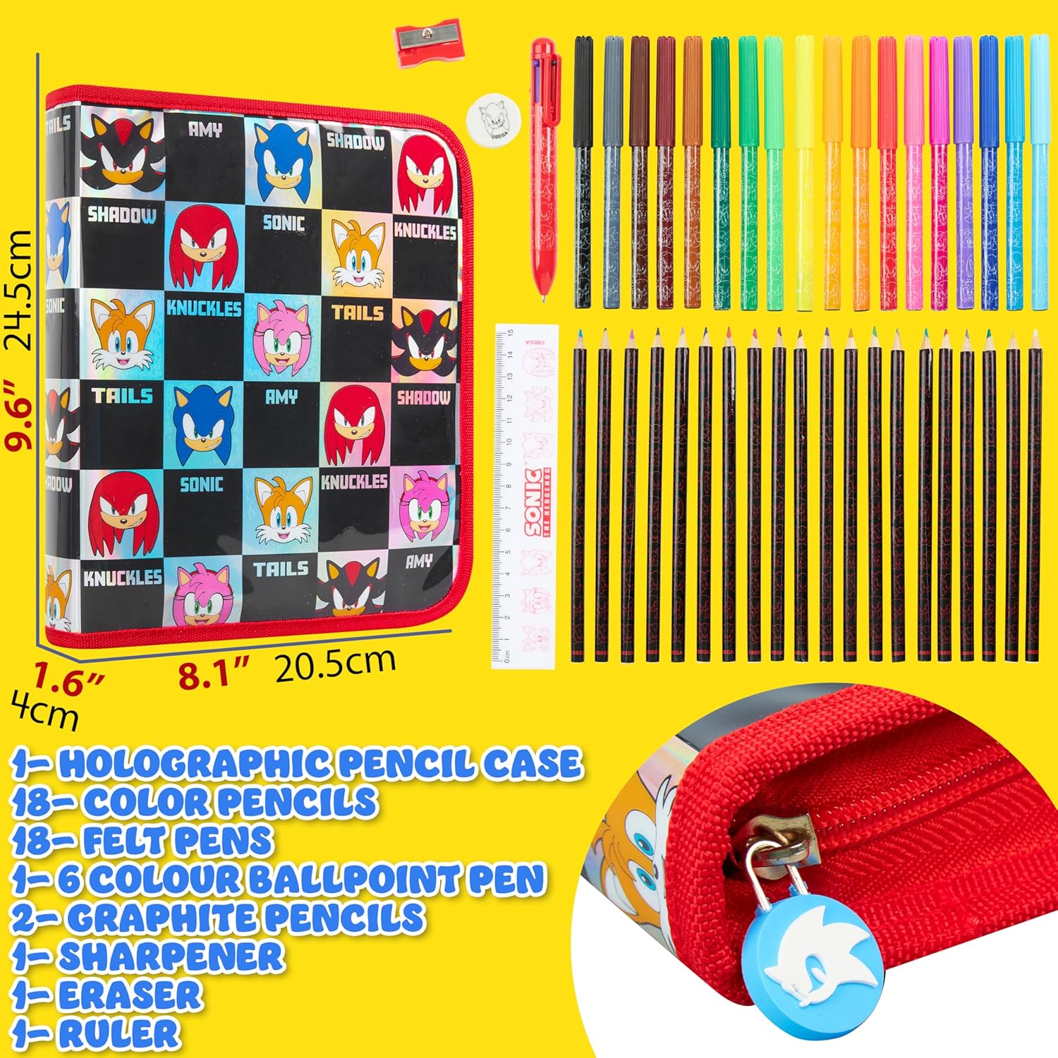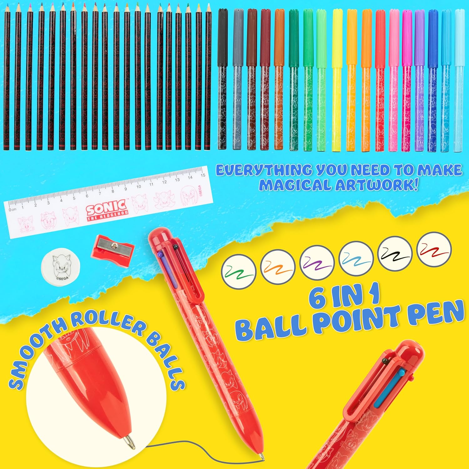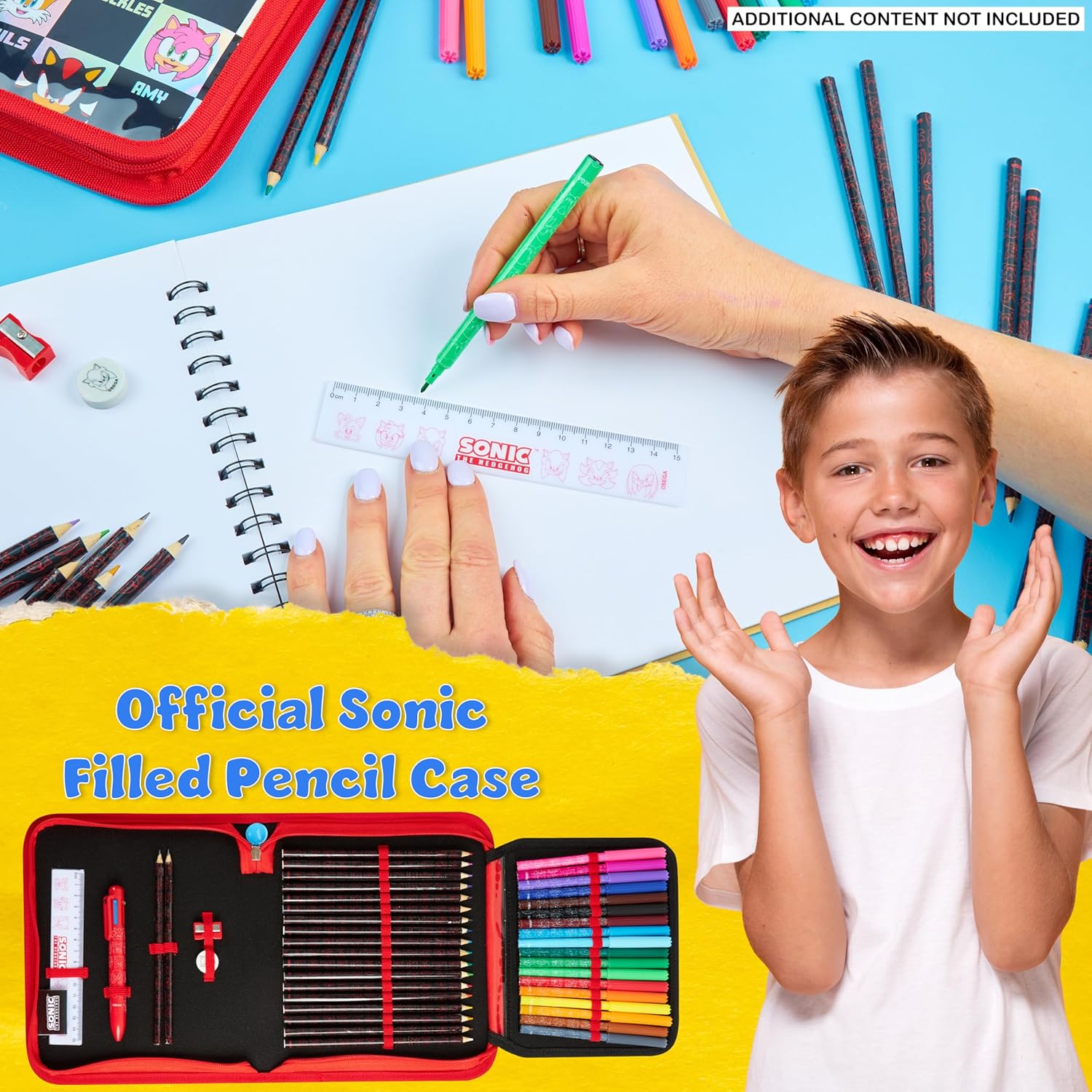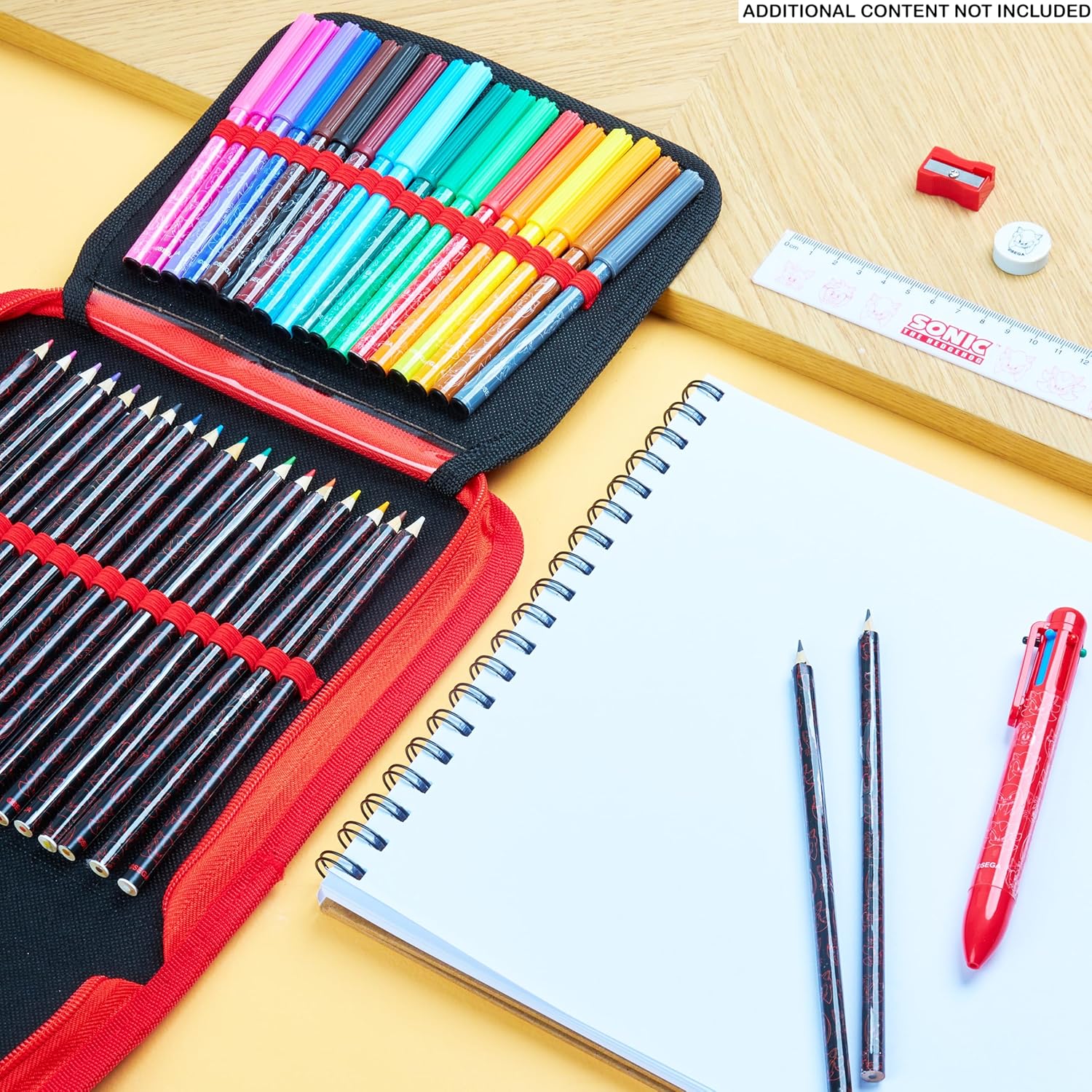 Sonic Astuccio Bambino - Porta l’energia di Sonic a scuola con questo astuccio bambini colorato e dinamico, completo di tutto il necessario per scrivere e disegnare. Un accessorio divertente per ogni piccolo fan del riccio blu! Contenuto Completo - L'astuccio di Sonic contiene matite colorate, pennarelli, matite, righello, temperamatite, gomma e una penna multicolore. Dai un’occhiata alle immagini per scoprire ogni dettaglio! Ideale per Ogni Occasione - Ideale per scuola, compiti o momenti creativi a casa. Questo set è pratico e compatto, ideali anche per essere portato in viaggio, sempre con tutto in ordine. Ideali Sonic Regalo Ragazzo - Cerchi un regalo originale per un compleanno o per il ritorno a scuola? Questo astuccio bimbo Sonic è un’idea fantastica per bambini e bambine appassionati del mitico eroe dei videogiochi! Prodotto Ufficiale Sonic the Hedgehog - Cerchi articoli scolastici con i tuoi personaggi preferiti? Questo astuccio Sonic è con licenza ufficiale e decorato con grafiche di Sonic che faranno impazzire i fan del videogioco.