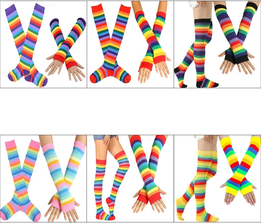 Calze: possono essere allungate sopra le ginocchia. adattano meravigliosamente senza stringere, hanno l'elastico nella parte superiore per evitare che cadano. Guanti: extra elastici e raggiungono a coprire gomito, design senza dita e per pollice, molto comodi e pratici La confezione include: 1 paio (2 x guanti senza dita 1 paio (2 x calze autoreggenti (senza confezione vendita Colore bordo opzionale: viola, rosso 1, rosso 2, giallo Taglia: Taglia Lunghezza guanti: 34 cm (13,38 pollici) Lunghezza calza: 53 cm (20,86 pollici Perfetto per feste a tema, Halloween, costumi, feste Natale, cosplay; set accessori arcobaleno può ottenere quelli da evidenziare durante la festa L design a strisce arcobaleno con colori vivaci è facile da abbinare ai tuoi diversi abiti stile, gonna e vestito tutù e così via