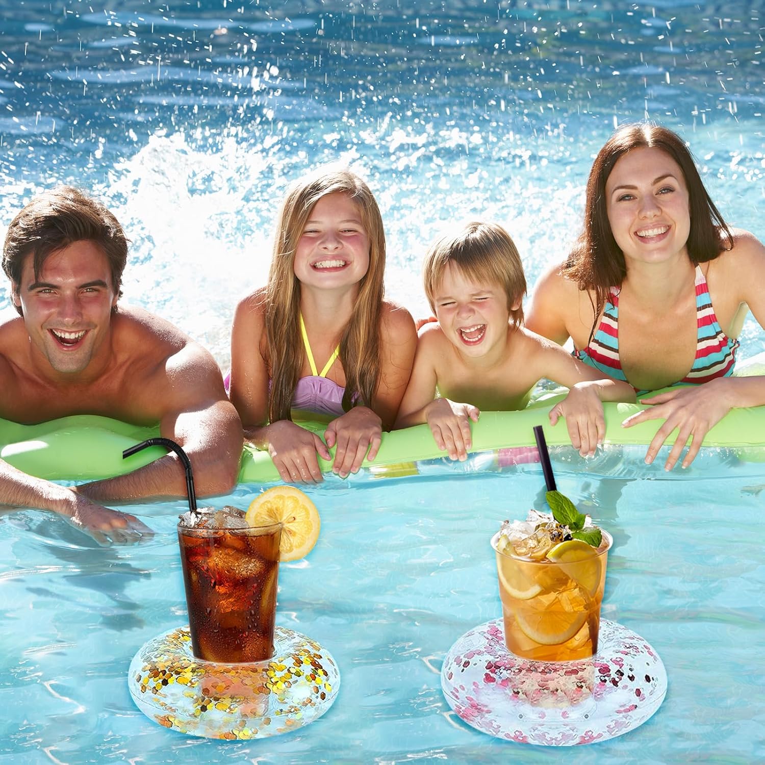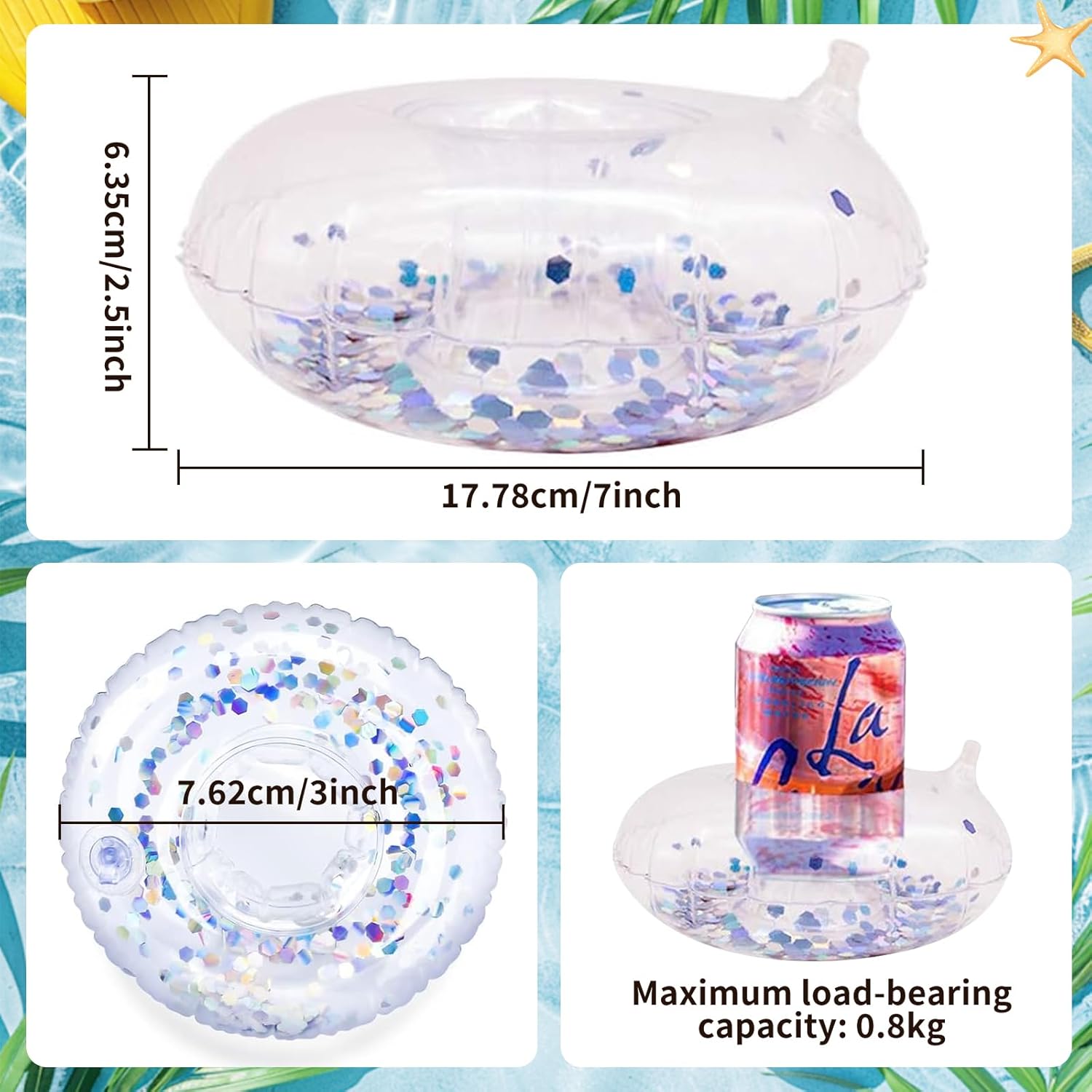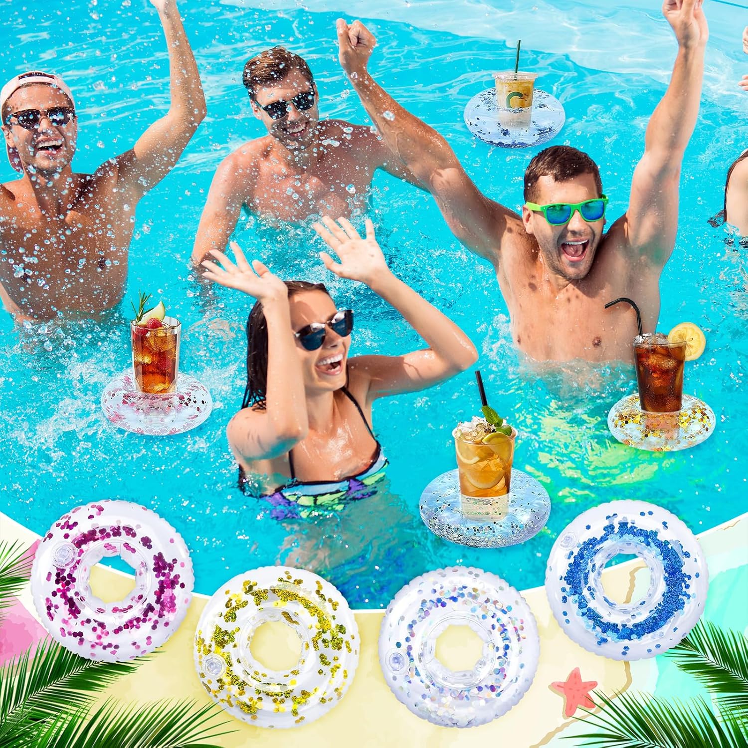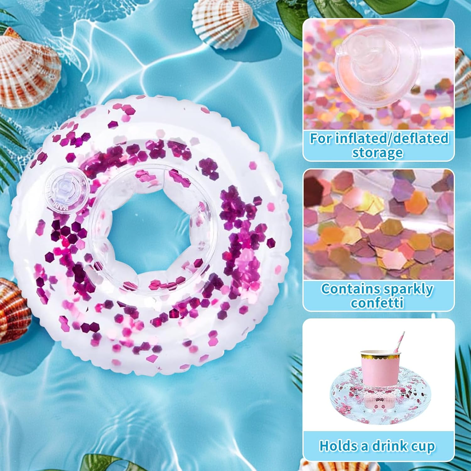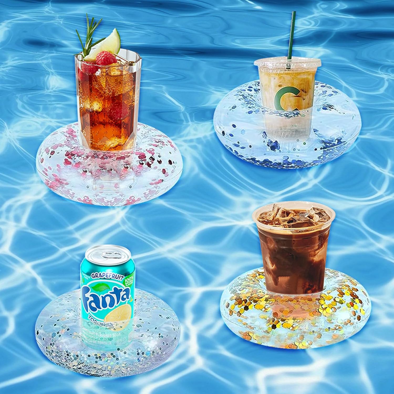 🥤 Divertimento Galleggiante: questo set include quattro portabicchieri piscina che permettono alle tue bevande di galleggiare facilmente sull'acqua, permettendoti di gustarle senza uscire dall'acqua. 🌊 Resistenti e Affidabili: realizzati con materiali di alta qualità, i nostri portabevande galleggianti offrono un'eccellente galleggiabilità e stabilità, rendendoli ideali per contenere bevande alle feste in piscina. 🏊 Design Unico: questo gonfiabili portabicchieri presenta un design con paillettes che non solo trattiene le bevande, ma migliora anche l'aspetto visivo dell'area piscina, rendendola il punto focale della festa. 💨 Facili da Gonfiare: questi porta bevande da piscina hanno un design semplice e si gonfiano rapidamente, eliminando noiosi passaggi in modo che tu possa concentrarti sulla condivisione di momenti felici con la famiglia e gli amici. 🌞 Accessori per Feste in Piscina: che tu stia rilassandoti a bordo piscina o godendoti una giornata di relax in spiaggia, questi indispensabili portabevande gonfiabili ti garantiranno un'esperienza senza pensieri in tutte le tue attività estive.