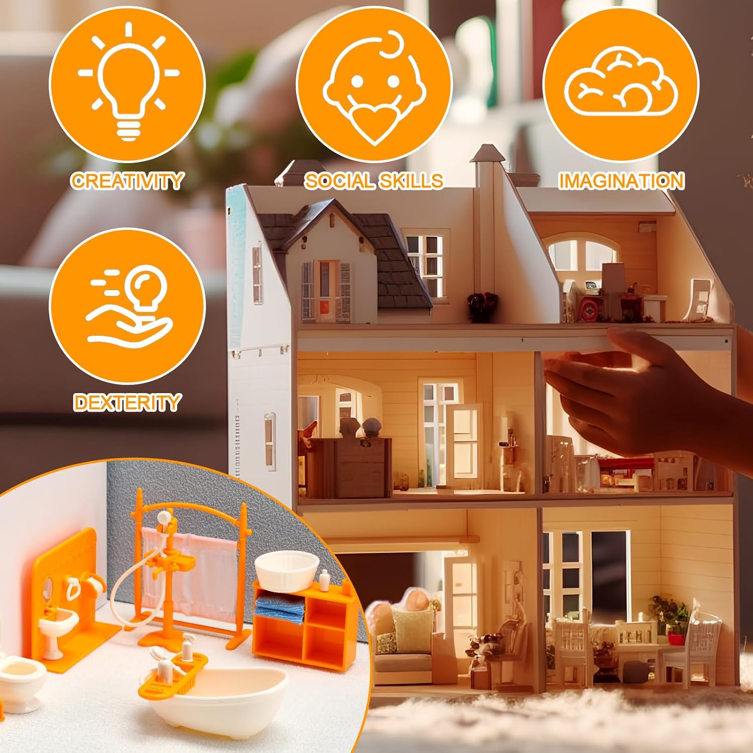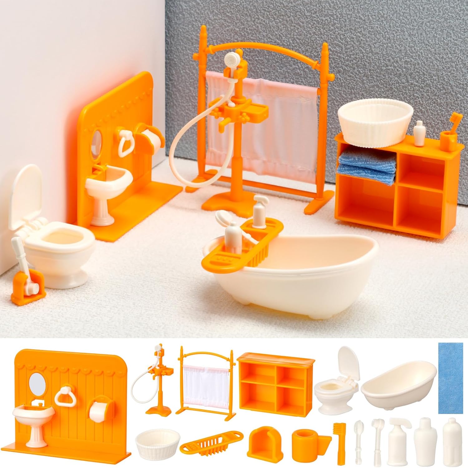Set da bagno per casa delle bambole: riceverai un mini set da bagno da 18 pezzi, incluso un lavandino, vasca da bagno, cesto porta abiti, WC, armadietto, soffione della doccia, tenda e un set completo di scene per il bagno per soddisfare le tue esigenze di decorazione. Materiale sicuro: il nostro modello di mini bagno è realizzato in plastica e resina, ha una superficie liscia e dettagli squisiti, è robusto, affidabile e durevole, rendendolo un'ottima decorazione per la tua mini casa. l'un l'altro e divertitevi nel processo Design realistico: questi accessori per mobili da bagno per case delle bambole sono progettati per bagni piccoli, ciascuno meticolosamente progettato per assomigliare a veri accessori da bagno, aggiungendo autenticità alla tua casa delle bambole Decorazione divertente: queste miniature da bagno con decorazioni per il bagno delle case delle bambole sono ideali per giardini fatati e in miniatura, sono piccole ma possono portare molto divertimento e possono essere regalate a coloro che amano fare arte con miniature e artigianato fatto a mano