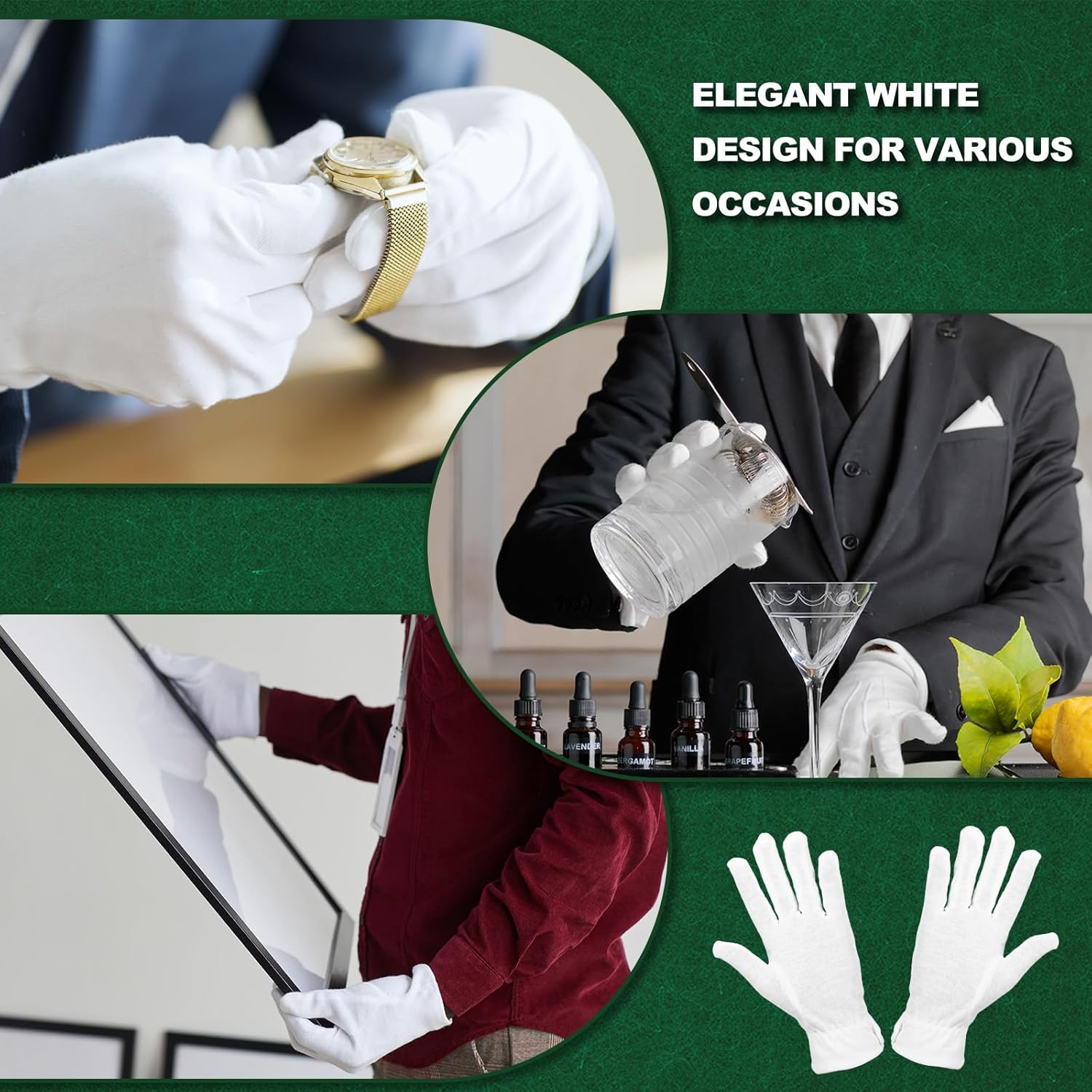 Che cos'è questo? Questi guanti formali in cotone bianco sono perfetti per guardie d'onore, smoking, ispezione di gioielli, sfilate, uscieri, catering, banchetti, abbigliamento da festa, giochi di ruolo da mago, eventi celebrativi e molto altro ancora. Contenuto della confezione: I guanti di cotone parades fornisce qui, in dimensioni di: Lunghezza totale: 20cm (7.9 inch), Palm Larghezza: 9cm (3.5nch) Nella confezione di: 9 Paia x Guanti Uniformi Ci sono dei vantaggi del prodotto? 1. I guanti Parades sono realizzati in cotone, morbido, traspirante, confortevole e resistente, consentendo il riutilizzo e una facile pulizia. 2. Ogni guanto da ispezione presenta tre delicate cuciture sul retro, migliorando l'estetica della mano e fornendo un aspetto raffinato e professionale. 3. Il polsino a scatto sul guanto da parata garantisce una chiusura rapida e sicura per una vestibilità comoda e flessibile, mantenendo i guanti in posizione durante l'esecuzione del lavoro con precisione ed eleganza.