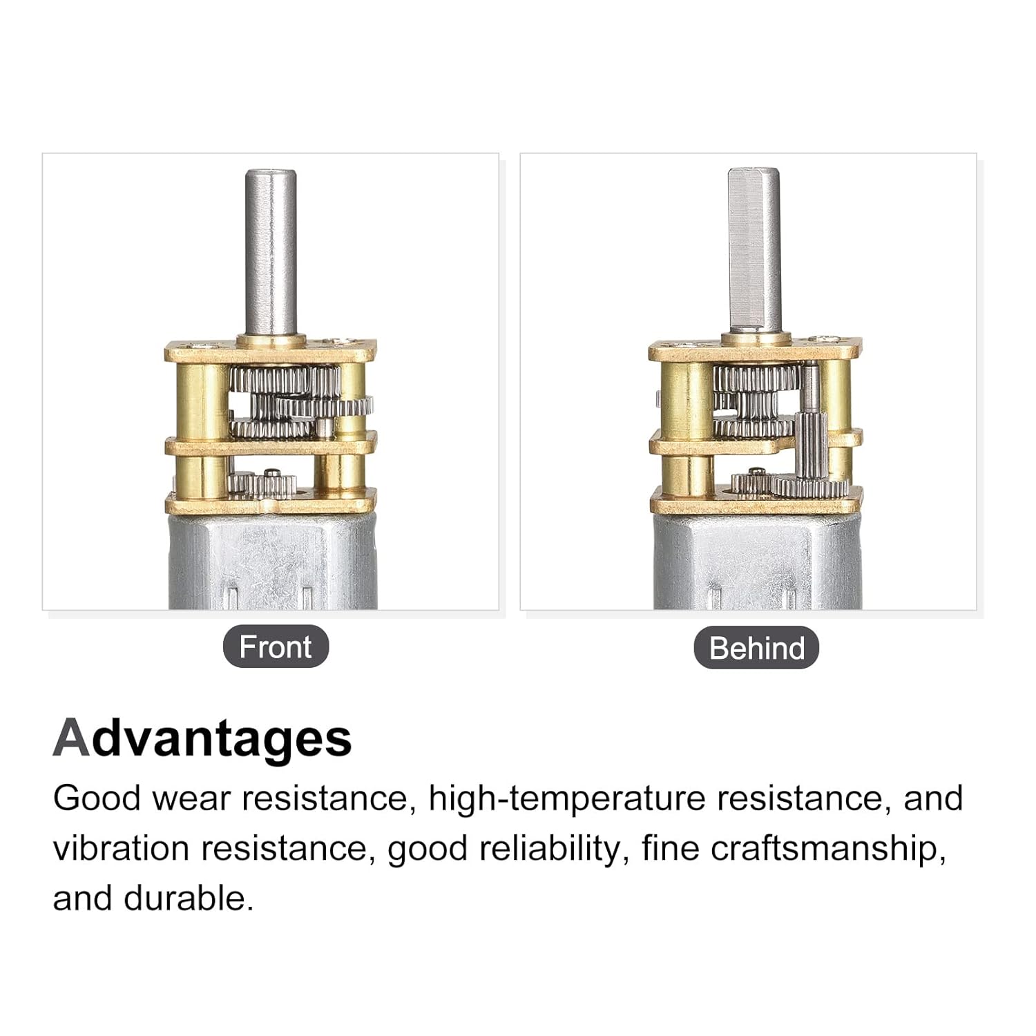 Ampiamente usato per ascensori, carrelli di atterraggio, bracci meccanici, dispositivi elettronici, fai da te, aerei RC, modellini di automobili, porte elettriche, ecc. Voltaggio: 6 V; Velocità: 500 giri/min; Diametro albero di uscita: 3 mm/0,12 pollici; Lunghezza albero di uscita: 9 mm / 0,35 pollici; Lunghezza motore: 15 mm/0,59 pollici; Dimensione totale: 36 x 12 x 10 mm/1,4 x 0,47 x 0,39 pollici (LxLxA); Modello motore: N20; Tipo di albero: tipo D; Confezione da 2 pezzi Motore Realizzato in rame e acciaio. Ha una buona resistenza all'usura, resistenza alle alte temperature e resistenza alle vibrazioni, buona affidabilità, pregevole fattura e durevole. Con buone caratteristiche di stallo, può arrampicarsi facilmente sulle colline. È inoltre possibile montare facilmente una girante sull'albero di uscita del motore. Si prega di cercare di evitare di bloccare o sovraccaricare il motoriduttore, altrimenti l'ingranaggio si abbasserà e si usurerà. Il controllo avanti e indietro non consente alla marcia di cambiare direzione immediatamente durante la rotazione. La direzione può essere cambiata solo dopo che la marcia si è fermata completamente.