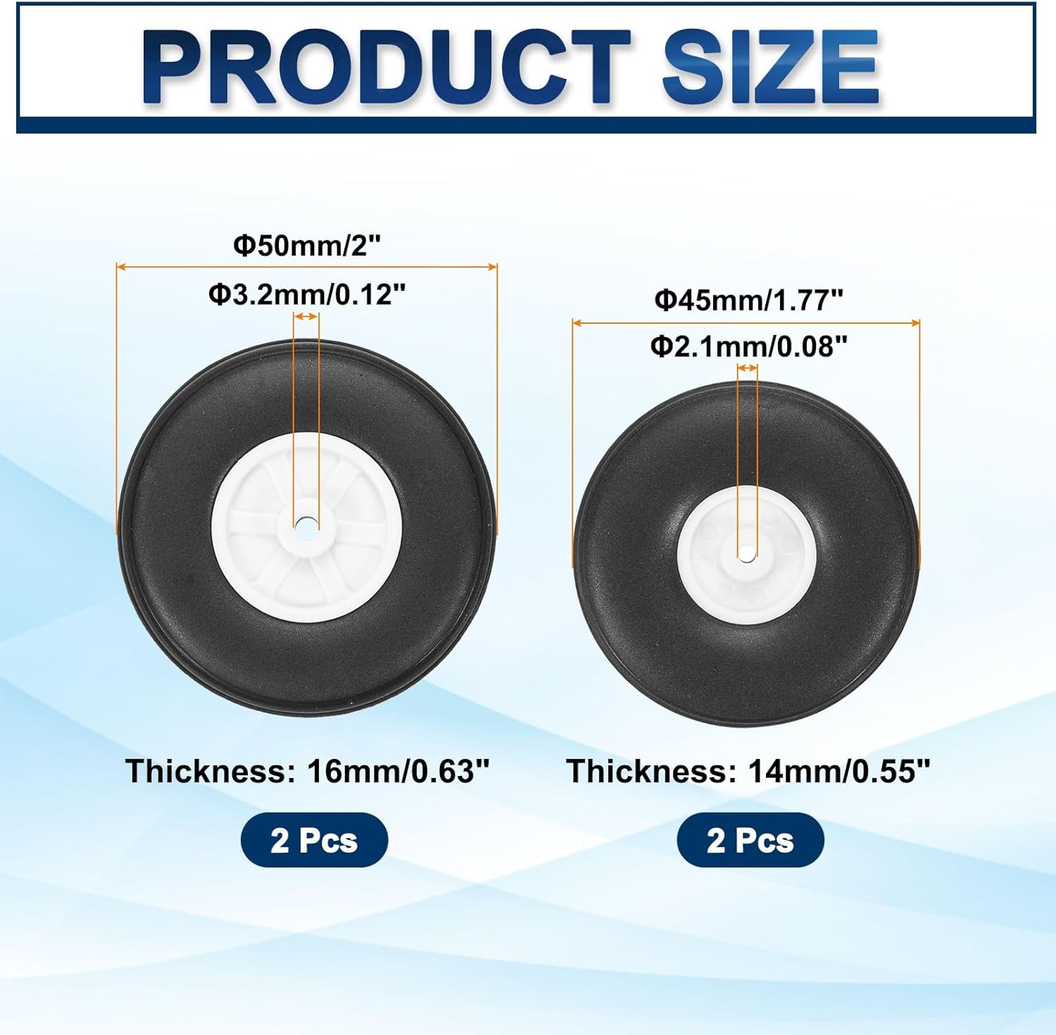 Queste ruote sono perfette per modelli di aeromobili RC, modelli RC fai da te, modelli di volantini interni e parchi, aerei RC, elicottero, auto e così via. RC modello aereo ruota aeromobile è in dimensioni di: Diametro esterno: 45mm/1.8 pollici, 50mm/2 pollici; Spessore: 14mm/0.6 pollici, 16mm/0.6 pollici; Asse Diametro foro: 2.1mm/0.08 pollici, 3.2mm/0.13 pollici; Colore: Nero, Bianco; Materiale: Gomma; Nella confezione di: 4 pezzi x RC Airplane ruote in gomma. (2 pezzi per ogni misura) 1. La sostituzione della ruota in schiuma è realizzata in gomma di buona qualità, ha una buona resistenza all'usura, è leggera, flessibile, non facile da deformare e facile da far volare il modello aereo. 2. I nostri modelli di ruote per aerei sono progettati in varie dimensioni, adatti a tutti i modelli di aeromobili, compresi i modelli elettrici, aggiungendo un look sportivo al tuo modello. Design semplice e pratico, facile da installare e utilizzare. Nota: la luce e le diverse configurazioni dei monitor potrebbero far sì che il colore dell'articolo nella foto risulti un po' diverso da quello reale.