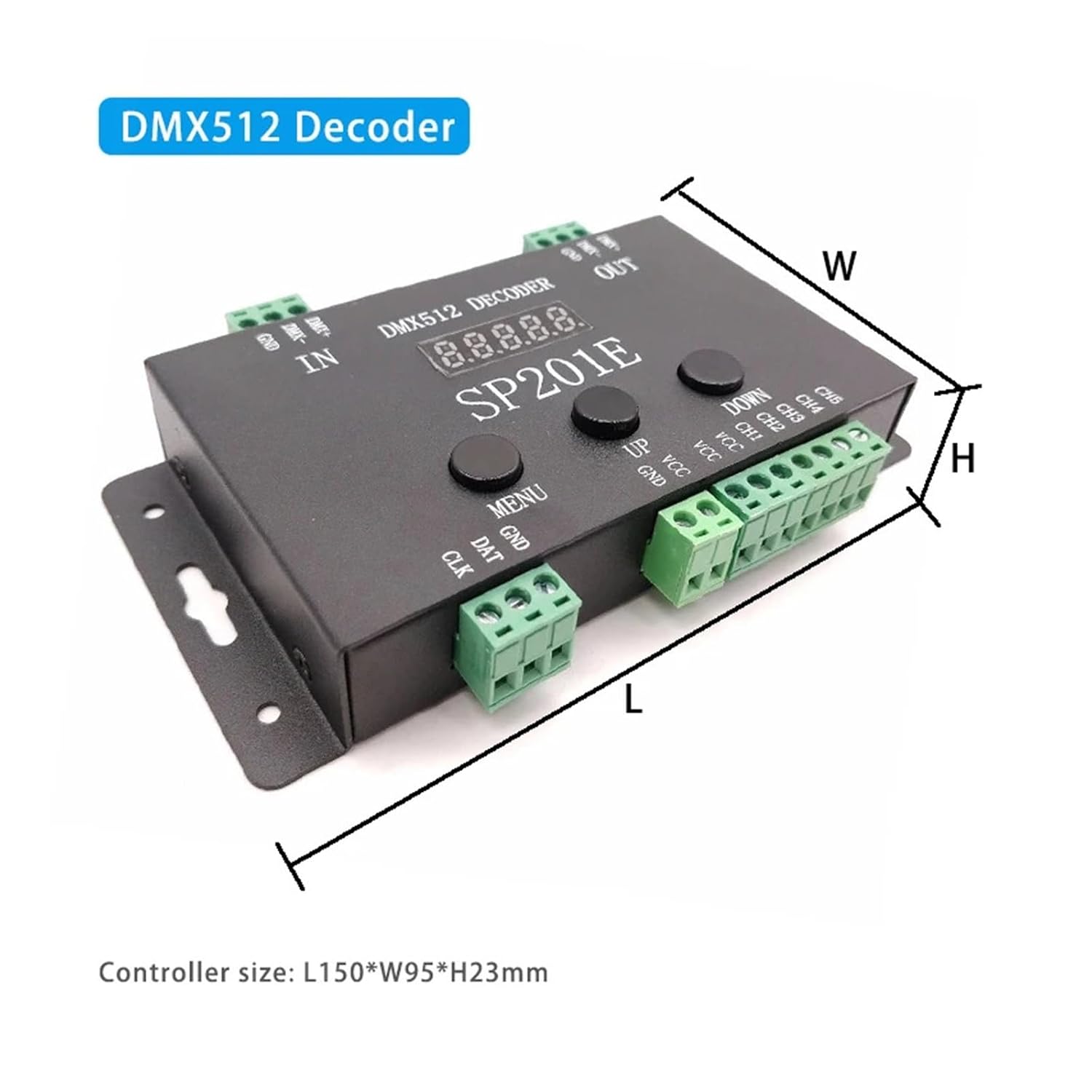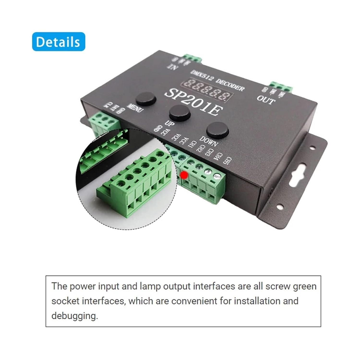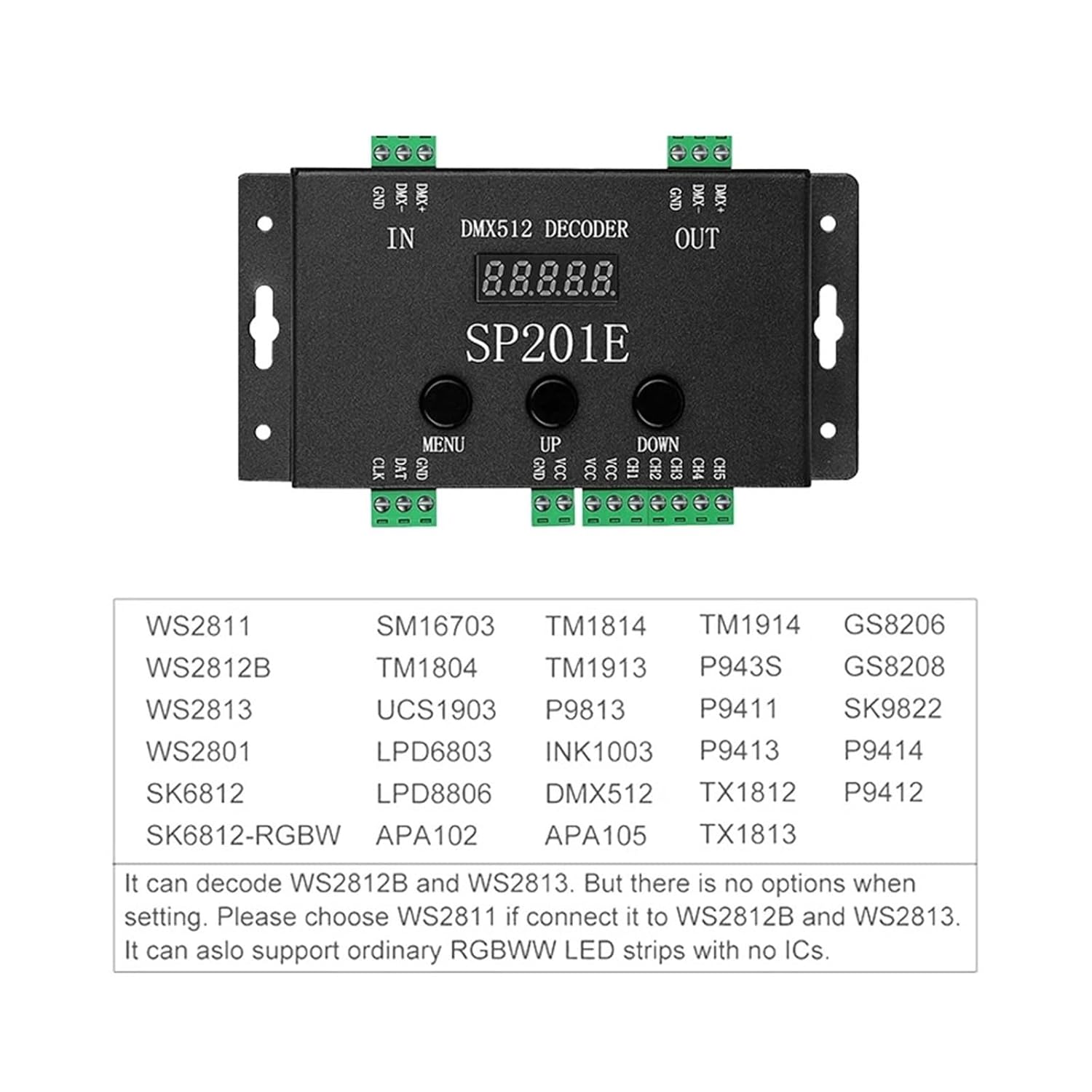 Componenti per l'illuminazione Specifiche del prodotto: Modello: decodificatore SP201E Magic DMX512 Tensione di alimentazione: DC5-24V Corrente di funzionamento: 24 mA ~ 110 mA Pixel controllabili: 1024 pixel Temperatura di lavoro: -20-60 ℃ Dimensioni del controller: 15*9,5*2,3 cm Dimensioni della scatola di imballaggio: 16 * 10 * 2,6 cm Peso netto: 270 grammi Peso lordo: 320 g Segnale di uscita: segnale SPI Norma DMX512: DMX512/1990 Effetti incorporati: 99 effetti pattern Metodo di controllo: controllo pulsante, controllo console 512 Supporto IC: supporta i comuni circuiti integrati driver LED sul mercato, come WS2811/WS2812B/WS2813/SK6812/LPD6803/LPD8806, ecc. lista imballaggio: 1 decodificatore SP201E 1 cacciavite 1 manuale utente