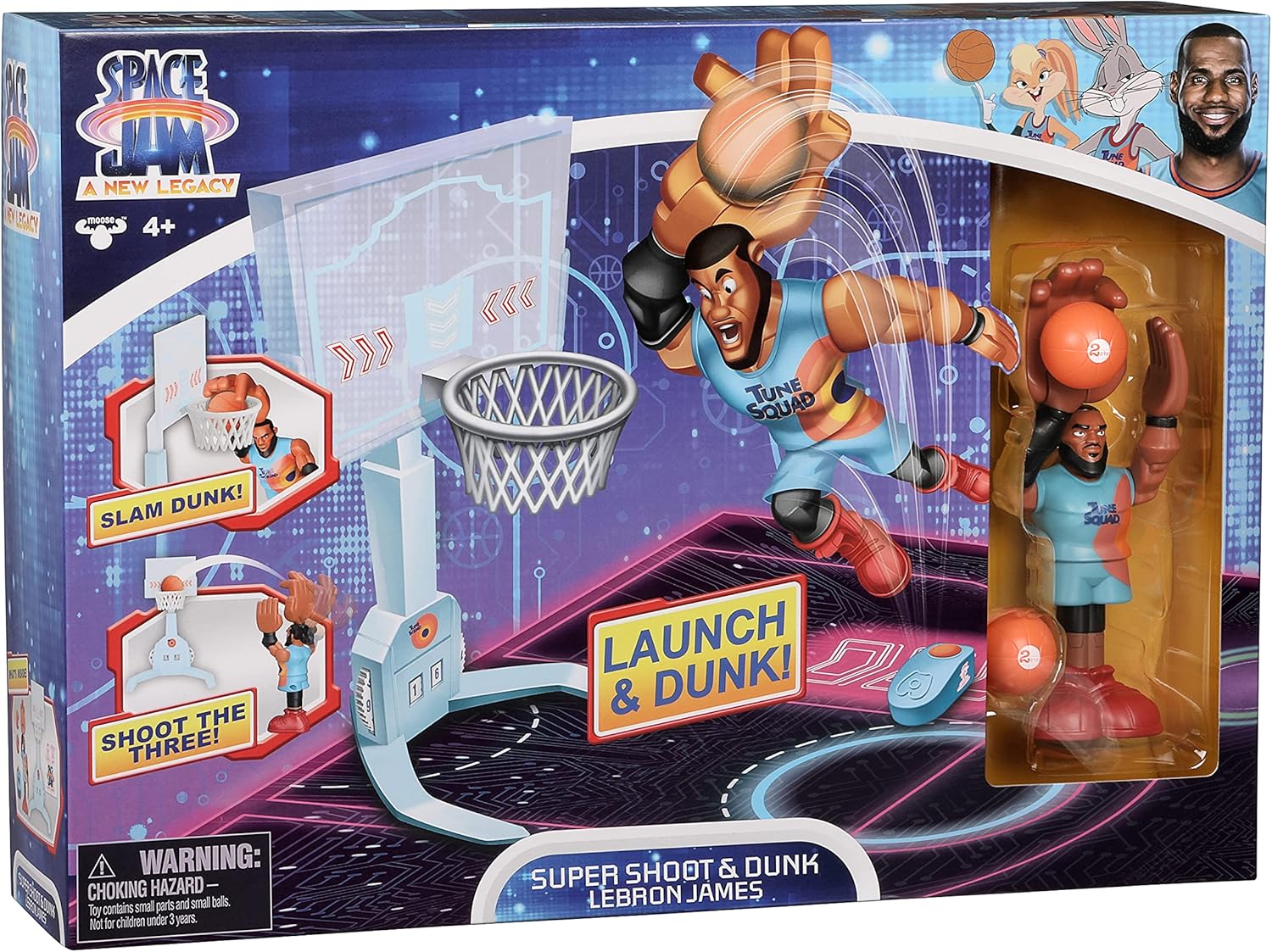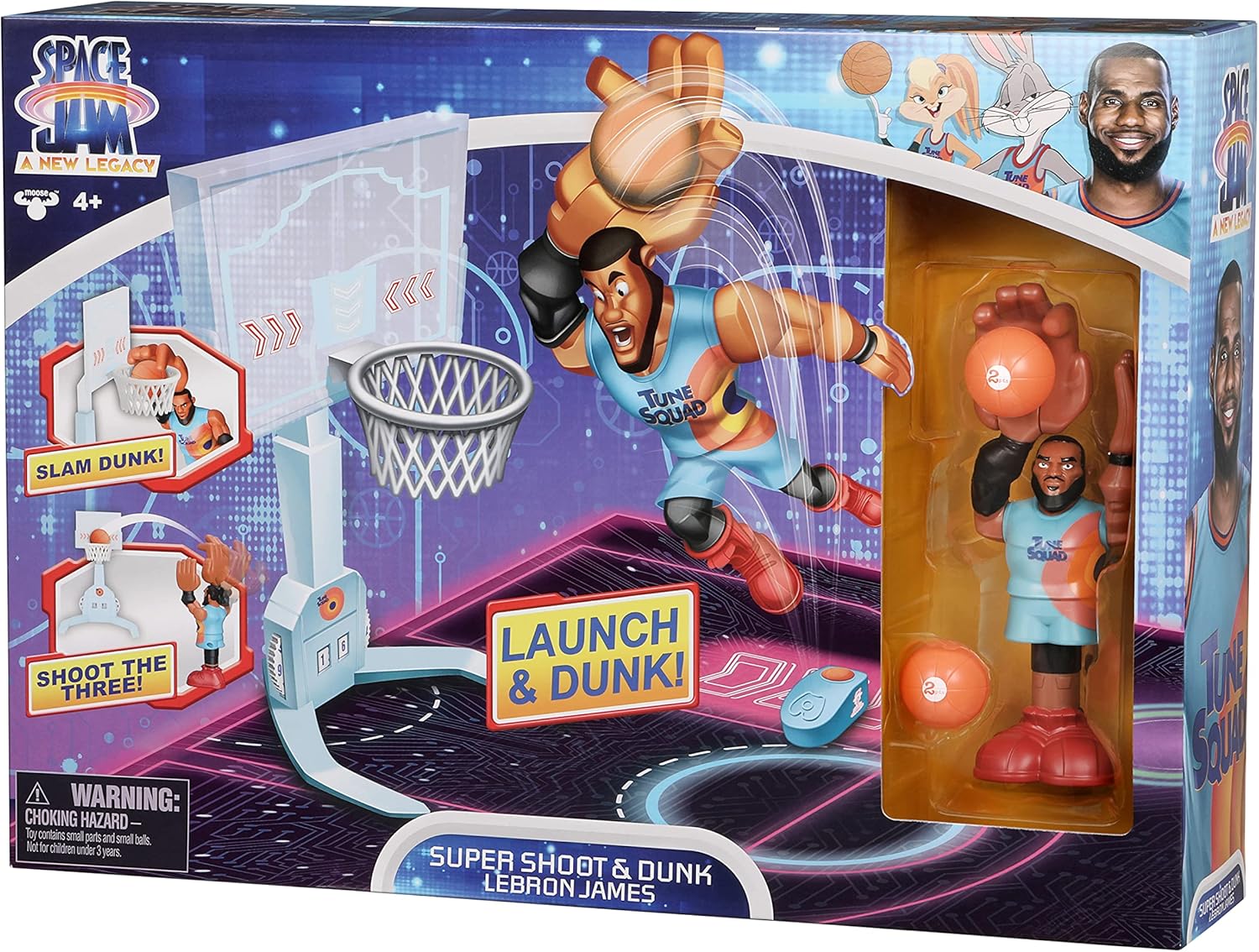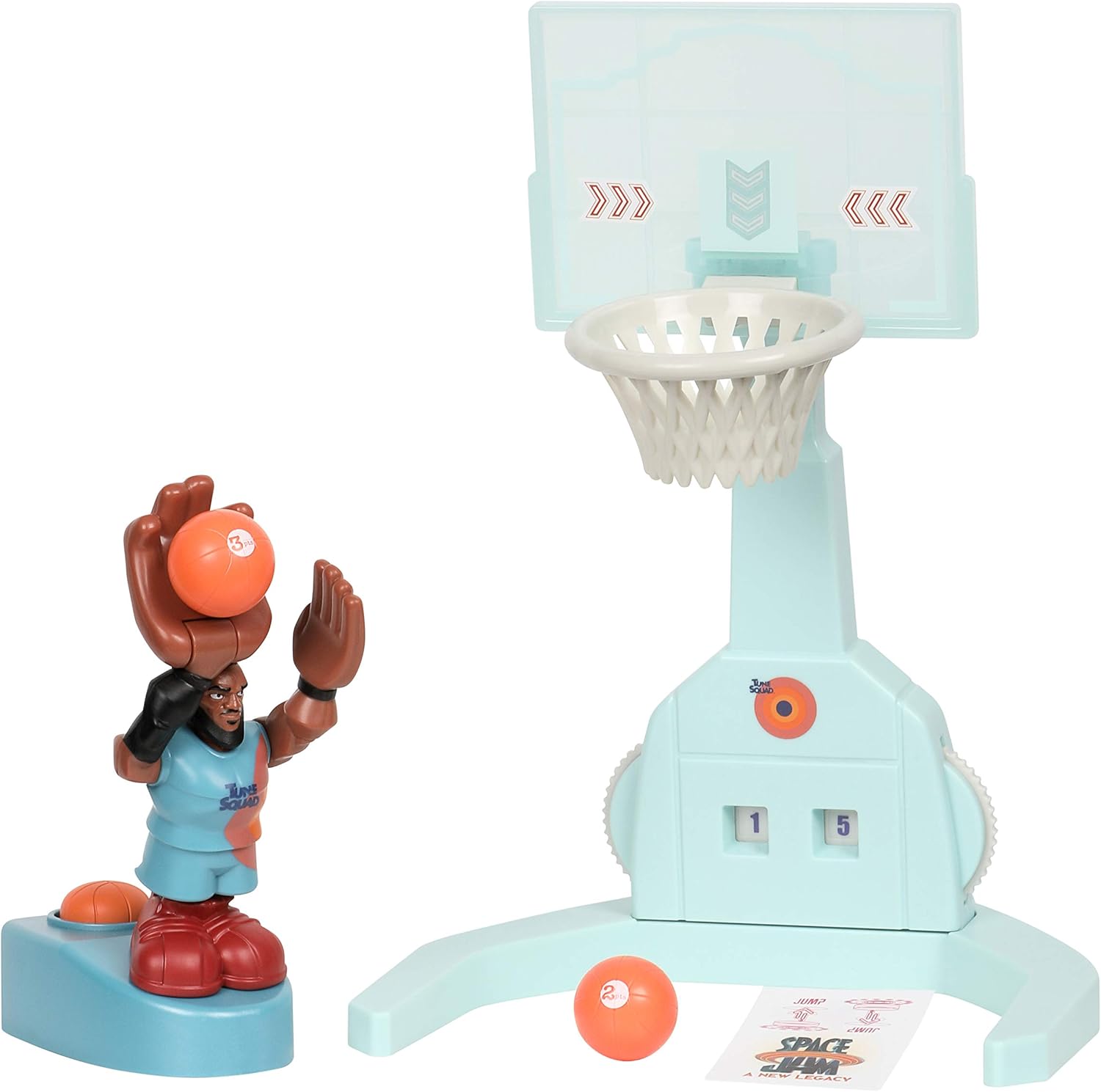 Porta il divertimento di Space Jam 2 direttamente a casa tua con il personaggio Super Shoot & Dunk LeBron James. Prova le tue abilità di basket con l'action figure LeBron James. Posiziona LeBron sulla piattaforma di avviamento e catapulta in aria. In questo modo può fare uno spettacolare slam Dunk! Basta mettere la palla in mano, tirarla indietro e poi lasciarla partire. È così facile ottenere un lancio a tre punti! Sfida i tuoi amici a un gioco emozionante e utilizza la ruota sotto il cestino per mantenere il punteggio esatto