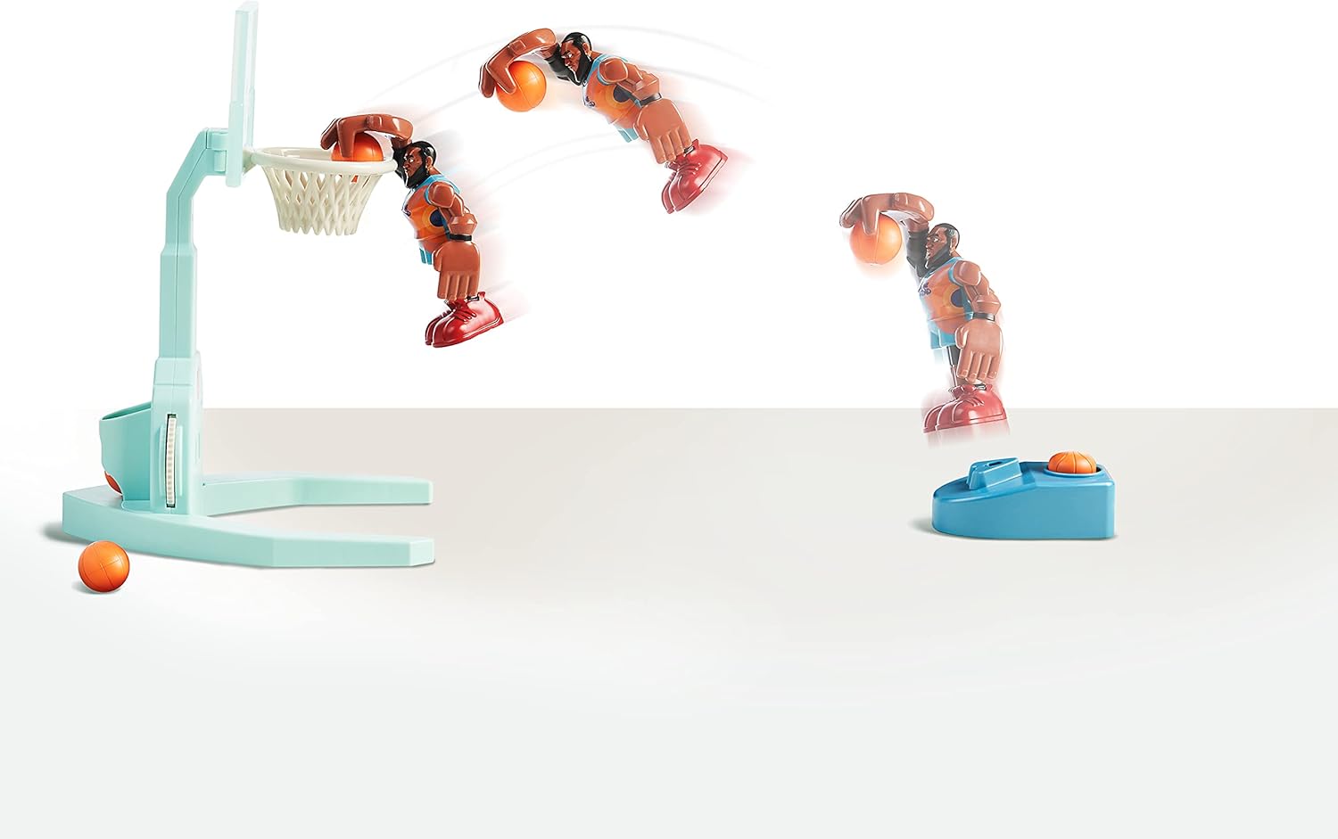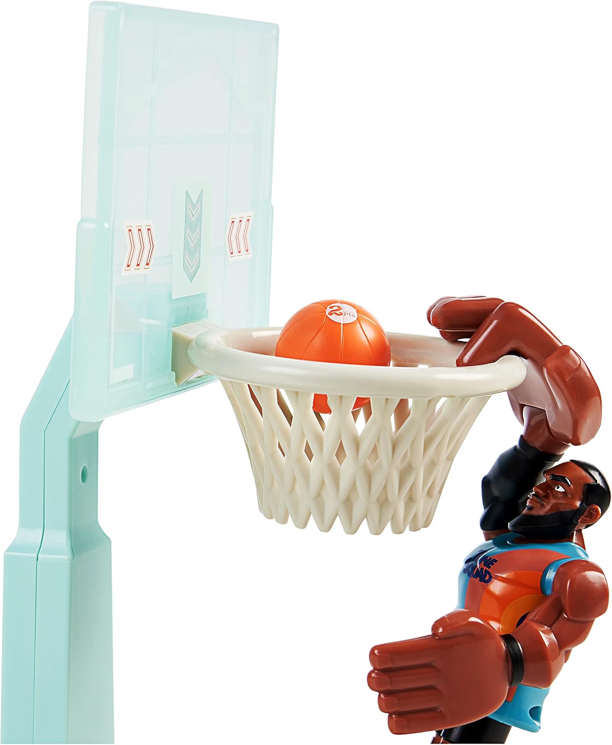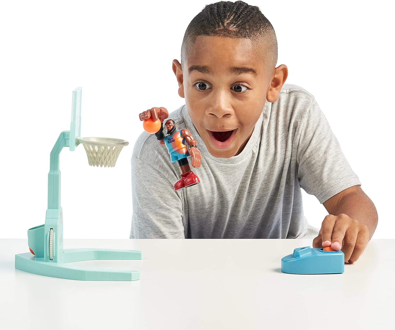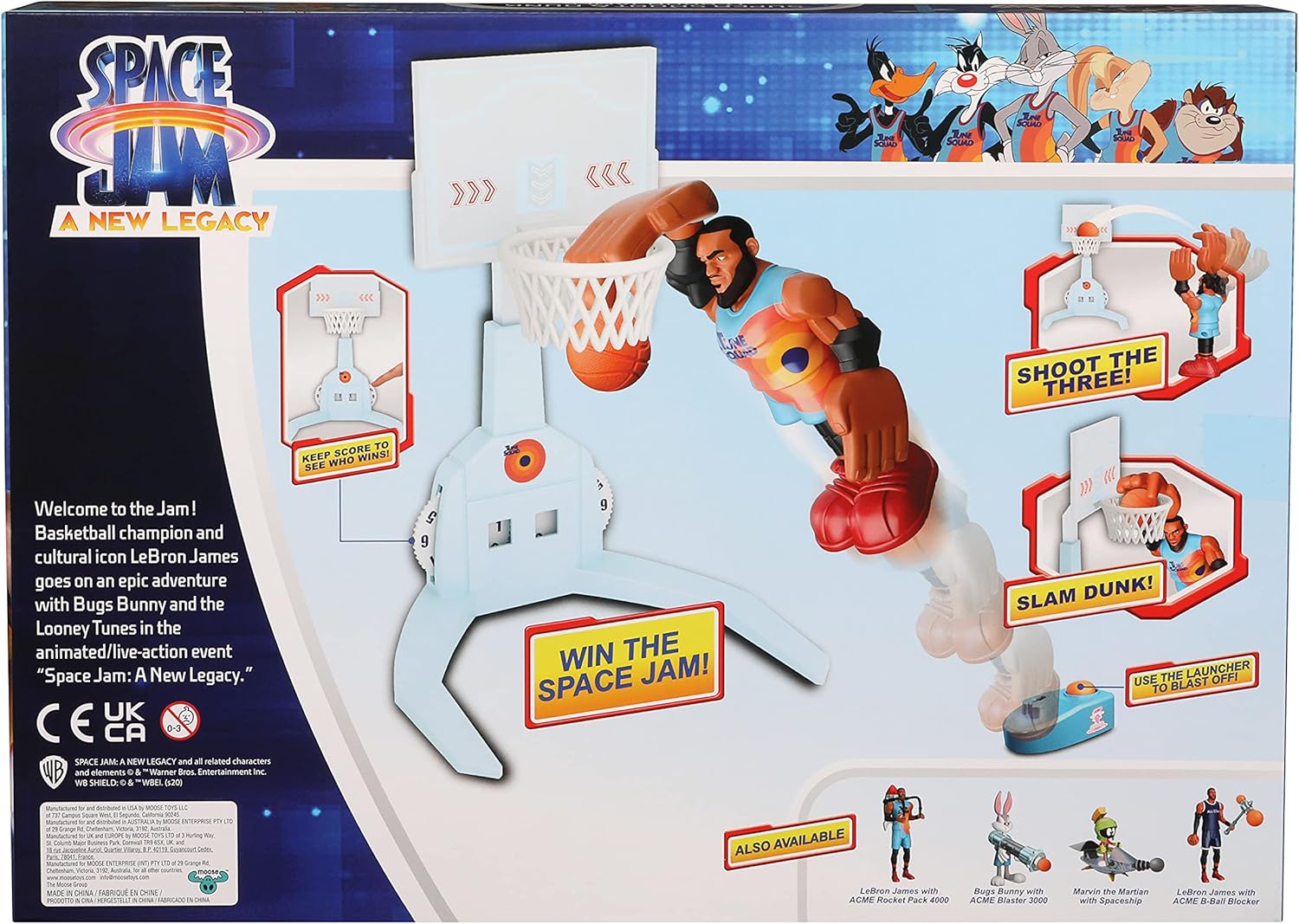 Porta il divertimento di Space Jam 2 direttamente a casa tua con il personaggio Super Shoot & Dunk LeBron James. Prova le tue abilità di basket con l'action figure LeBron James. Posiziona LeBron sulla piattaforma di avviamento e catapulta in aria. In questo modo può fare uno spettacolare slam Dunk! Basta mettere la palla in mano, tirarla indietro e poi lasciarla partire. È così facile ottenere un lancio a tre punti! Sfida i tuoi amici a un gioco emozionante e utilizza la ruota sotto il cestino per mantenere il punteggio esatto