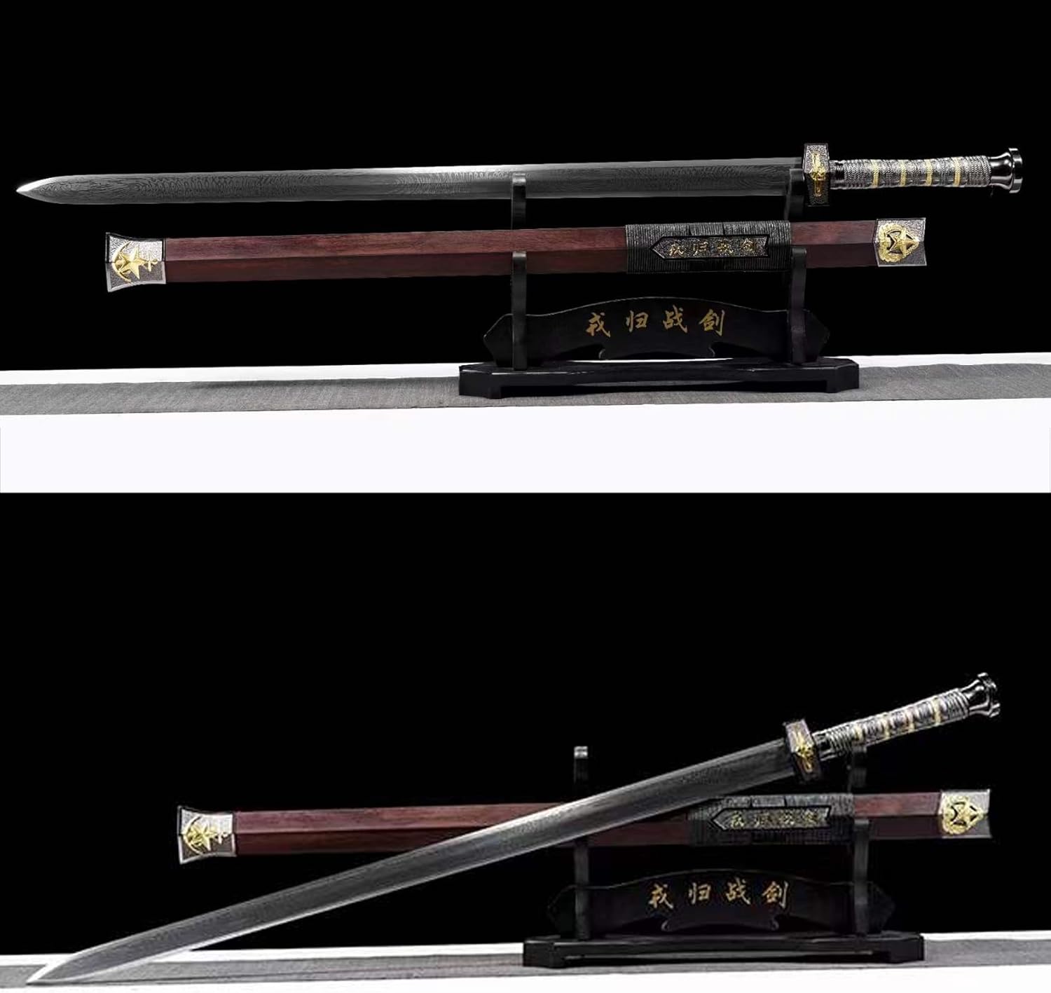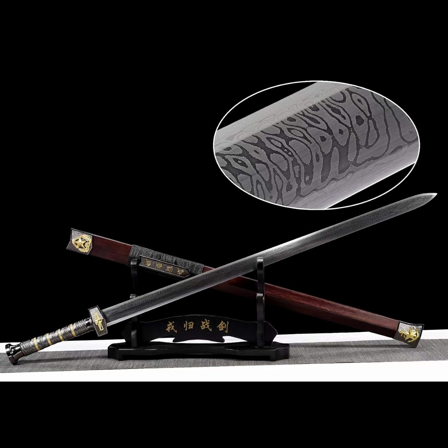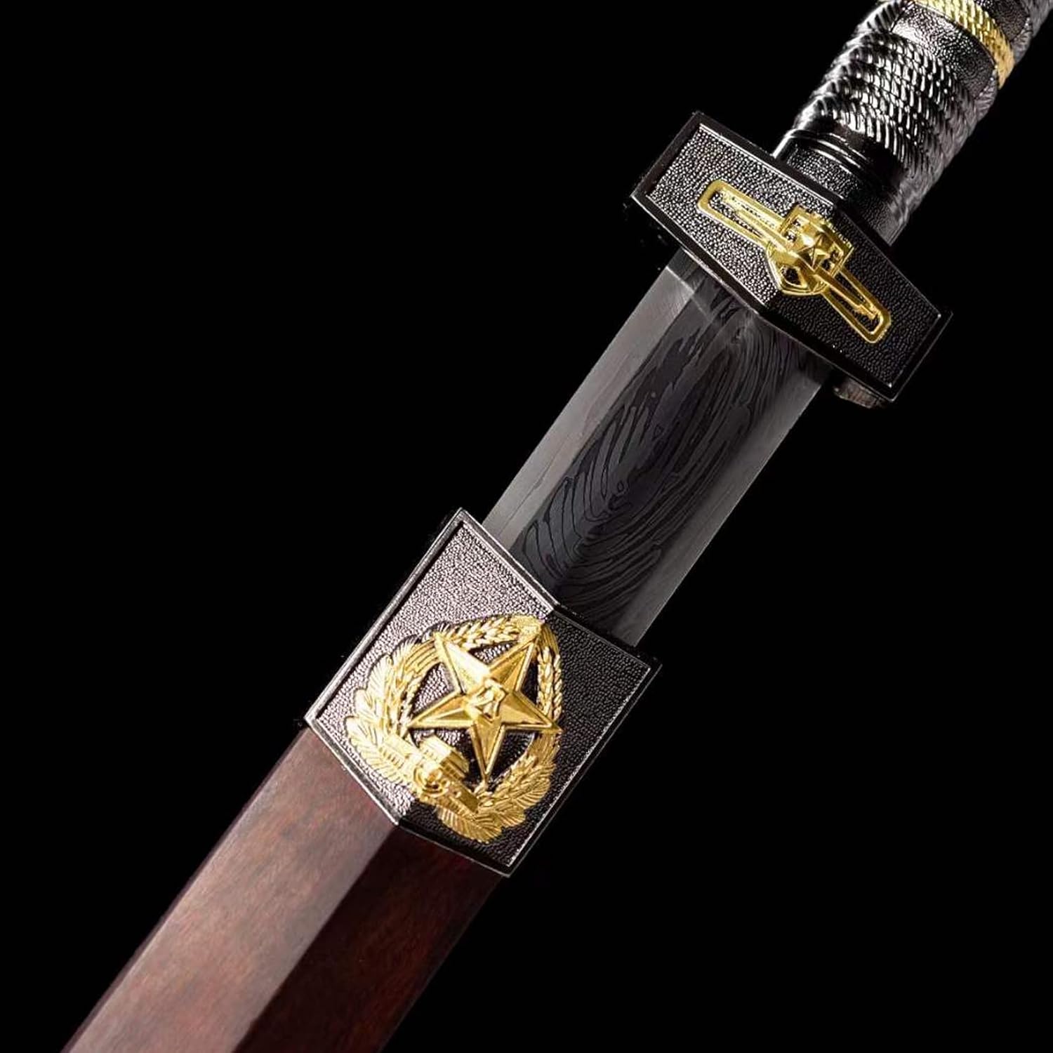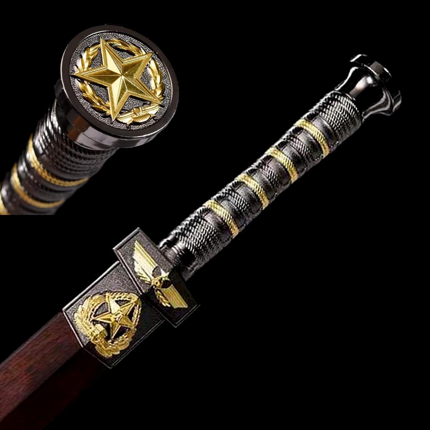 ▶ 【Artigianato squisito】: questa spada cinese della dinastia Han è forgiata in acciaio con motivo tradizionale ed è stata piegata e forgiata molte volte per formare un modello unico del pollice. Per realizzare e affilare la spada vengono utilizzati vari processi, conferendo alla lama una lucentezza e un colore unici, che riflettono la profonda eredità della tradizionale cultura della spada cinese. ▶ 【Materiale unico】: il corpo della spada è stato finemente lucidato per formare una lama a otto lati, che non solo migliora le effettive prestazioni di combattimento della spada ma ne aumenta anche l'estetica. Il fodero in legno di sandalo naturale del drago e della fenice è squisitamente realizzato e completa la lama della spada, mostrando il fascino dell'arte tradizionale cinese. ▶ 【Sezione aurea】: lunghezza totale 100 cm, lunghezza lama 78 cm, lunghezza impugnatura 19 cm, larghezza lama 3,7 cm, spessore lama 0,8 cm, peso ca. 1,85 chilogrammi. Le proporzioni perfette e il peso adeguato assicurano che la spada sia facile da brandire e comoda da impugnare. ▶ 【Uso multiplo】: questa spada dritta non è adatta solo per allenamenti o spettacoli di arti marziali, ma può anche essere regalata per mostrare il gusto unico e il patrimonio culturale del donatore. Allo stesso tempo, il suo aspetto raffinato e la sua lavorazione artigianale lo rendono anche una buona collezione e decorazione, adatta per il posizionamento nello studio o nel soggiorno. ▶ 【Valore culturale】: come portatore della cultura tradizionale cinese, questa spada da samurai trasporta ricche informazioni storiche e culturali ed è un ponte tra le persone moderne e l'antica civiltà. Non è solo un'opera d'arte o uno strumento pratico, ma anche un'espressione di emozioni e un patrimonio culturale.