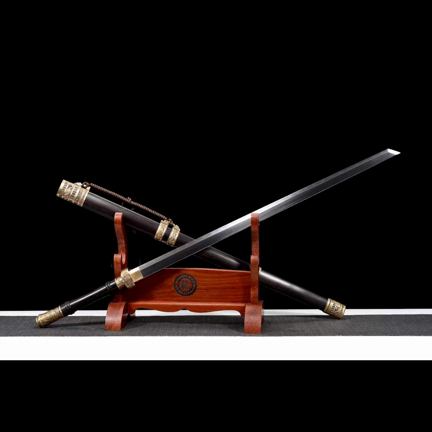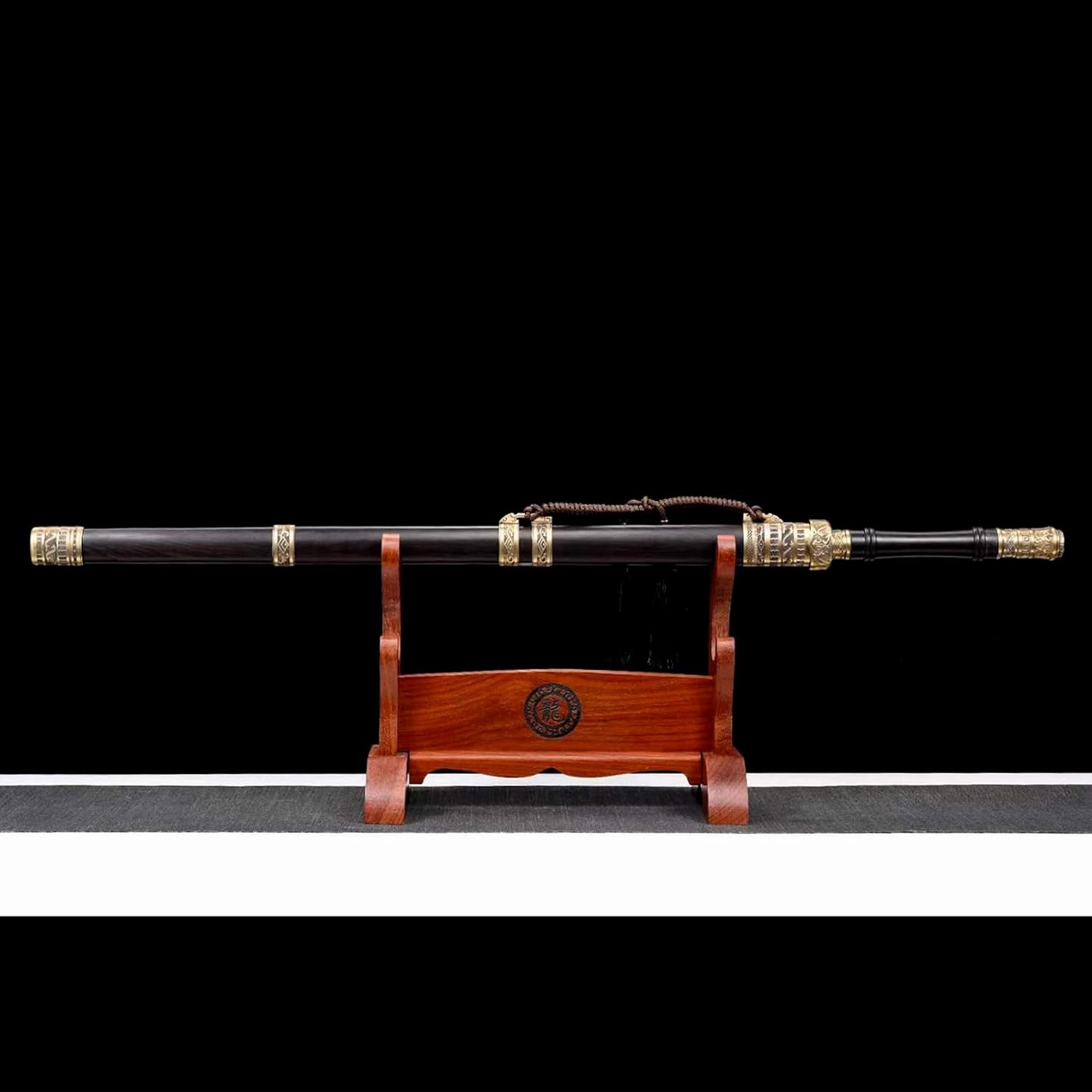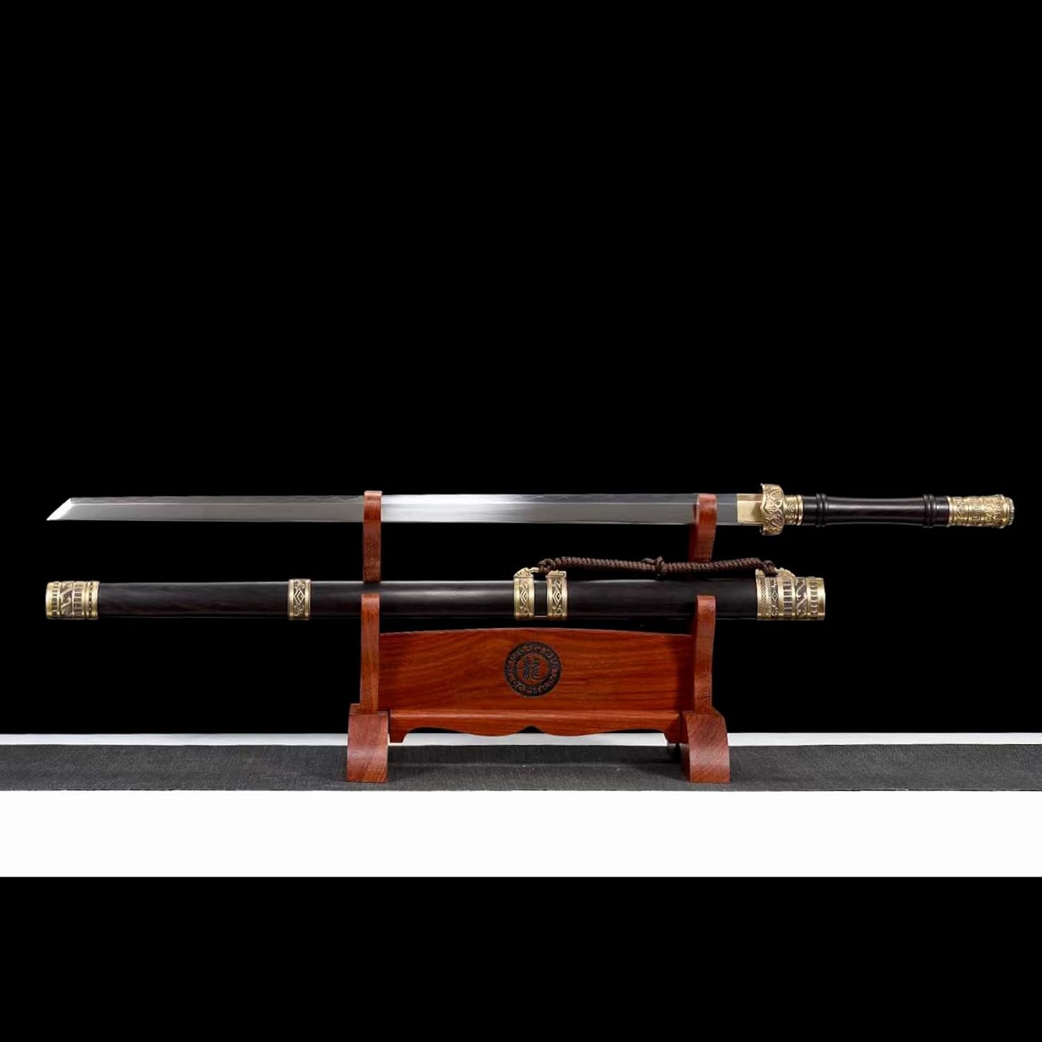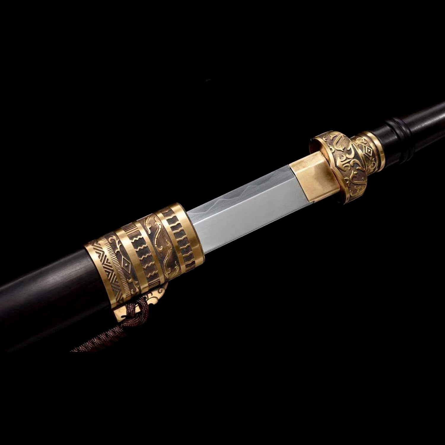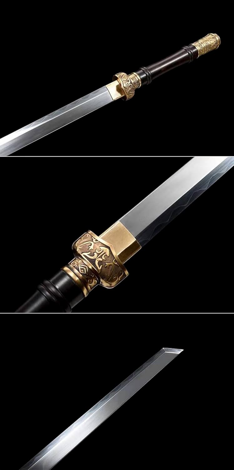 La lama è realizzata in acciaio T10 di alta qualità ed è stata sottoposta a molteplici trattamenti termici e processi di tempra per garantire che la lama sia robusta e durevole. Sia per l'uso quotidiano che per la raccolta a lungo termine, può mantenere la sua qualità e lucentezza originali. La spada viene fornita con un fodero in ebano per riporre in sicurezza la lama. Il fodero è decorato con delicate corde e metallo, conferendo alla spada un'estetica unica. Lunghezza totale: 104 cm, lunghezza lama: 70 cm, lunghezza manico: 21,5 cm, larghezza lama: 3,1 cm, spessore lama: 0,75 cm, peso: 1,82 kg. Le proporzioni perfette non solo rendono la spada più bella, ma ne garantiscono anche la praticità e la funzionalità.