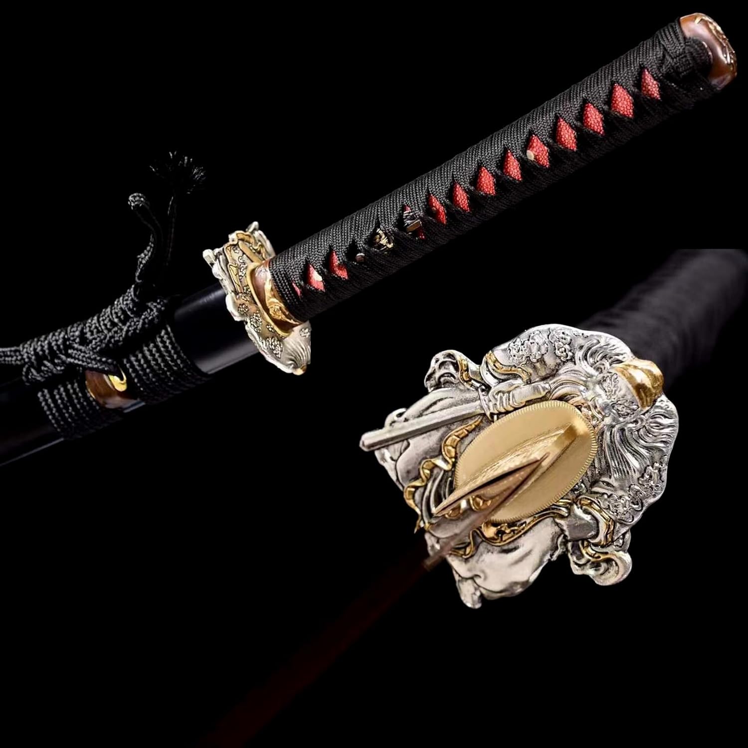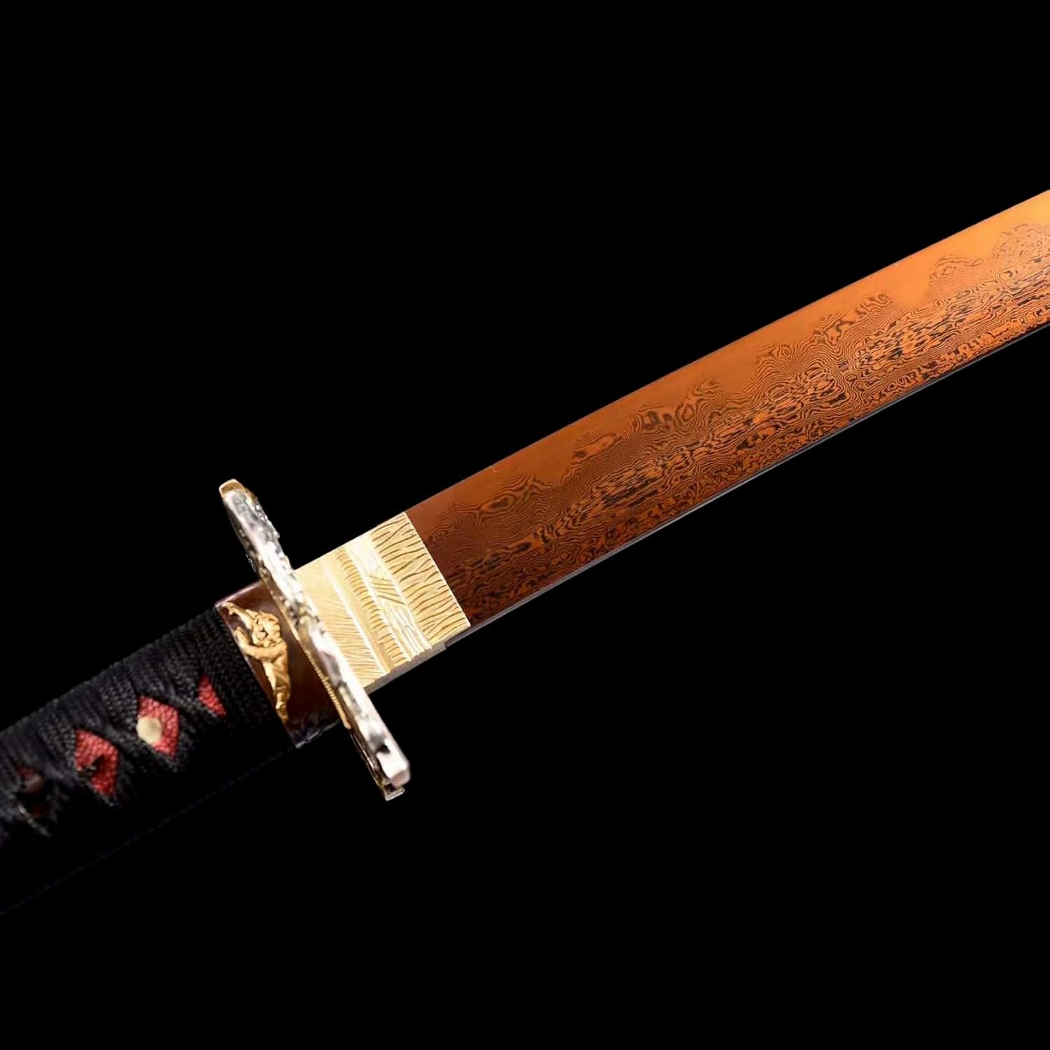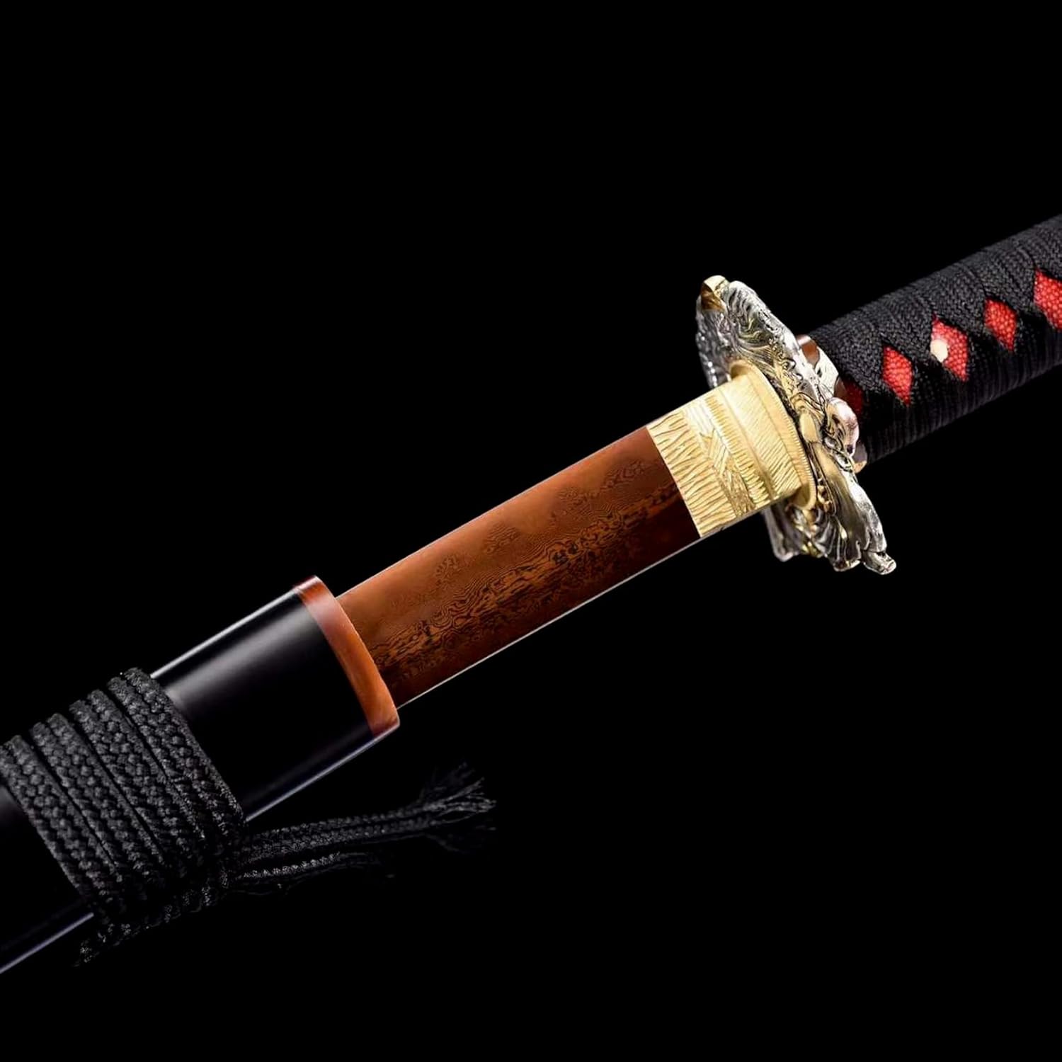 ღ Questa katana è il lavoro perfetto di un abile fabbro e quindi ha un bell'aspetto! Questa bellissima katana è perfetta anche da collezionare o regalare ai tuoi amici. ღ La lama è realizzata in acciaio modellato di alta qualità ed è forgiata utilizzando le tradizionali tecniche di forgiatura manuale. Dopo essere stato piegato e forgiato più volte, ha un modello bellissimo e unico, che garantisce anche la perfetta combinazione di durezza e tenacità. ღ La lunghezza totale è di 103 cm, la lunghezza della lama è di 71 cm, la lunghezza del manico è di 27 cm, la larghezza della lama è di 3,2 cm e il peso è di 1,54 kg. Le proporzioni sono cruciali per la progettazione delle armi. Le proporzioni perfette non solo rendono la katana più bella, ma ne garantiscono anche la praticità e la funzionalità. ღ Questa katana non è solo un'arma funzionale, ma anche una bellissima opera d'arte, perfetta da esporre. Il suo aspetto aerodinamico e la struttura elegante aggiungono un tocco di eleganza e raffinatezza alla tua casa o ufficio. ღ La katana viene fornita con un fodero in legno con un motivo unico e bellissimo dipinto a mano. Non solo protegge la lama da danni esterni, ma conferisce anche alla katana la sua bellezza unica.