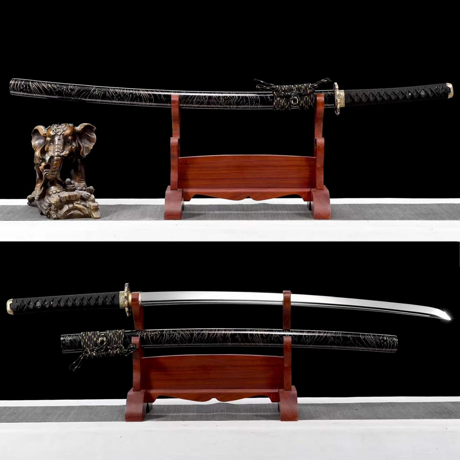 ⭐️【Realizzazione della lama】: questa katana è accuratamente forgiata in acciaio al manganese ad alte prestazioni, che ha una buona tenacità e può essere piegata di 90 gradi senza deformazioni. Ha anche una durezza fino a 60 gradi. La forgiatura a mano e la lucidatura a specchio conferiscono alla lama la sua straordinaria lucentezza e consistenza. ⭐️ 【Materiali selezionati】: il fodero abbinato della spada katana è realizzato in legno di alta qualità con vernice spray e motivi sulla superficie. Non è solo bello ed elegante, ma protegge anche efficacemente la lama. L'impugnatura è caricata a mano e avvolta con una corda di cotone, che è antiscivolo e assorbe il sudore, bella e resistente all'usura e si sente a proprio agio nella mano. ⭐️ 【Dimensione esatta】: la lunghezza totale della katana è di 103 cm, la lunghezza della lama è di 71 cm, la lunghezza del manico è di 26,5 cm e la larghezza della lama è di 3,2 cm. Questo design non solo garantisce comfort e flessibilità, ma tiene conto anche dell'armonia visiva. ⭐️【Combinazione di tradizione e modernità】: Sebbene questa katana erediti l'essenza della tradizionale cultura samurai giapponese, contiene anche elementi innovativi della tecnologia e dell'artigianato moderni. Il processo di apertura della fessura del sangue conferisce anche un effetto visivo unico. ⭐️【Design multiuso】: questa katana non è adatta solo per l'allenamento professionale di kendo, ma anche per migliorare le abilità e la forma fisica. Che si tratti di un appassionato di arti marziali o di un collezionista dal gusto unico, è anche un'ottima scelta come regalo. Inoltre, può essere utilizzato anche per decorazioni, cosplay, mostre, celebrazioni di festival e altre occasioni.
