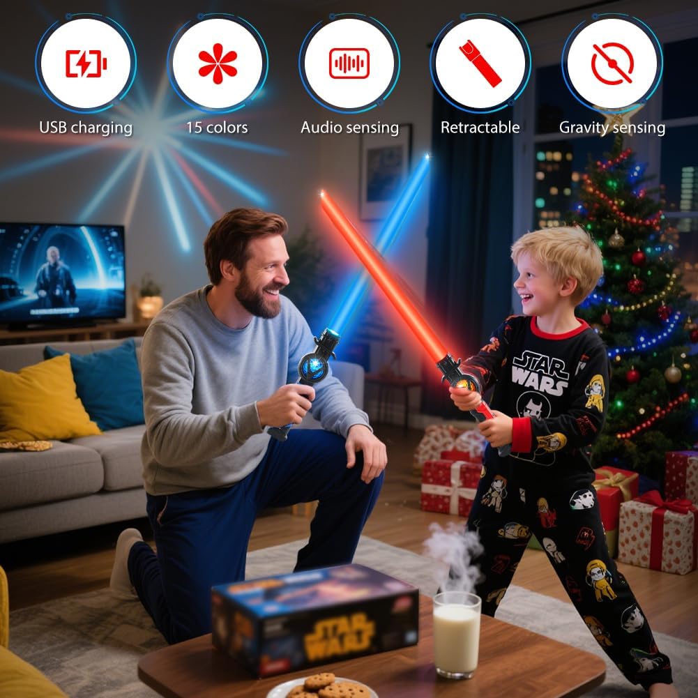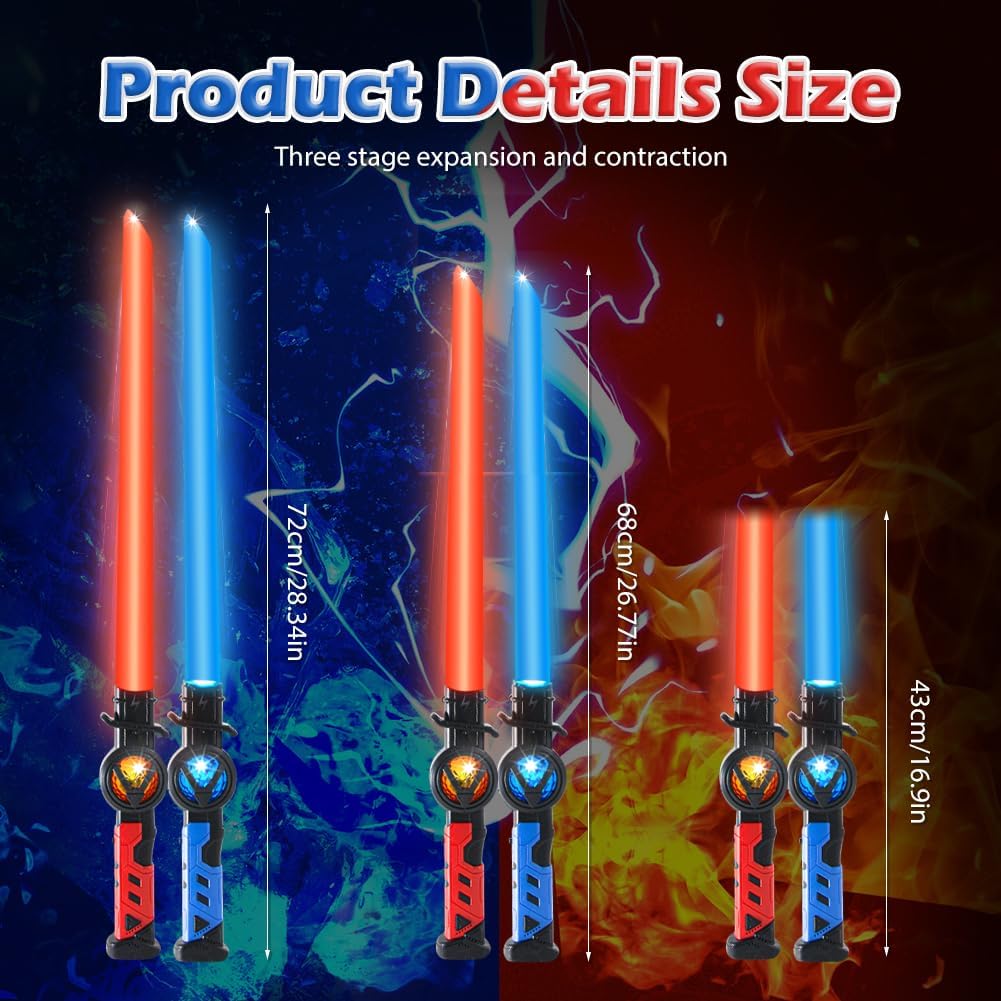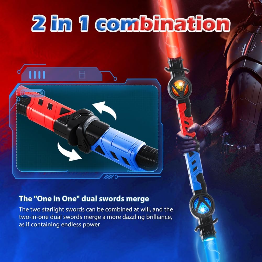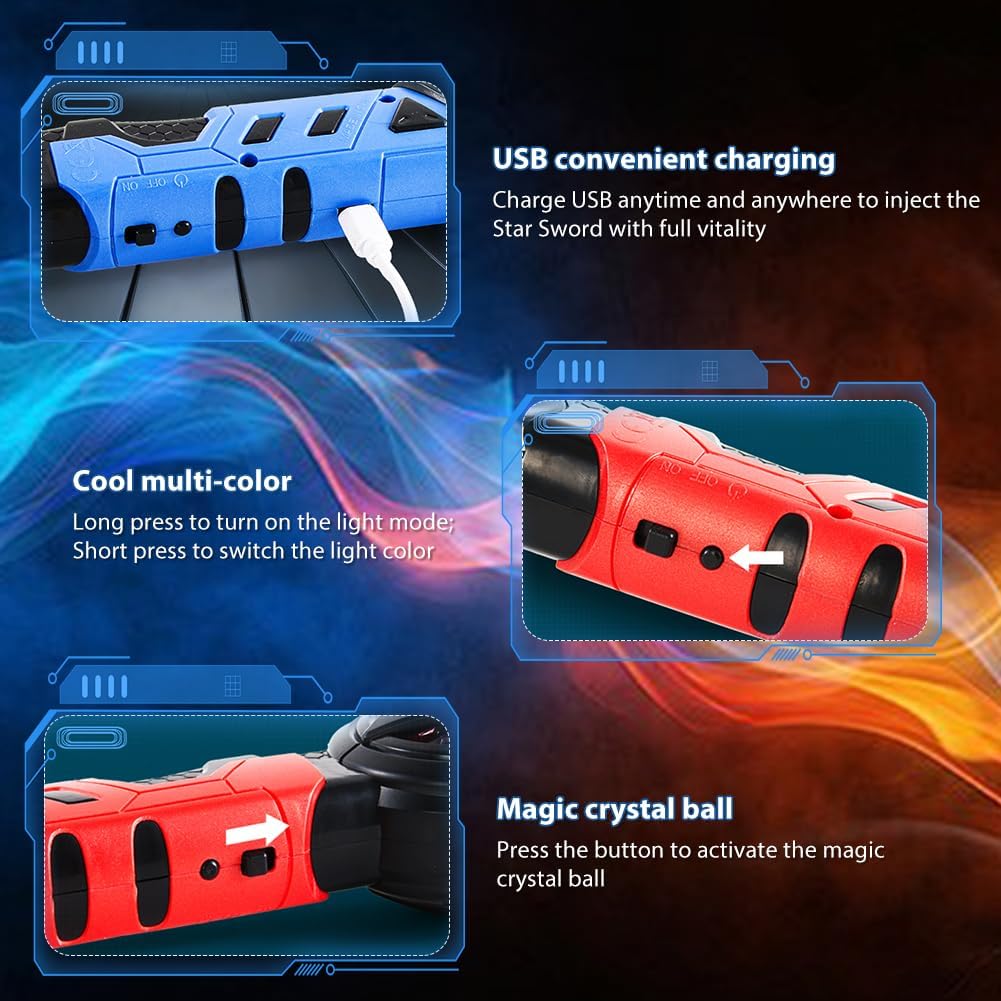 Spada laser con spada laser da 2 pezzi: questo è un nuovo set di combinazioni di spade laser per bambini, disponibile in rosso e blu. Il design della spada laser è stato ridisegnato per assomigliare a un coltello. Il prodotto è dotato di una batteria ricaricabile incorporata. Non è necessario inserire una batteria. Dopo aver acceso l'interruttore, il dispositivo può essere utilizzato immediatamente. È inoltre possibile illuminare sia la lama che l'impugnatura della spada laser. 15 colori RGB Variabili e ricaricabili: questo set di giocattoli luminosi a LED si caratterizza per la sua particolare qualità e funzionalità. All'interno della spada laser è installato un sistema LED che cambia colore. Quando la spada laser viene attivata, la parte bianca della lama, la pallina sull'impugnatura e il logo del fulmine si illuminano. Ci sono 15 colori tra cui scegliere per il gioco di ruolo, tra cui rosso, giallo, blu e verde. Gli effetti sonori di combattimento realistici garantiscono un'esperienza di gioco coinvolgente. Spada laser facile da giocare: premi il pulsante di accensione sull'impugnatura per attivare la sfera luminosa. Si consiglia di tenere premuto il pulsante dell'interruttore per tre secondi. Di conseguenza, la spada laser viene immediatamente illuminata. Va notato che il pulsante di accensione e l'interruttore sono indipendenti l'uno dall'altro e devono essere premuti in sequenza. Si segnala che in caso di luminosità LED della spada laser insufficiente o assente è necessaria la ricarica immediata della batteria. Design retrattile: la spada laser è realizzata in plastica con una superficie liscia e senza sbavature. Il prodotto si caratterizza per la sua leggerezza e maneggevolezza ed è estremamente robusto, anche durante un uso intensivo. Il prodotto è retrattile e con un semplice movimento la spada laser può essere facilmente estesa da 6,6 pollici a 10,6 pollici. Utilizzando il connettore incluso, è possibile combinare le due spade laser in una spada lunga 21 pollici. Regali per feste a tema per bambini: colpisce per il suo design innovativo, le sue funzioni interessanti e la sua facilità d'uso. È ideale per feste cosplay, feste di compleanno, feste in costume o feste a tema guerrieri galattici. Attraverso l'uso di luci ed effetti sonori, i bambini possono interpretare i ruoli dei loro film o serie TV preferiti, impegnarsi in emozionanti battaglie simulate e godersi piacevoli momenti di svago.