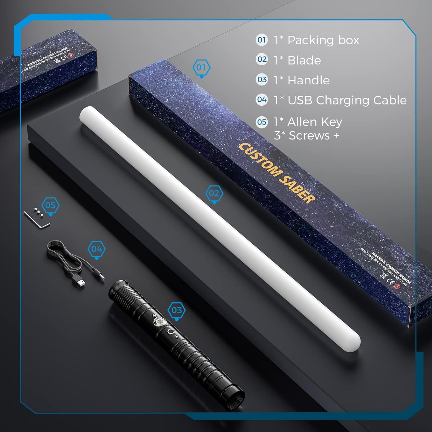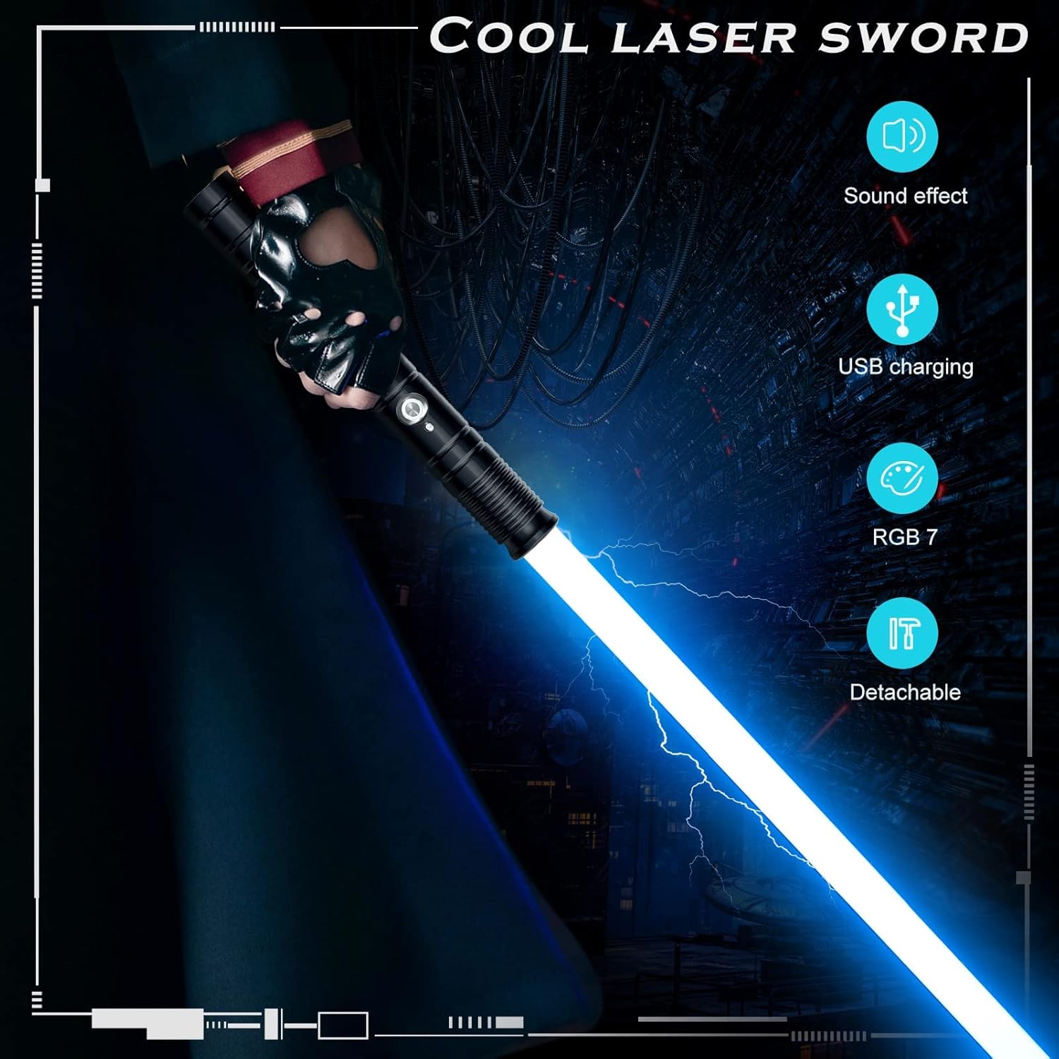 1. Der Metallgriff des Lichtschwerts besteht aus einer haltbaren Aluminiumlegierung und oxidiert nicht leicht. Die Klinge besteht aus umweltfreundlichem PC-Material, das robusto und langlebig ist. 2. FX-Lichtschwerter können 7 Farben und beeindruckende Soundeffekte haben, um sich an verschiedene Szenen und Kampfatmosphären anzupassen. Gleichzeitig ermöglicht der verbesserte V10-Chip dem Lichtschwert, die Lichtfarbe mit dem Schwung der Klinge zu ändern. 3. Das Lichtschwert verfügt über eine eingebaute wiederaufladbare Lithiumbatterie mit 1500 mAh und ist mit einem Ladekabel ausgestattet. Die Eingangsleistung beträgt 5 V/1 A und nach 3 Stunden Ladezeit kann es 4 Stunden lang gespielt werden. 4. Das Lichtschwert ist für Kinder und Erwachsene geeignet, auch für Comic Con, Themenveranstaltungen, Weihnachten, Halloween, Karneval, Warteschlangen und jede Szene, die Sie verwenden möchten. Auch das beste Geschenk für Filmliebhaber.