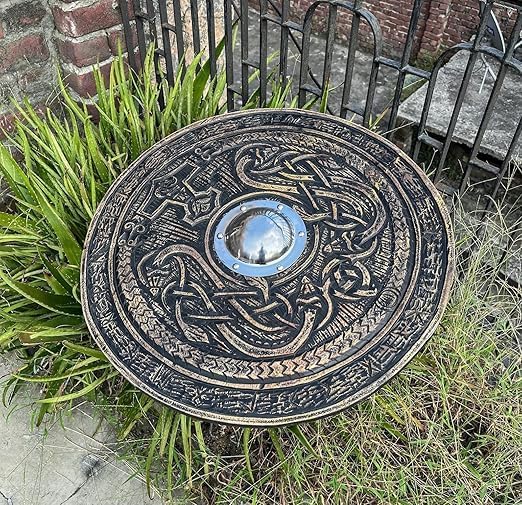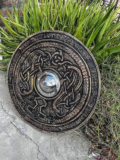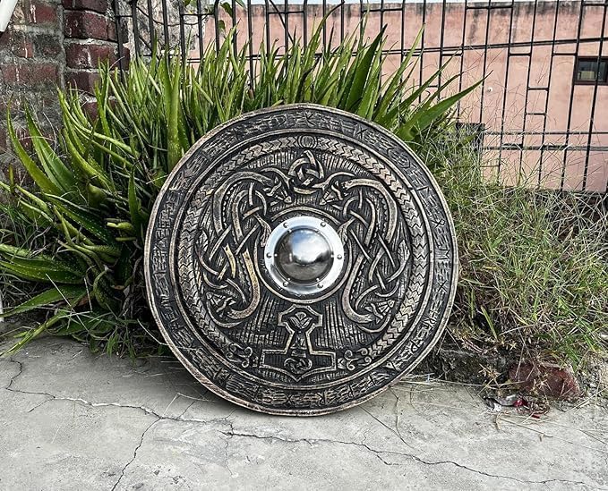 Design autentico: scudo rotondo in legno realizzato a mano da 61 cm con intricati motivi a nodo norreno e un design centrale a martello di Thor per una precisione storica Costruzione: base in legno resistente con boss centrale metallico e superficie intagliata dettagliata rifinita in bronzo antico per un look autentico e stagionato Pronto per essere esposto: perfetto per il montaggio a parete, rievocazioni storiche o come un sorprendente pezzo decorativo con i suoi impressionanti motivi celtici e vichinghi Artigianato dettagliato: presenta elaborati motivi a nodo celtico, iscrizioni runiche e opere d'arte tradizionali norrene intorno alla circonferenza dello scudo Specifiche: scudo di diametro 61 cm con centro in metallo, dimensioni ideali sia per uso pratico che per scopi espositivi