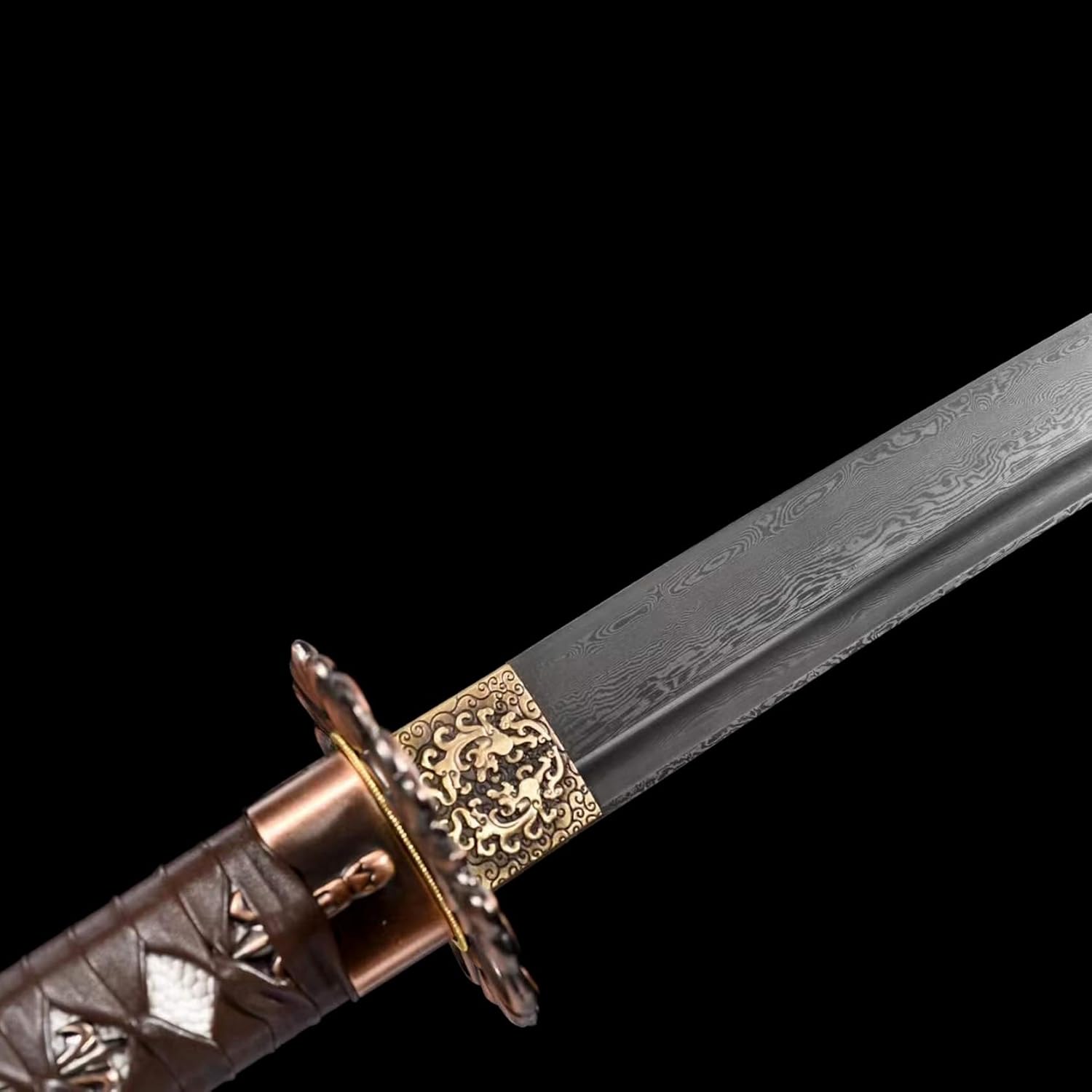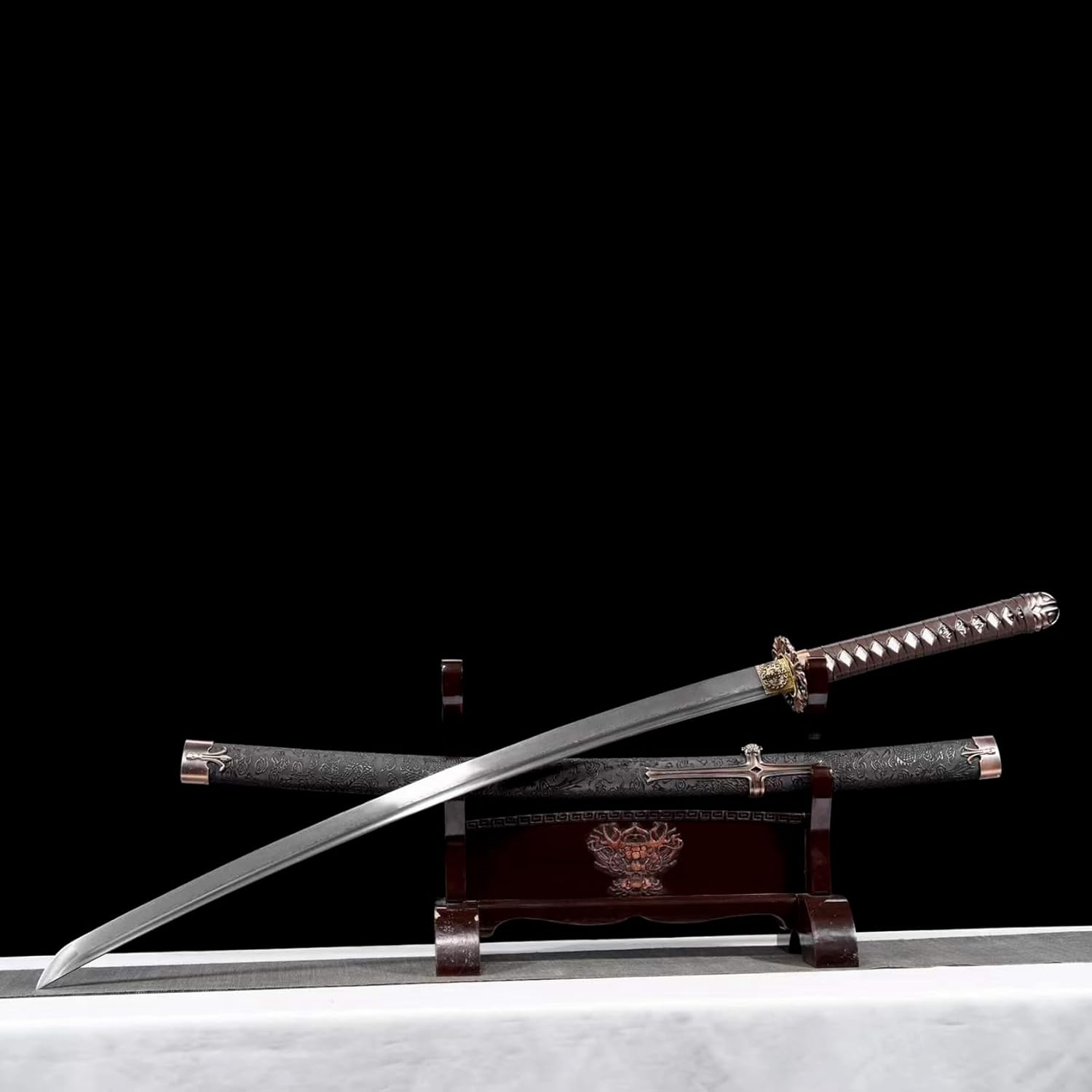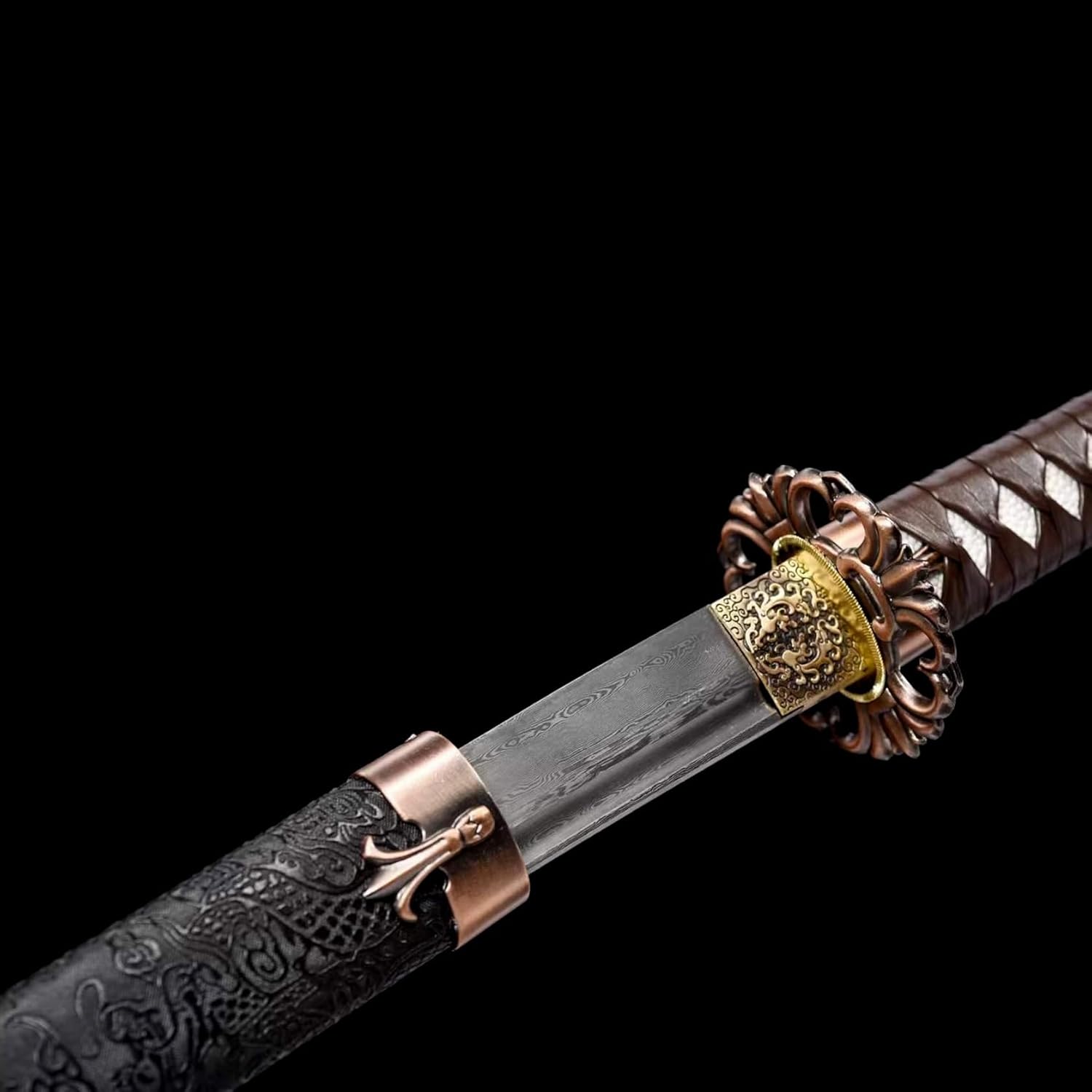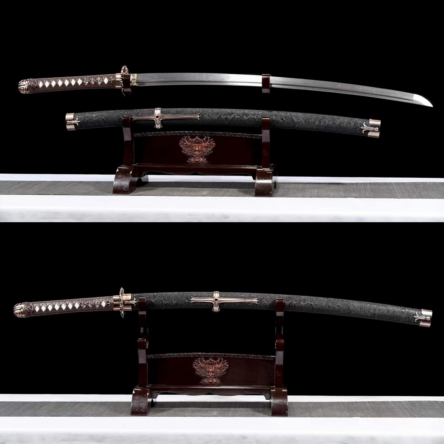 【Buona maestria】: la spada katana utilizza la tradizionale tecnologia di forgiatura e il processo di forgiatura segue rigorosamente metodi antichi. La lama è stata sottoposta a molteplici trattamenti termici e processi di tempra per garantire che la lama sia resistente e durevole. Sia per l'uso quotidiano che per la raccolta a lungo termine, può mantenere la sua qualità e lucentezza originali. 【Buone prestazioni】: la lama di questo coltello è forgiata a mano e mostra una lavorazione squisita che non ha eguali nel settore. La sua lama affilata taglia l'aria senza sforzo, rendendola perfetta per la pratica della spada o l'allenamento nelle arti marziali. L'impugnatura è progettata ergonomicamente per fornire una presa comoda e sicura per un controllo facile e agevole. 【Buon materiale】 La spada katana è realizzata in acciaio modellato di alta qualità. Dopo aver piegato e forgiato più volte, la lama mostra un modello unico. Il bellissimo fodero è realizzato in legno naturale, avvolto in pelle e decorato con squisite decorazioni in metallo, che ne evidenziano il nobile temperamento. 【Buone dimensioni】: lunghezza totale 104,5 cm, lunghezza del corpo 72 cm, lunghezza dell'impugnatura 27,5 cm, larghezza 3,2 cm, spessore 0,7 cm, questa katana è la combinazione perfetta di eleganza e potenza, adatta sia agli appassionati di arti marziali che ai collezionisti. Ottieni soddisfazione da esso. 【Ampia gamma di usi】: questo coltello non è solo un'arma pratica, ma anche una bellissima opera d'arte perfetta da esporre. Che si tratti di appassionati di arti marziali che cercano la massima esperienza nella pratica del combattimento reale o di collezionisti che cercano arte squisita, questa katana può soddisfare le tue esigenze.