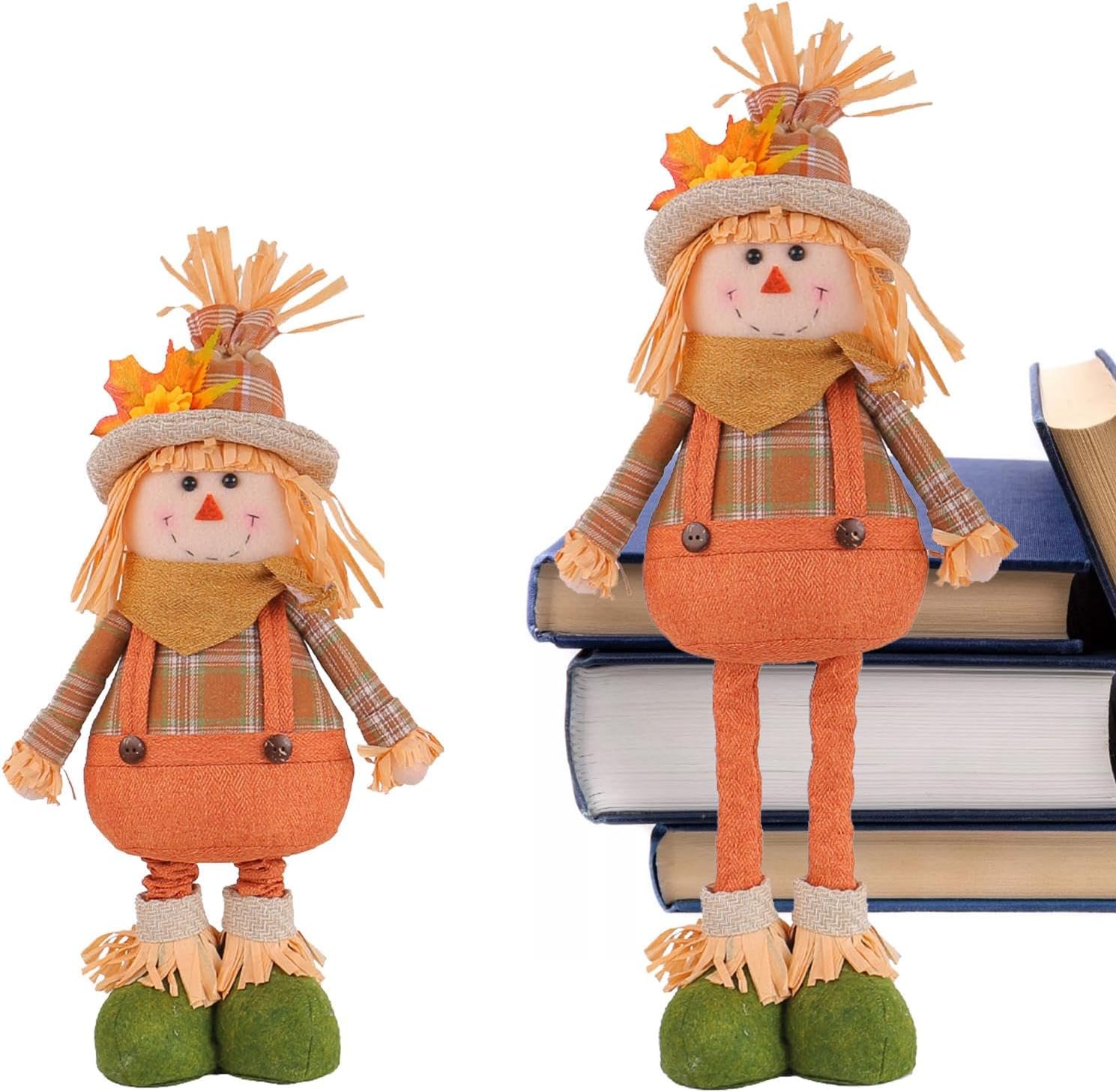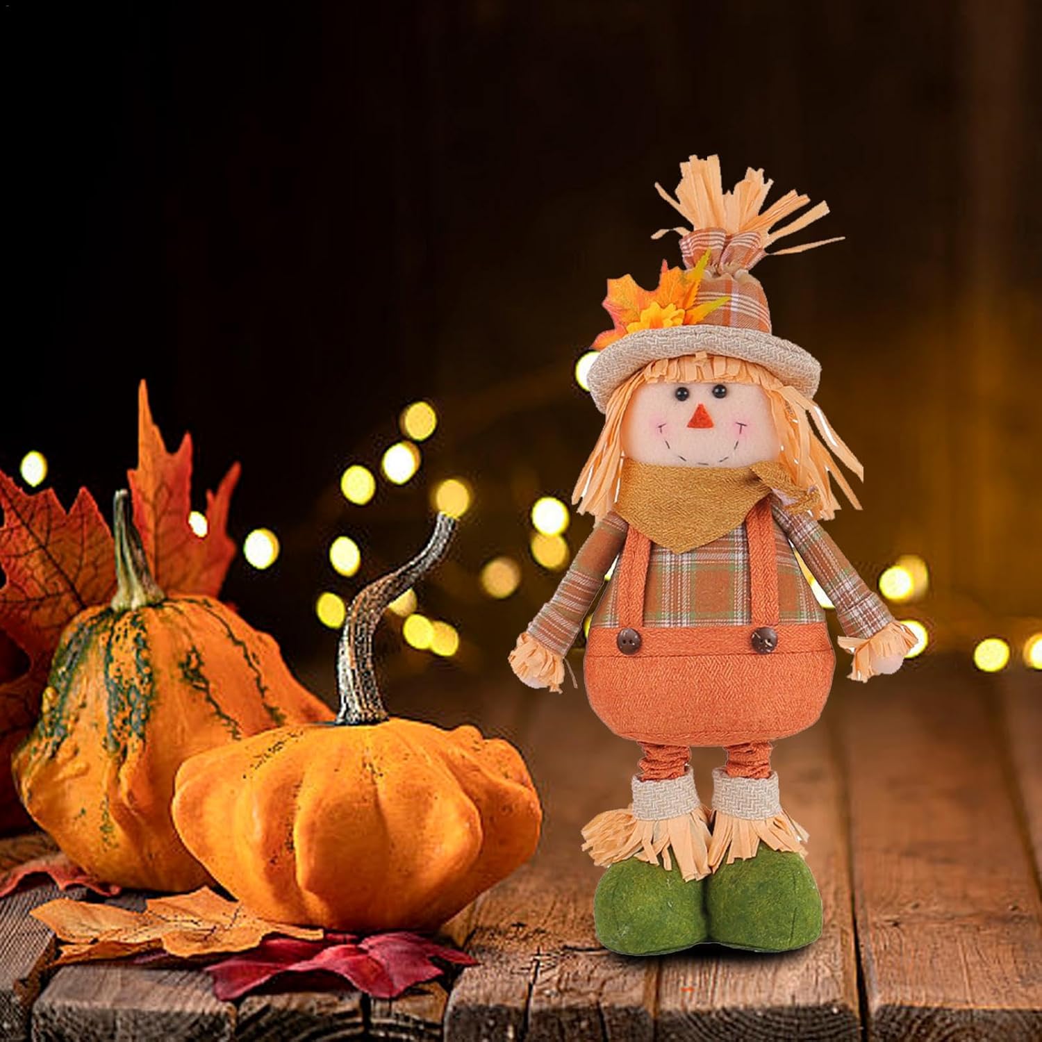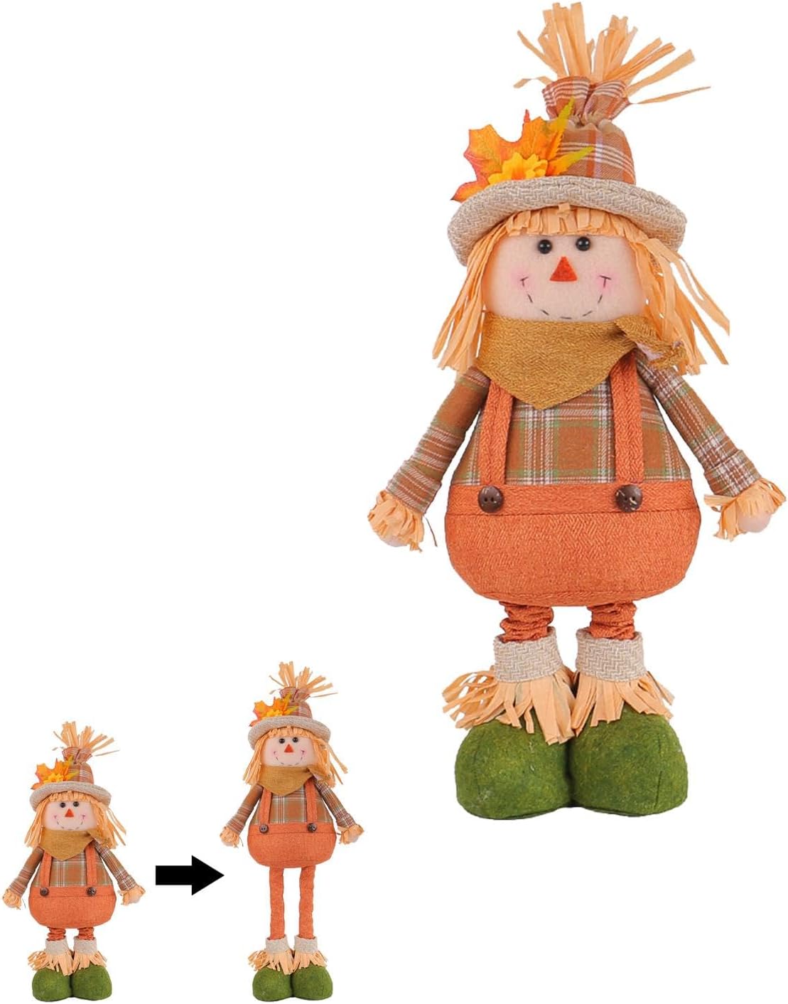 Altezza regolabile: personalizza facilmente l'altezza della bambola dello spaventapasseri a tuo piacimento con le gambe estensibili, sia in piedi che su uno scaffale. Il suo design versatile si fonde facilmente con il tuo arredamento stagionale. Bambola spaventapasseri unica: porta la bellezza rustica della campagna nell'arredamento della tua casa con la bambola spaventapasseri. Vestito con pittoreschi abiti da fattoria, aggiunge un tocco di fascino. Gioioso tocco di colore: infondi nella tua casa la calda atmosfera dell'autunno aggiungendo questa bambola spaventapasseri. Il suo fascino country si abbina a qualsiasi interno ed emana un'atmosfera calda e rustica che sicuramente ti scioglierà il cuore. Artigianato sofisticato: migliora l'arredamento della tua casa con questa bambola spaventapasseri. Il suo design stravagante con toppe in tessuto, cappelli di paglia e vivaci colori autunnali presenta dettagli affascinanti che sono delicati, unici e aggiungono un tocco di fantasia al tuo spazio. Ampio utilizzo: trasforma il tuo allestimento festivo con questa bambola spaventapasseri, ideale per mensole, scaffali, tavoli ed espositori in veranda. Perfetto per valorizzare le decorazioni del Ringraziamento, Natale e Halloween.