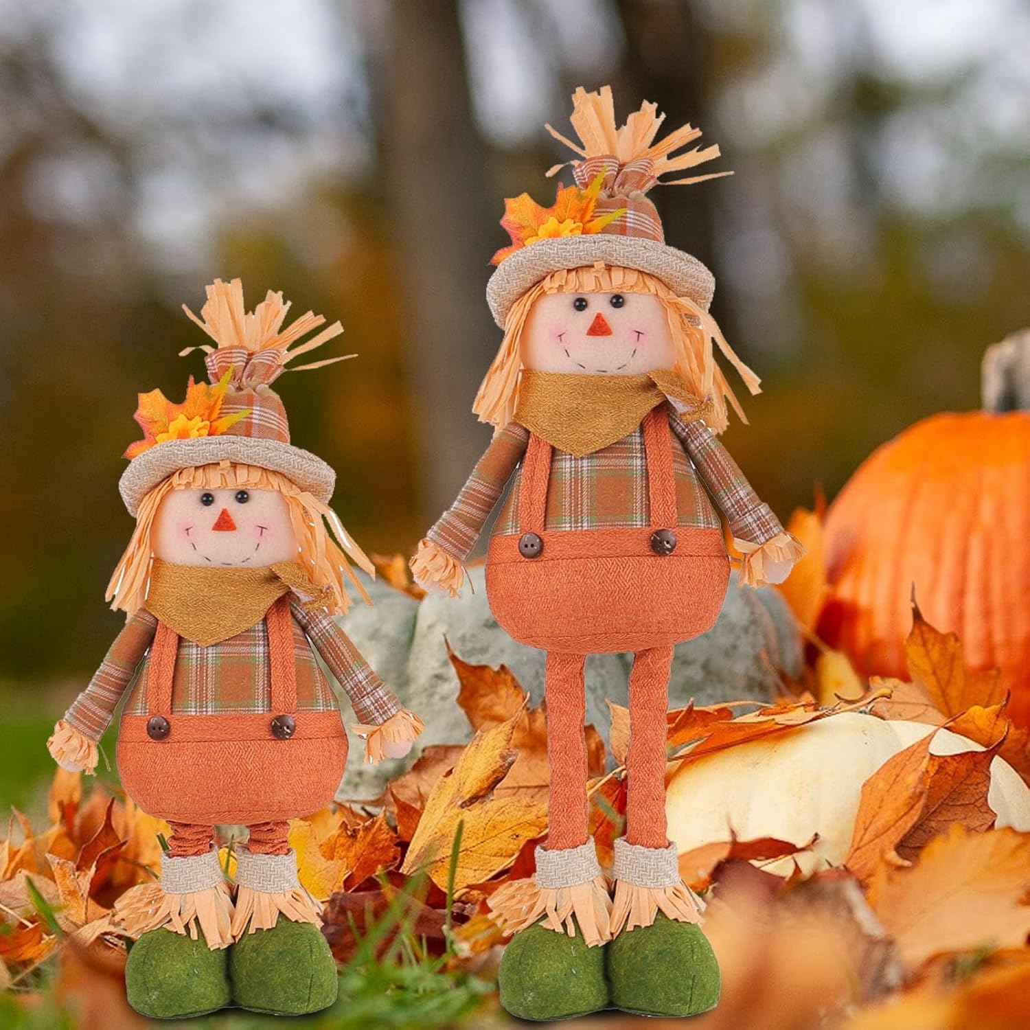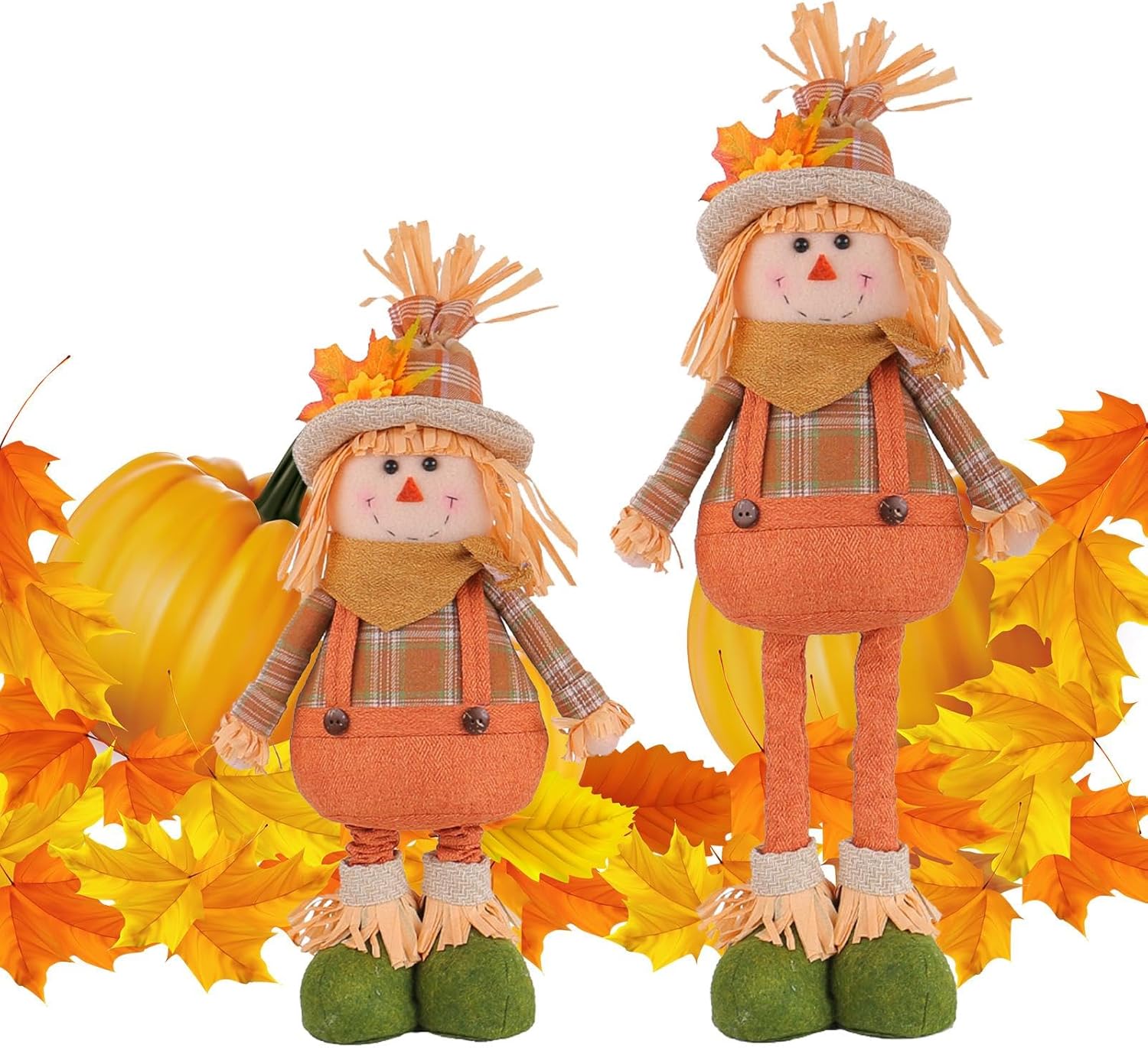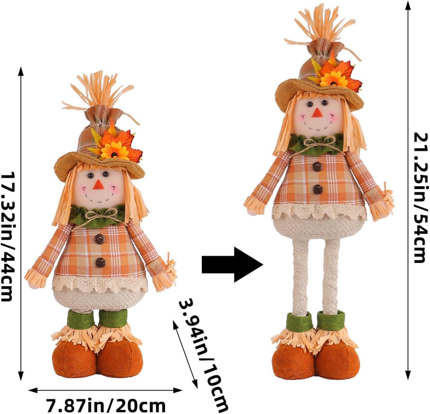 Altezza regolabile: personalizza facilmente l'altezza della bambola dello spaventapasseri a tuo piacimento con le gambe estensibili, sia in piedi che su uno scaffale. Il suo design versatile si fonde facilmente con il tuo arredamento stagionale. Bambola spaventapasseri unica: porta la bellezza rustica della campagna nell'arredamento della tua casa con la bambola spaventapasseri. Vestito con pittoreschi abiti da fattoria, aggiunge un tocco di fascino. Gioioso tocco di colore: infondi nella tua casa la calda atmosfera dell'autunno aggiungendo questa bambola spaventapasseri. Il suo fascino country si abbina a qualsiasi interno ed emana un'atmosfera calda e rustica che sicuramente ti scioglierà il cuore. Artigianato sofisticato: migliora l'arredamento della tua casa con questa bambola spaventapasseri. Il suo design stravagante con toppe in tessuto, cappelli di paglia e vivaci colori autunnali presenta dettagli affascinanti che sono delicati, unici e aggiungono un tocco di fantasia al tuo spazio. Ampio utilizzo: trasforma il tuo allestimento festivo con questa bambola spaventapasseri, ideale per mensole, scaffali, tavoli ed espositori in veranda. Perfetto per valorizzare le decorazioni del Ringraziamento, Natale e Halloween.