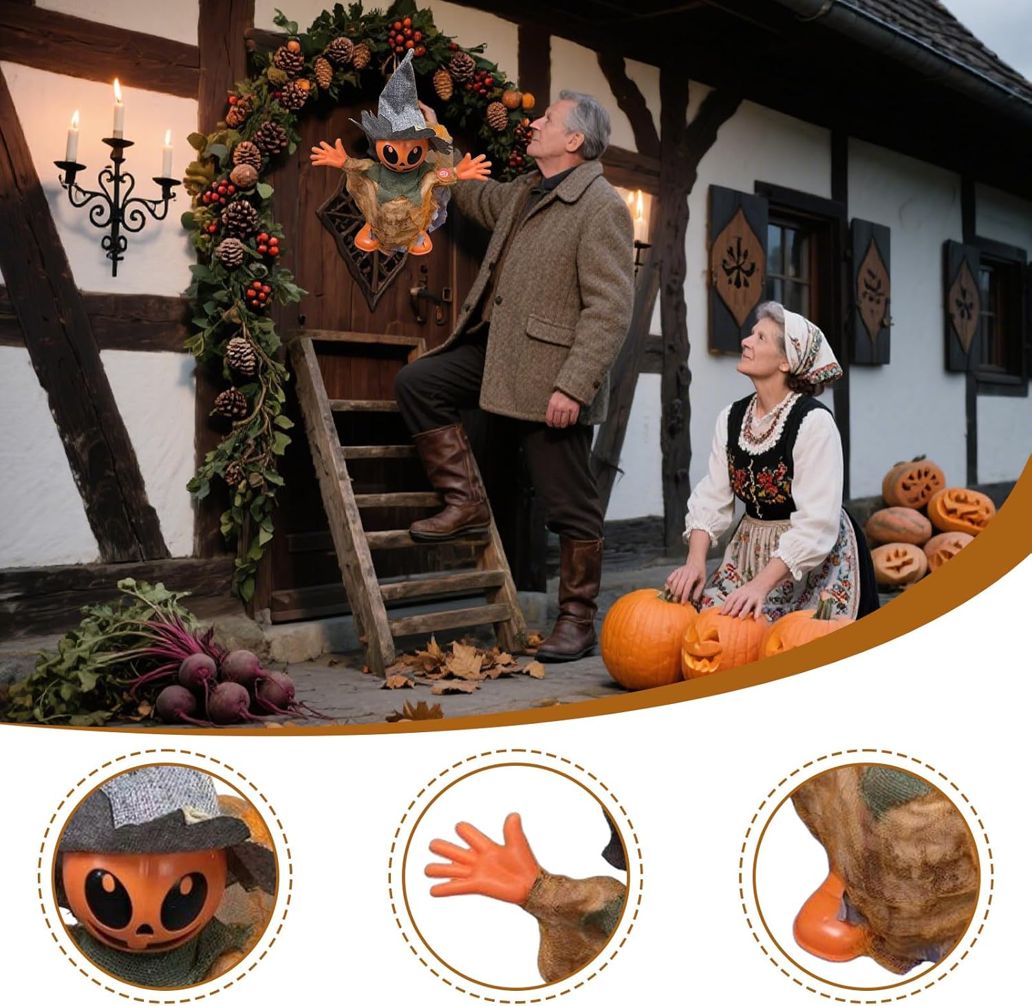 Divertimento interattivo: questo spaventapasseri di Halloween si attiva automaticamente per un intrattenimento istantaneo e si adatta perfettamente a diversi luoghi, sia in casa che fuori in giardino per un'esperienza interattiva Atmosfera fissa rapida: la simulazione realistica dell'uomo e il movimento elettronico dello spaventapasseri dona energia dinamica al tuo spazio esterno e garantisce un tocco accattivante nelle composizioni di Halloween dentro e fuori dal cortile Comfort senza fili: installabile liberamente senza cablaggio, grazie alla struttura flessibile e alla batteria portatile per decorazioni personalizzate di Halloween in luoghi diversi Resistenza all'aria aperta: progettato con tecnologia idrorepellente e caratteristiche leggere e resistenti al vento per prestazioni robuste e senza preoccupazioni anche in ambienti esterni più esigenti Effetto unico: con le sue dimensioni equilibrate, lo spaventapasseri senza ingombrare i gioielli di Halloween esistenti