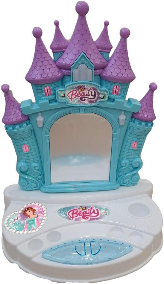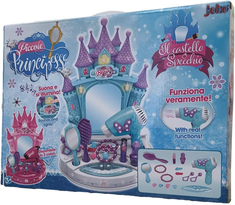 Specchiera corredata di gioielli per le nostre piccole principesse! La specchiera, dalla forma di un castello, si illumina e suona. Completa di: un paio di orecchini, quattro anelli, due mollettine, un rossetto, un lucidalabbra, due profumi, due bracciali, uno specchio, una spazzola e un asciugacapelli. Puoi personalizzare il prodotto grazie agli adesivi di cui è corredato il set. Dimensioni scatola: 45 x 33 x 6 cm Dimensioni specchiera: 33 x 28 x 18 cm