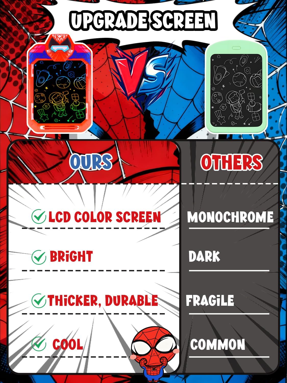 【Ispira la creatività del tuo bambino】Questo elegante tavoletta grafica bambini da disegno LCD è perfetto per bambino e bambina di 3 4 5 6 7 8 9 10 11 12 anni. Ideale per disegnare, scrivere, fare giochi di ortografia, fare sfide matematiche o anche lasciare messaggi divertenti, è lo strumento ideale per incoraggiare l'immaginazione e il pensiero creativo. 【Cancellazione facile e blocco schermo】Cancella l'intero schermo con un solo tocco e ricomincia con le meravigliose creazioni dei bambini! Non perdere mai i capolavori dei bambini! Questa funzione di blocco schermo del lavagna magica per bambini da disegno impedisce la cancellazione accidentale, mantenendo al sicuro le opere creative dei tuoi bambini fino a quando non saranno pronti per nuove avventure. 【Schermo protettivo per gli occhi, gioco sicuro】Progettato con cura per proteggere gli occhi in crescita. Il nostro lavagna cancellabile bambini da scrittura per bambini è dotato di uno schermo LCD migliorato che visualizza linee vivaci e uniformi senza la fastidiosa luce blu, permettendo ai bambini di giocare e creare per ore, senza preoccupazioni! 【Ultra-portatile, divertente ovunque, in qualsiasi momento】Lascia che la creatività fiorisca ovunque vadano i bambini! Leggera e portatile, questa LCD lavagna per bambini si adatta facilmente allo zaino di qualsiasi bambino, rendendola il giocattolo educativo perfetto per casa, viaggi, scuola o divertimento all'aperto. Non necessita di ricarica, basta sostituire la batteria per continuare il viaggio creativo. 【Il regalo perfetto per ogni occasione】Questo regalo educativi creativo susciterà gioia nei bambini! Che si tratti di un compleanno, Natale, Pasqua, la Festa dei Bambini o l'inizio dell'anno scolastico, questo blocco da disegno per bambini è una meravigliosa sorpresa. Più di un semplice giocattolo, è uno strumento per ispirare la creatività, rendendolo un regalo memorabile e premuroso per ogni bambino.