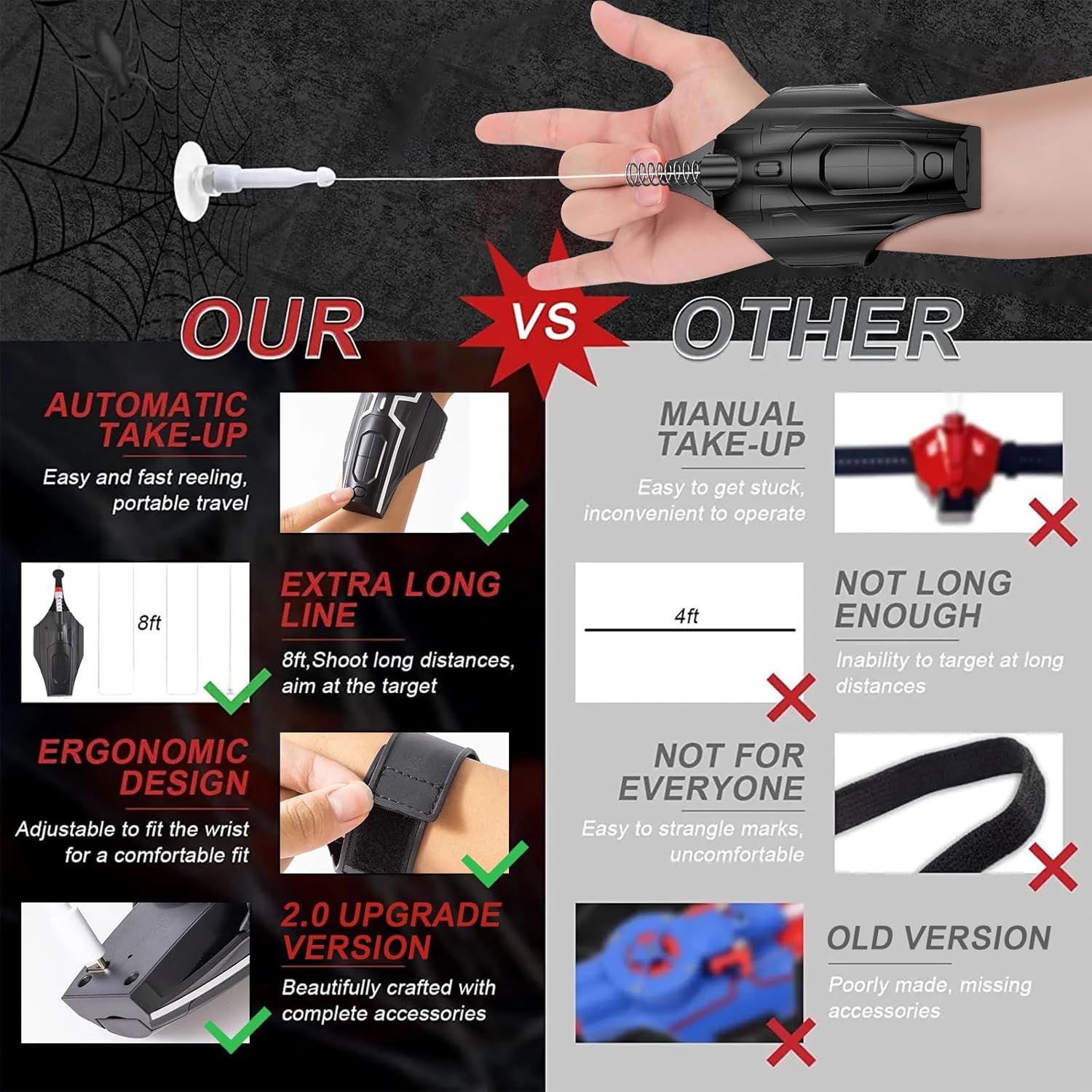 ✔ Questa è la versione aggiornata di Spider Web Shooting Toy 2.0, che puoi usare più volte per imitare le azioni iconiche dei supereroi e realizzare i tuoi sogni RPG. Accompagnati da azioni iconiche di supereroi; Chiunque può diventare un supereroe ✔️ Questo modello è stato recentemente aggiornato e viene fornito con una bobina in miniatura versione 2.0 e batteria ricaricabile. Dopo rigorosi test, assicura che i cavi non si aggrovino e il motore funzioni senza intoppi. Basta premere il pulsante di registrazione per circa quattro secondi per completare il ripristino, ed è possibile eseguire diverse ore di operazioni di lancio della rete ✔️ Il nuovo design della versione 2.0 adotta la tecnologia del tamburo da 2 micron per prevenire l'impigliamento o l'inceppamento della corda. Ciò significa che la corda non deve essere avvolta intorno alla bobina e raccolta direttamente nel contenitore. Questo riduce la resistenza durante l'avvio, rendendo la corda più liscia. Inoltre, vengono forniti utensili a vite per aprire il prodotto, allentare i fili avvolti ed eseguire semplici riparazioni dopo l'annodatura ✔ La nostra tuta Spider viene fornita con magneti e ventose, che possono essere attaccati a oggetti di ferro utilizzando magneti dopo la sparatoria. Se il magnete è dotato di una ventosa, il proiettile può attaccarsi a un oggetto liscio e piatto. È il software di registrazione di rete perfetto per qualsiasi situazione. ✔ Piccoli strumenti cool sono adatti per varie occasioni, come feste di trucco, giochi interattivi, giochi di ruolo, serate di festa di Halloween, spettacoli teatrali, necessità quotidiane o altre occasioni. Questo fa parte dell'equipaggiamento dei supereroi che può realizzare le tue fantasie più selvagge. Gli adulti possono anche provare l'eccitazione delle loro commedie preferite