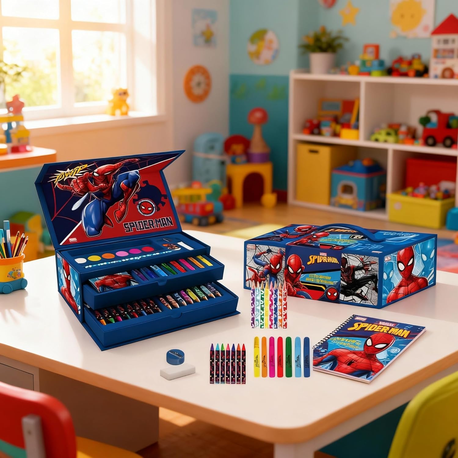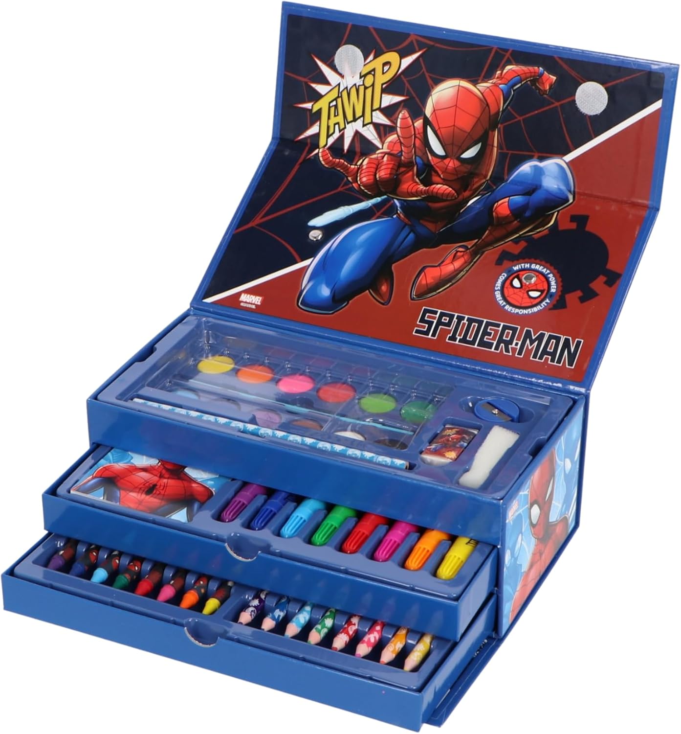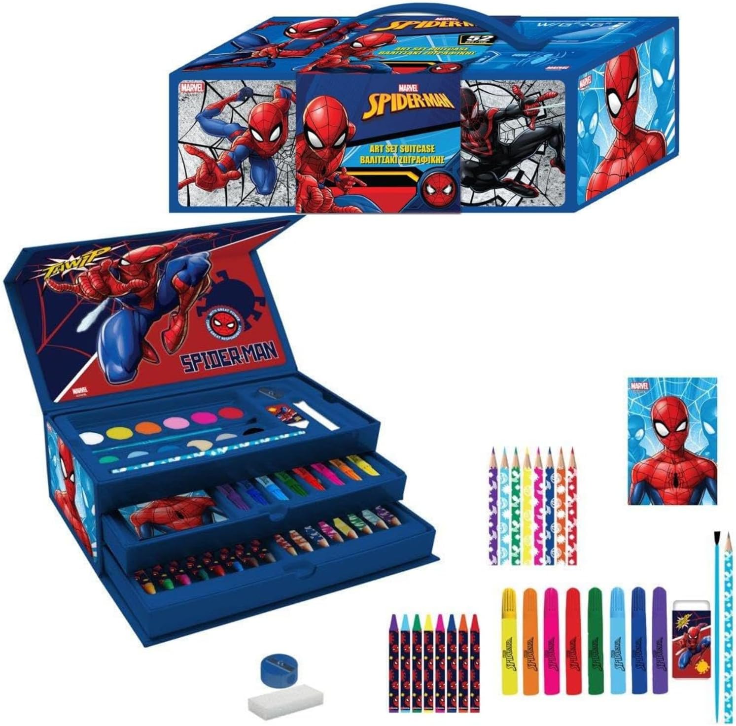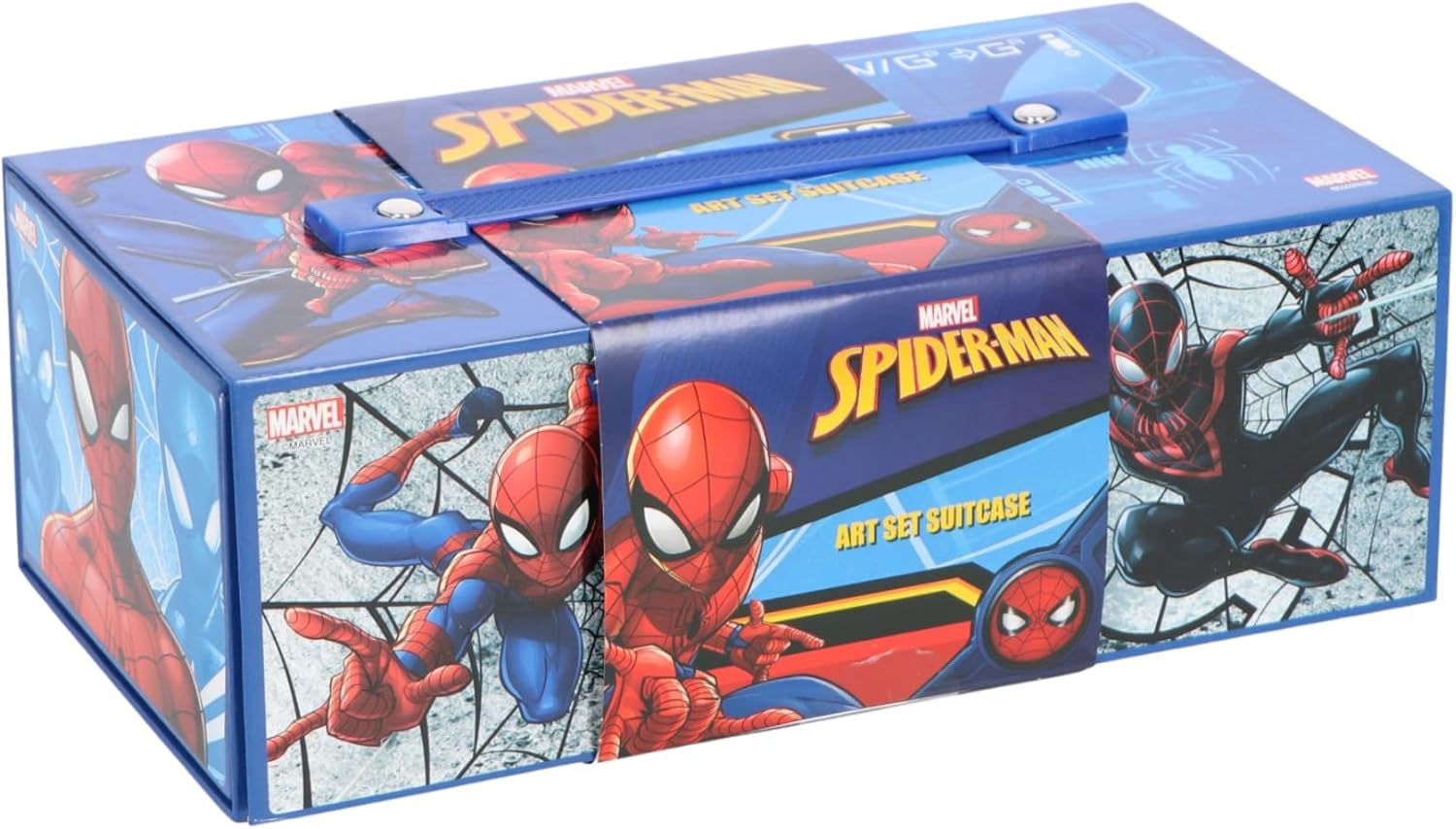 Set completo da 52 pezzi: include pennarelli, pastelli, matite colorate, acquerelli, un pennello, gomme, un temperamatite, una spugna e altro ancora. Custodia portatile e durevole: custodia in plastica rigida Spider-Man (26,3 x 13,7 x 9,5) con chiusure sicure e maniglia per l'arte in movimento. Design eroico di Spider-Man - Grafica Marvel audace con Spider-Man in azione - uno dei preferiti dai fan dei supereroi.. Alimenta avventure creative: incoraggia il gioco fantasioso e supporta lo sviluppo precoce delle abilità artistiche. Fantastica idea regalo: un fantastico regalo per compleanni, vacanze o semplicemente perché, perfetto per ragazzi, ragazze e giovani fan di Spidey.
