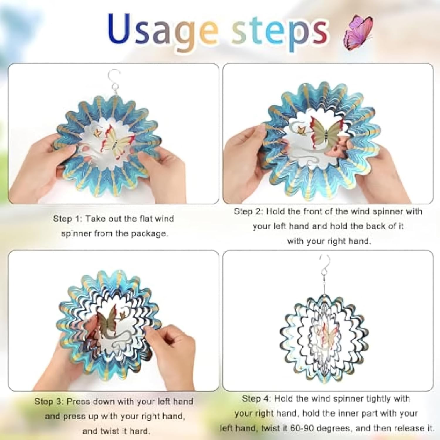 Effetto 3D: osserva con stupore come i disegni rotanti a 360 gradi di questo filatore di a farfalla crea un affascinante effetto visivo 3D che aggiunge un tocco incantevole al tuo giardino. Con i suoi eleganti svolazzanti, questo filatore migliora il tuo arredamento da giardino e crea un ambiente rilassante che rilassa l'anima. Altamente decorativo: decorazione interna ed esterna, creando un'atmosfera romsantica per la tua casa con il suo affascinante design a farfalla che con grazia nel . Materiale eccellente: costruito con materiali di alta qualità, questo spinner di dei buttoni offre una grande durata, assicurando che non deformi o degrada facilmente anche dopo un uso esteso in ambienti esterni. Conveniente da usare: basta tenere il rotore con la mano destra asndlo di 60-90 gradi. Quindi, premere verso il basso con la mano sinistra e tenere la parte anteriore rotore con la mano destra per fissarlo in posizione. Un gioco da ragazzi da configurare. Uso versatile: trasforma sale, patio e giardini con la secca secca filatore a farfalla, per spazi interni ed esterni.