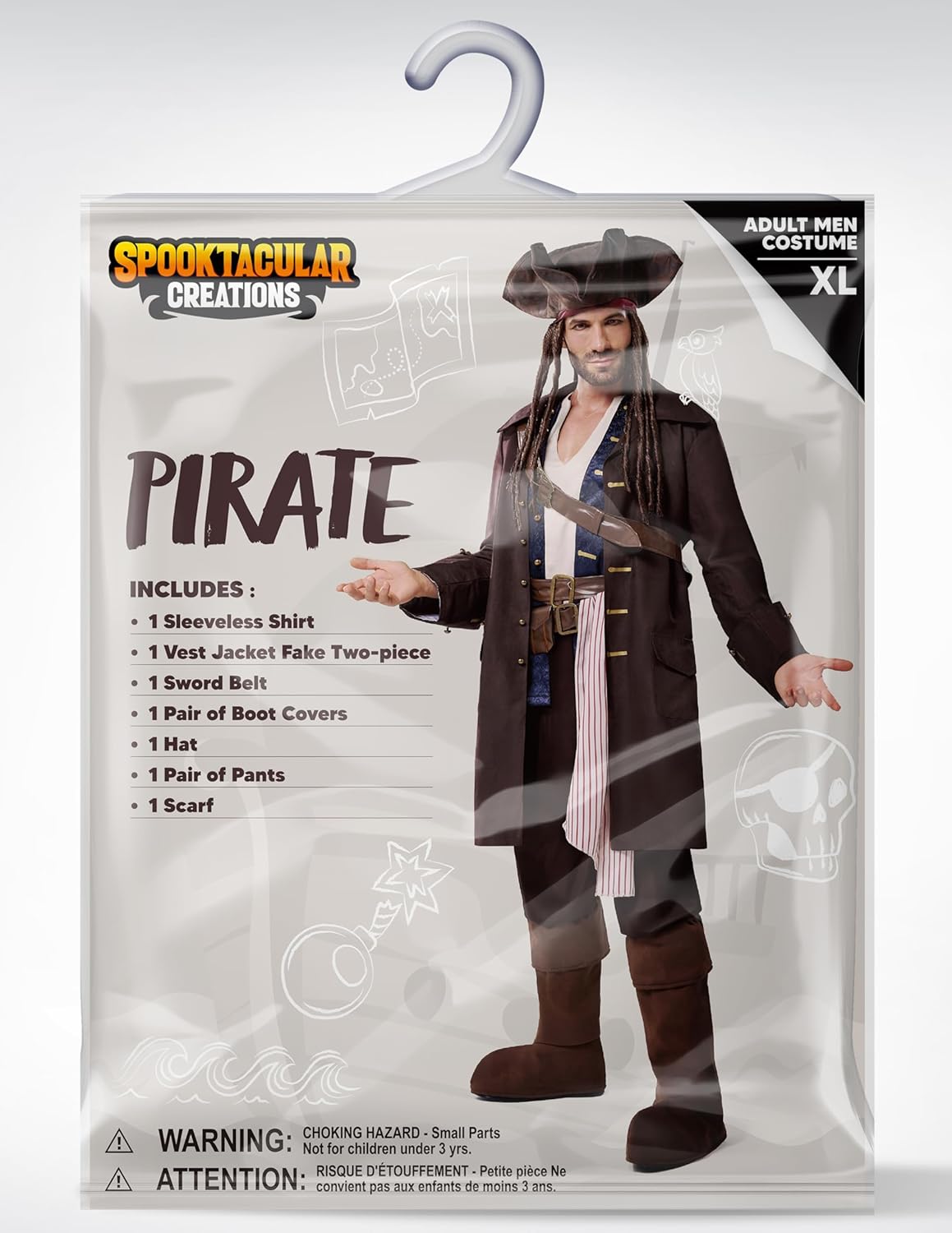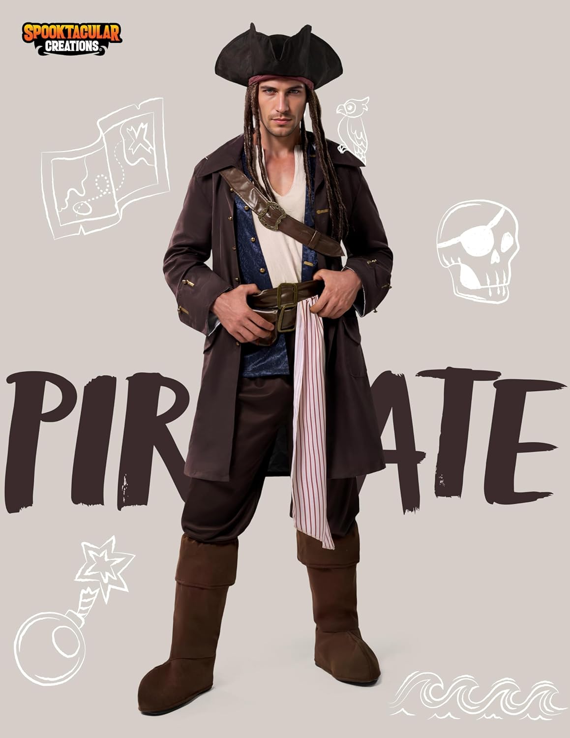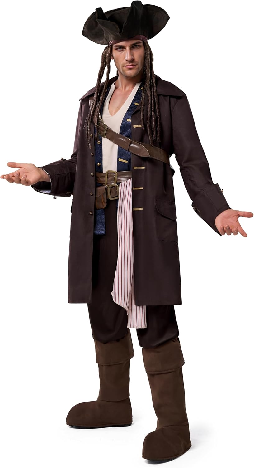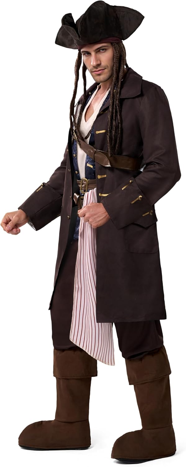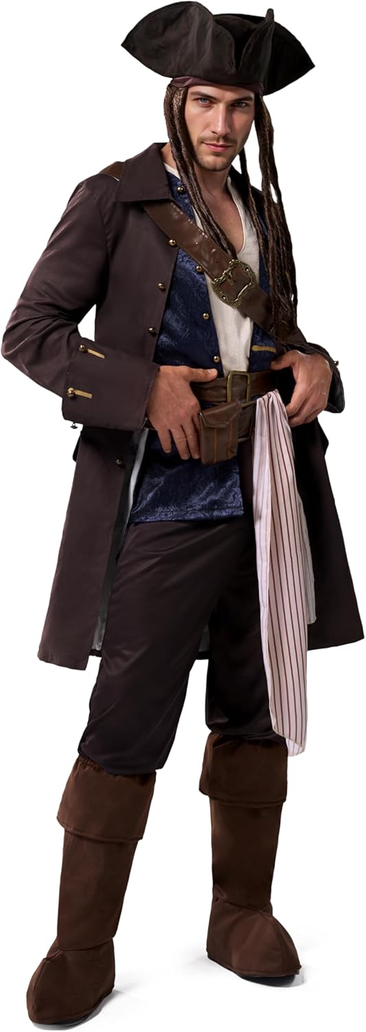 Spooktacular Creations Costume da pirata di Halloween per uomo, completo da Capitano contrabbandiere deluxe con cappello e cintura per feste a tema cosplay Contenuto: Questo set tutto in uno da uomo include 1 camicia senza maniche, 1 giacca lunga con 1 gilet floreale attaccato e cinture integrate, 1 cintura con spada in finta pelle, 1 cintura in vita, 1 pantalone da pirata a righe, 1 cappello a tricorno con parrucca attaccata e 1 paio di copristivali: tutto ciò di cui hai bisogno per trasformarti nel leggendario capitano pirata. Tessuto morbido e confortevole: realizzato al 100% in poliestere, il nostro costume di Capitan Uncino è comodo e resistente, aggiungendo brillantezza alla tua performance flessibile di festa, ideale per avventure notturne sul ponte o sulla terra. Solo pulizia con spugna. Non candeggiare, asciugare in asciugatrice o stirare per preservarne l'aspetto audace. Opzioni di vestibilità lusinghiere: disponibile nelle taglie per adulti M, L e XL per adattarsi a una varietà di forme del corpo. Italiano: Il modello è alto 1,85 m, pesa 84 kg e indossa una taglia L. Controlla la tabella taglie per trovare la taglia ideale e partecipare con stile al tuo evento. Design elegante e audace: l'outfit da pirata di Halloween presenta una silhouette aderente con una canotta in finto raso in due pezzi stratificata sotto un gilet blu scuro con motivo floreale, attaccato senza soluzione di continuità a un lungo cappotto da pirata drammatico. Il cappotto marrone è realizzato in tessuto scamosciato, che ha un certo grado di silhouette, evidenziando perfettamente la figura maestosa. Le asole rifinite in oro e la cintura decorata in finta pelle aggiungono un autentico tocco marittimo, perfetto per ogni capitano in cerca di gloria e tesoro. Occasioni versatili: attira l'attenzione con questo abito da uomo. Ottimo per feste in maschera di Halloween, festival, costumi per feste a tema, costume da pirata del rum, costume da pirata della leggenda dei sette mari, costume di Halloween da pirata bucaniere, costume dolcetto o scherzetto, tempo di gioco quotidiano e altro ancora. Aggiungi tanto divertimento alla tua festa di Halloween e ad altre attività a tema.