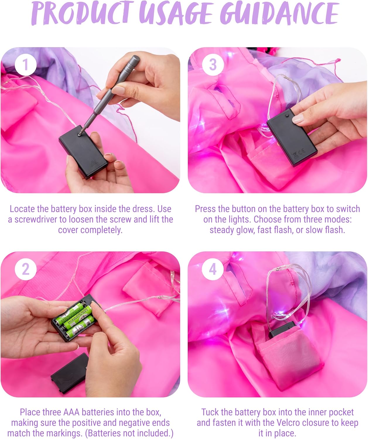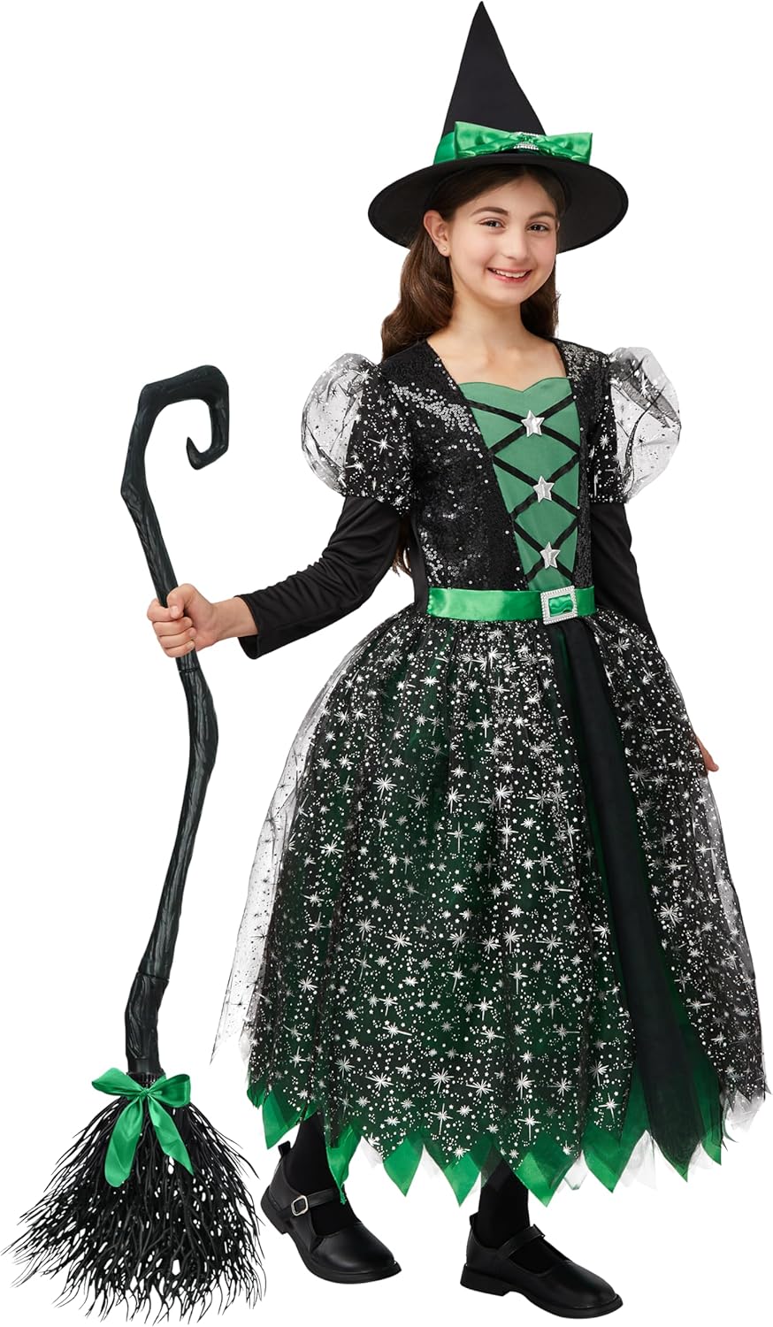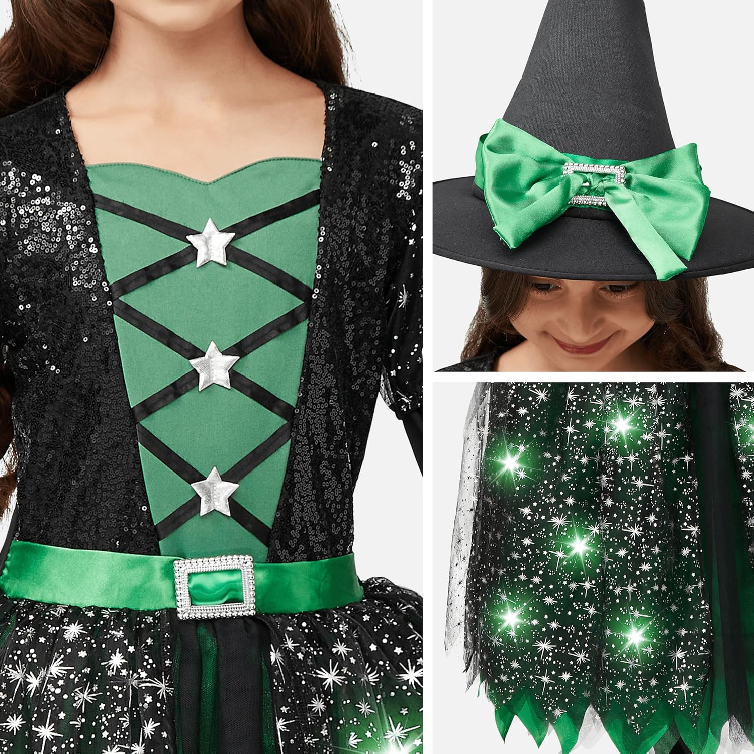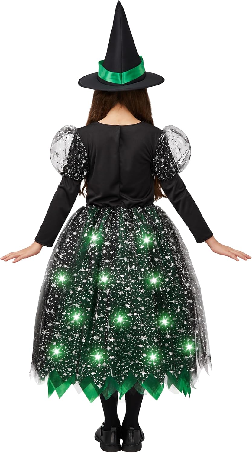 Spooktacular Creations Costume da strega con luci a LED, per ragazze, costume da strega verde con cappello e scopa, grazioso costume da strega design fantastico Confezione super valore: il nostro simpatico costume da strega include un cappello da strega con fiocco verde, un vestito magico con fantastici disegni e una scopa. La scopa è dotata di cinque nastri decorativi colorati e può essere abbinata all'outfit a piacimento. Un perfetto costume rinascimentale deluxe per costumi da strega spaventosi per ragazze di Halloween. Costume perfetto: questo leggero costume da strega per ragazze presenta il set Deluxe Spooktacular's Funky Witch Costume per Ragazze Kids Deluxe. Include un cappello da strega con fiocco verde e un vestito magico stampato con motivi fantastici. Le batterie non sono incluse per questo costume da strega luce. QUALITÀ PREMIUM E MANUTENZIONE: i nostri luminosi costumi da strega per ragazze sono super resistenti e di alta qualità e contengono gonne multistrato stampate con stelle argentate e lampadine colorate che aggiungono un tocco fantasioso al tuo look inconfondibile! Lavare a mano a freddo. Asciugare a secco. Non schiarire Facile da trasportare, mantenere e pulire. Costume da strega per bambini per Halloween, festival, feste a tema, miglior costume di Halloween, costume da strega, feste a tema fiaba, costume da strega, costume da strega per bambini, costume da strega per feste e molto altro ancora. Taglia: Toddler (3 - 4 yrs), Small (5 - 7 yrs), Medium (8 - 10 yrs), Large (10-12 yrs), fit most girls