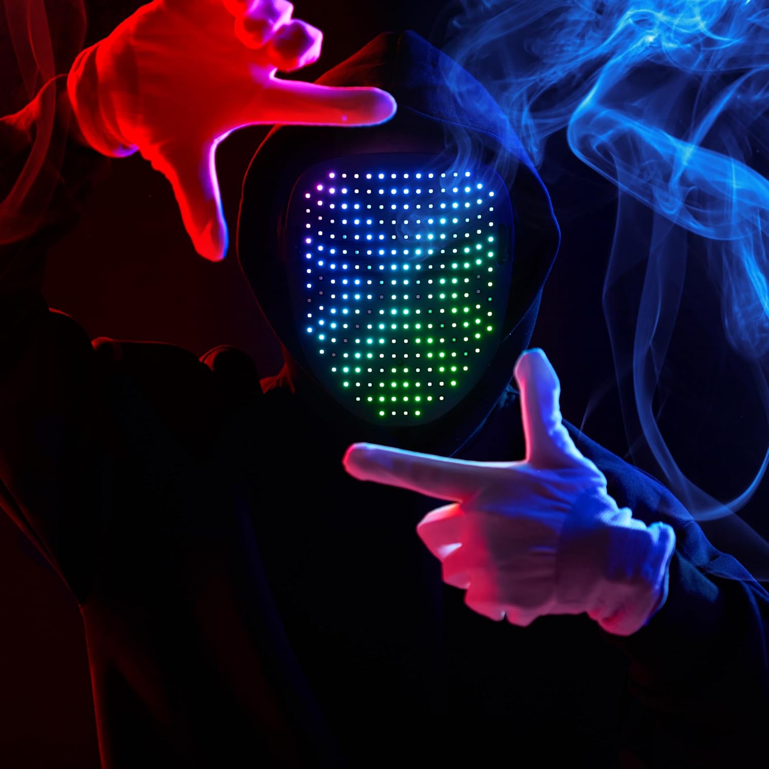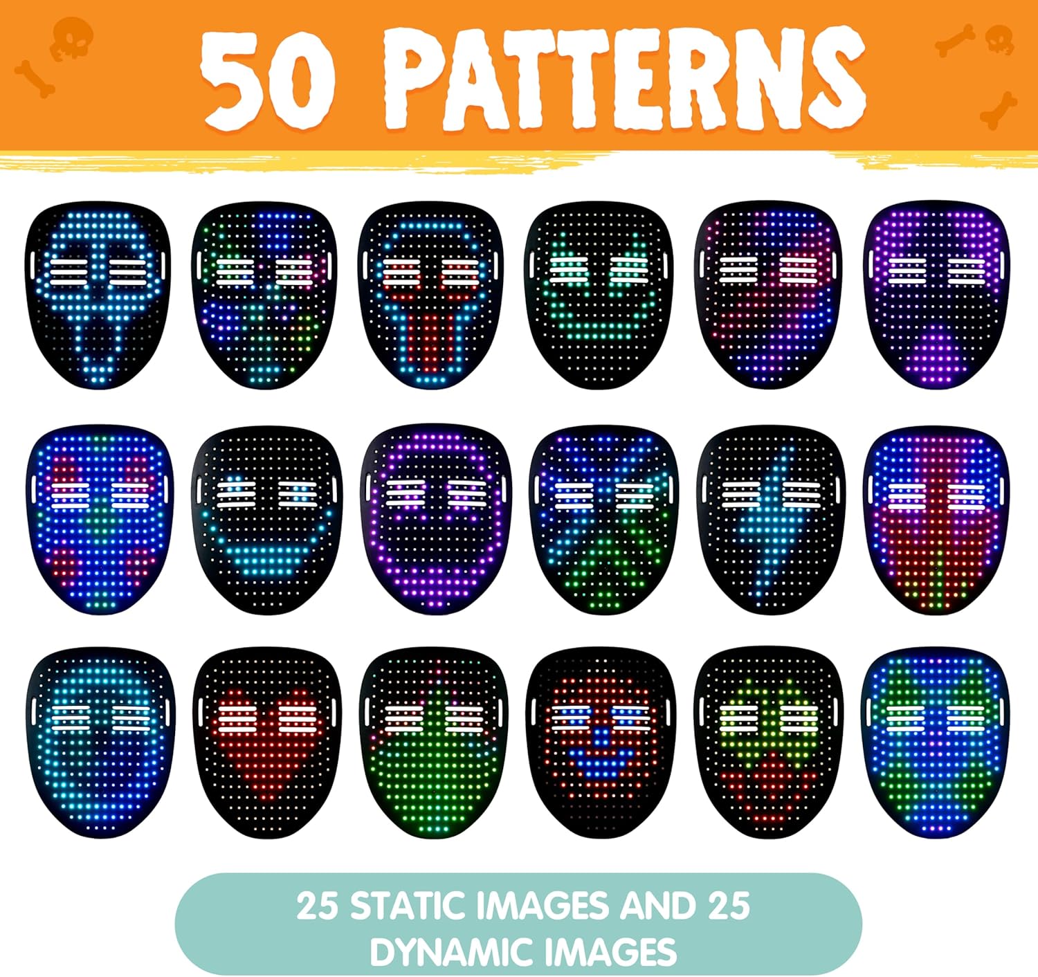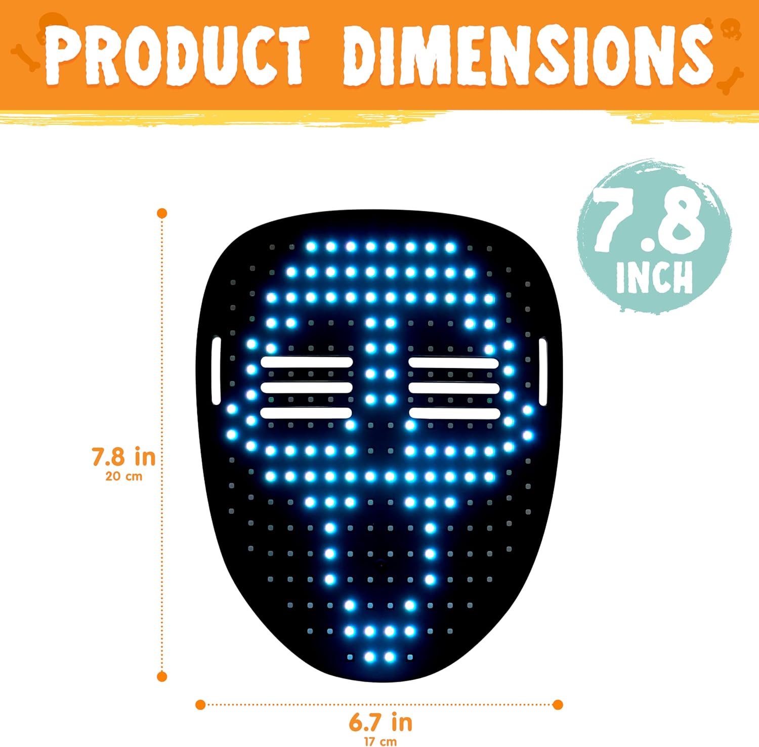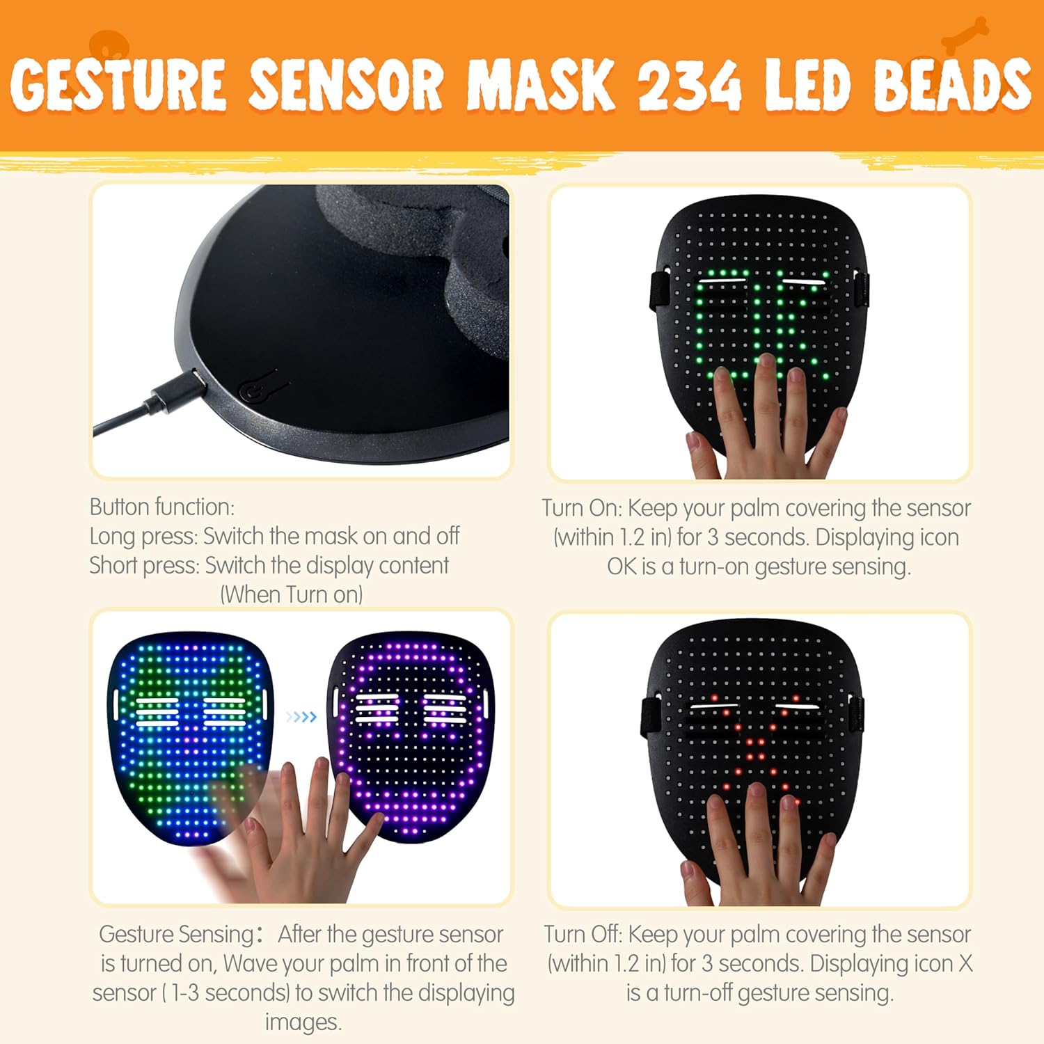 Accessorio perfetto. Ogni confezione contiene 1 maschera a LED trasformabile per Halloween per adulti, accessori per costumi cosplay di Halloween. Ogni maschera di Halloween LED illumina utilizza 234 perline LED ad alta luminosità 2727RGB. Ci vogliono 3 ore per caricare al primo utilizzo. La batteria integrata può durare per 8-10 ore. L'interfaccia di ricarica USB Type-C è carica DC5V/1A MAX. Premere a lungo l'interruttore di alimentazione per accendere o spegnere la maschera e premere brevemente per cambiare il contenuto del display. Rilevamento gestuale. La nostra maschera di Halloween illuminata a LED terrore, 50 modelli di visualizzazione integrati, 25 immagini statiche e 25 immagini dinamiche. Usa il palmo della mano per continuare a coprire il sensore molto da vicino per 3 secondi per accendere/spegnere il rilevamento dei gesti. La visualizzazione dell"icona OK è un rilevamento gestuale di accensione. La visualizzazione dell'icona X è un gesto di spegnimento sensing.Agitare il palmo della mano davanti al sensore per un breve periodo (circa l-3 secondi) per cambiare le immagini visualizzate. La distanza di rilevamento dovrebbe essere entro 3 cm. Ampia gamma di utilizzi. La nostra maschera LED di Halloween con rilevamento dei gesti è adatta per feste di Halloween, feste in maschera, feste in costume, cabine fotografiche, notte folle, feste in maschera, feste rave e altre occasioni di gala, aumentando un tocco spaventoso al tuo ensemble di Halloween. Qualità premium. La nostra maschera di Halloween luminosa è sicura da usare e realizzata in materiale ecologico di qualità, il materiale è sicuro e innocuo, e la luce a LED non causerà danni al corpo umano o all'ambiente, durevole, sicuro. Sicuro per i bambini. Non tossico. Soddisfa gli standard dei giocattoli statunitensi. Test di sicurezza approvato. Design confortevole. La nostra maschera di Halloween a LED per adulti è progettata per una vestibilità comoda e sicura, garantendo ore di usura senza disagio. Questa maschera di Halloween si illumina al buio viene fornita con cinghie elastiche nere, adatte a varie dimensioni della testa, in modo da non doversi preoccupare di problemi di dimensioni della testa.