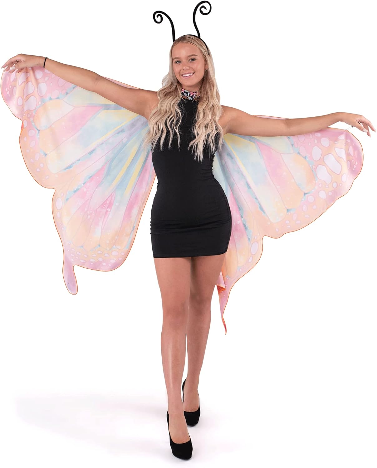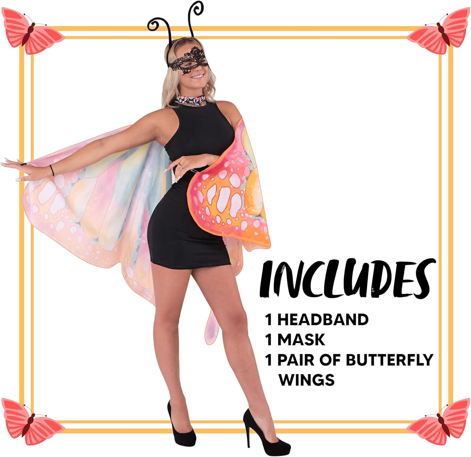 Spooktacular Creations Mantello con ali di farfalla per donna Accessori per costume di Halloween con maschera in pizzo e fascia per antenna in velluto nero Scialle con ali di farfalla blu SPAVENTA CON STILE. Set Deluxe con ali di farfalla dai colori freddi. Include un paio di scialli a mantella con ali di farfalla per un fascino gloriosamente magico. COMODO E FACILE DA LAVARE. Il nostro costume da fata per adulti taglie forti è realizzato al 100% in poliestere. Cura: lavare solo a mano, acqua fredda, non schiarire, facile da pulire e pulire. DIMENSIONE. Queste ali per costume da farfalla per adulti sono disponibili in una taglia standard, adatta alla maggior parte delle donne. QUALITÀ PREMIUM. Questo costume da ali di farfalla per adulti è super resistente e realizzato con qualità superiore. Il materiale è realizzato al 100% in poliestere di alta qualità. Contiene un paio di scialli colorati con ali di farfalla e motivi eleganti. Questo scialle fluido con ali di farfalla è perfetto per il tuo look elegante e delicato! SODDISFAZIONE DEL CLIENTE. Fornire un'ottima esperienza di acquisto è la nostra priorità principale per i nostri clienti. Sentiti libero di inviarci un messaggio tramite "contatta i venditori" se i prodotti non soddisfano le tue aspettative. I festeggiamenti iniziano da SPOOKTACULAR!