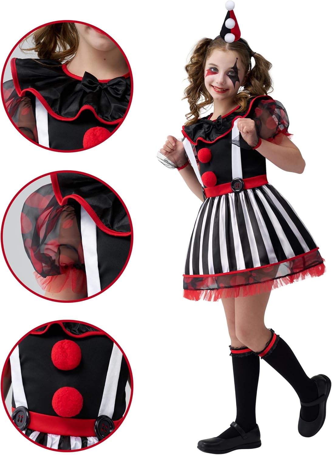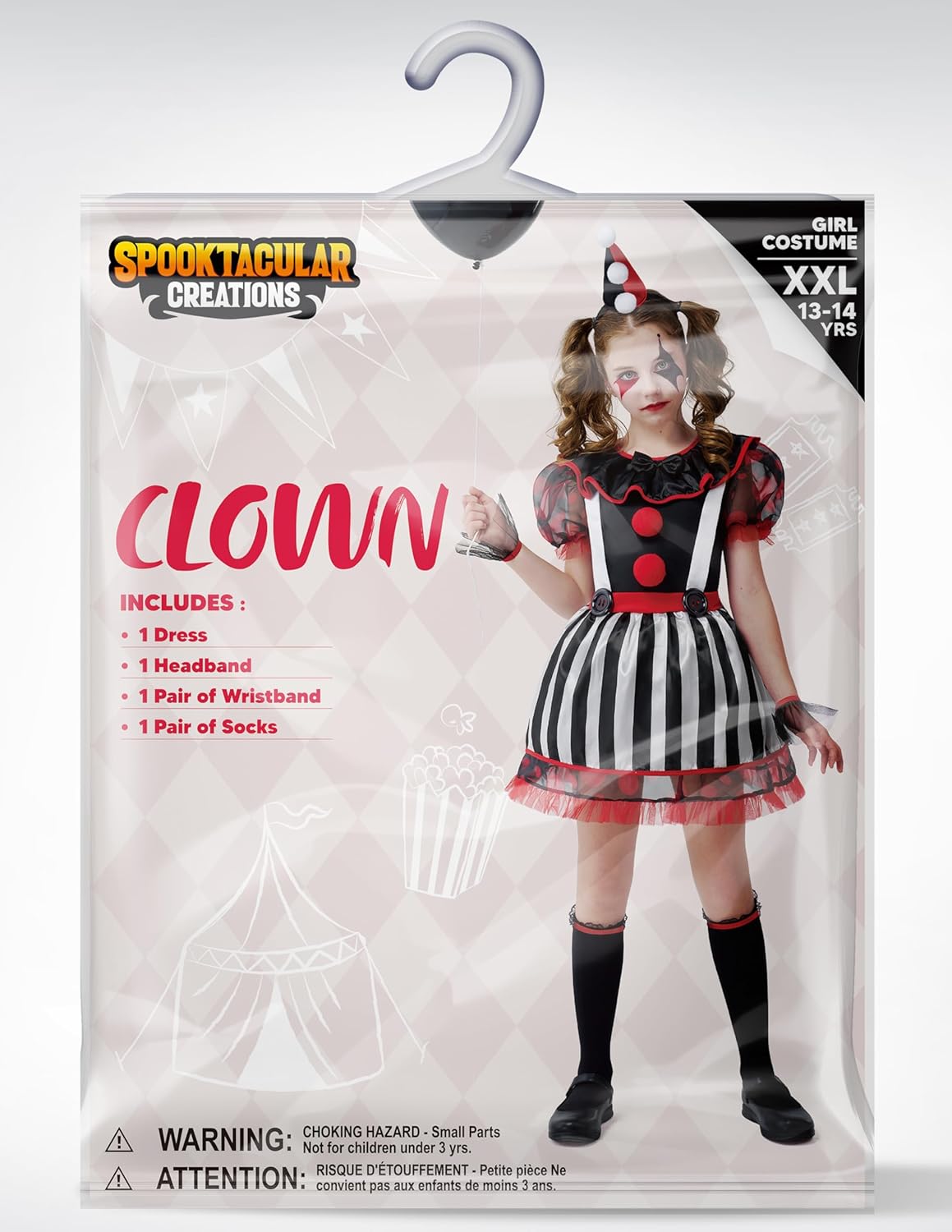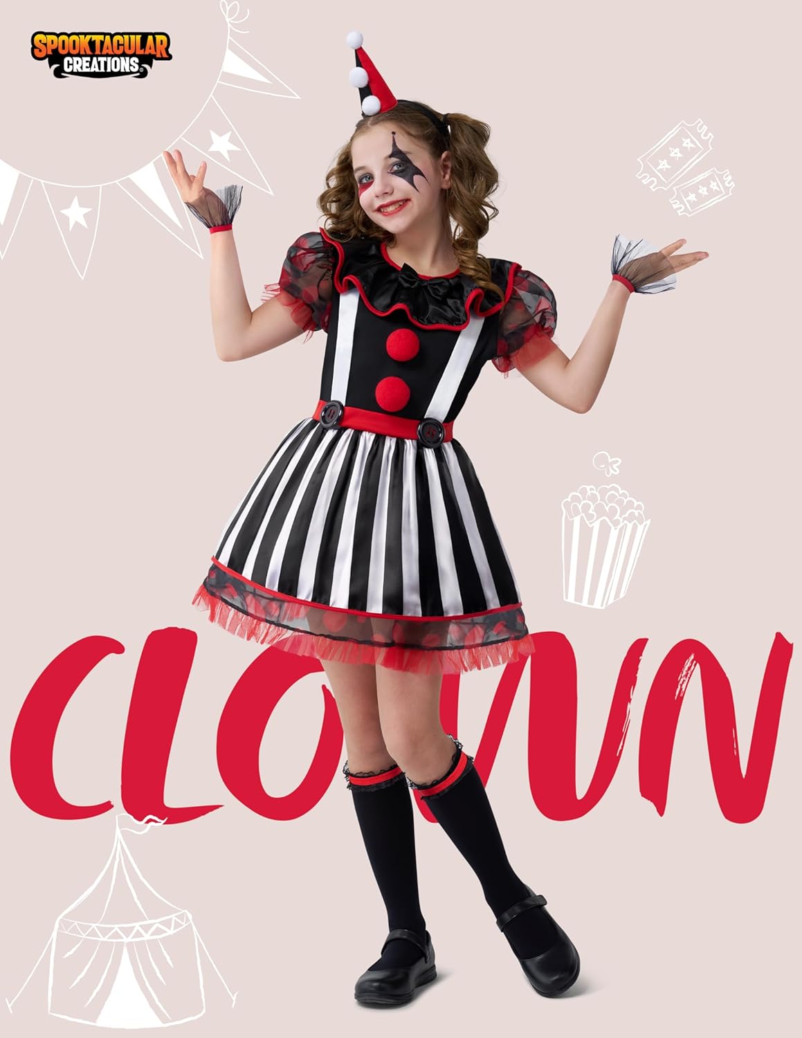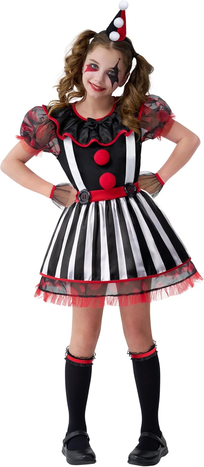 Costume da clown per bambine Spooktacular Creations, costume da clown malvagio per Halloween per bambini, gioco di ruolo e travestimenti di Halloween Abito completo: questo adorabile e inquietante costume da clown include un vestito, un paio di calzini, una fascia per capelli e una polsiera. Tutto ciò di cui la tua bambina ha bisogno per creare un look da bambola spettrale. (Nota: il palloncino non è incluso.) Tessuto morbido e confortevole: il nostro costume da clown per bambine è realizzato in 100% poliestere lavorato a maglia, offrendo una vestibilità morbida e confortevole. Lavabile solo con una spugna; non candeggiare, non asciugare in asciugatrice o stirare. Design elegante e audace: il nostro costume da clown per bambine presenta una silhouette dalla vestibilità moderata con un colletto arricciato. Maniche a sbuffo in rete, una gonna a righe a strati rifinita con volant in rete e una vivace combinazione di colori bianco e nero per un'atmosfera drammatica e spettrale. Occasioni versatili: il nostro costume da clown di Halloween è perfetto per feste di Halloween, eventi cosplay, spettacoli teatrali, serate a tema o servizi fotografici spettrali. Questo costume da clown è ideale per aggiungere un tocco di fascino inquietante a qualsiasi occasione. Taglie perfette: il nostro costume da clown di Halloween è disponibile in cinque taglie: S (5-6 anni), M (7-8 anni), L (9-10 anni) e X-Large (11-12 anni). La modella è alta 1,48 m, pesa 25 kg e indossa la taglia M. Consulta la tabella delle taglie per trovare la tua taglia perfetta.