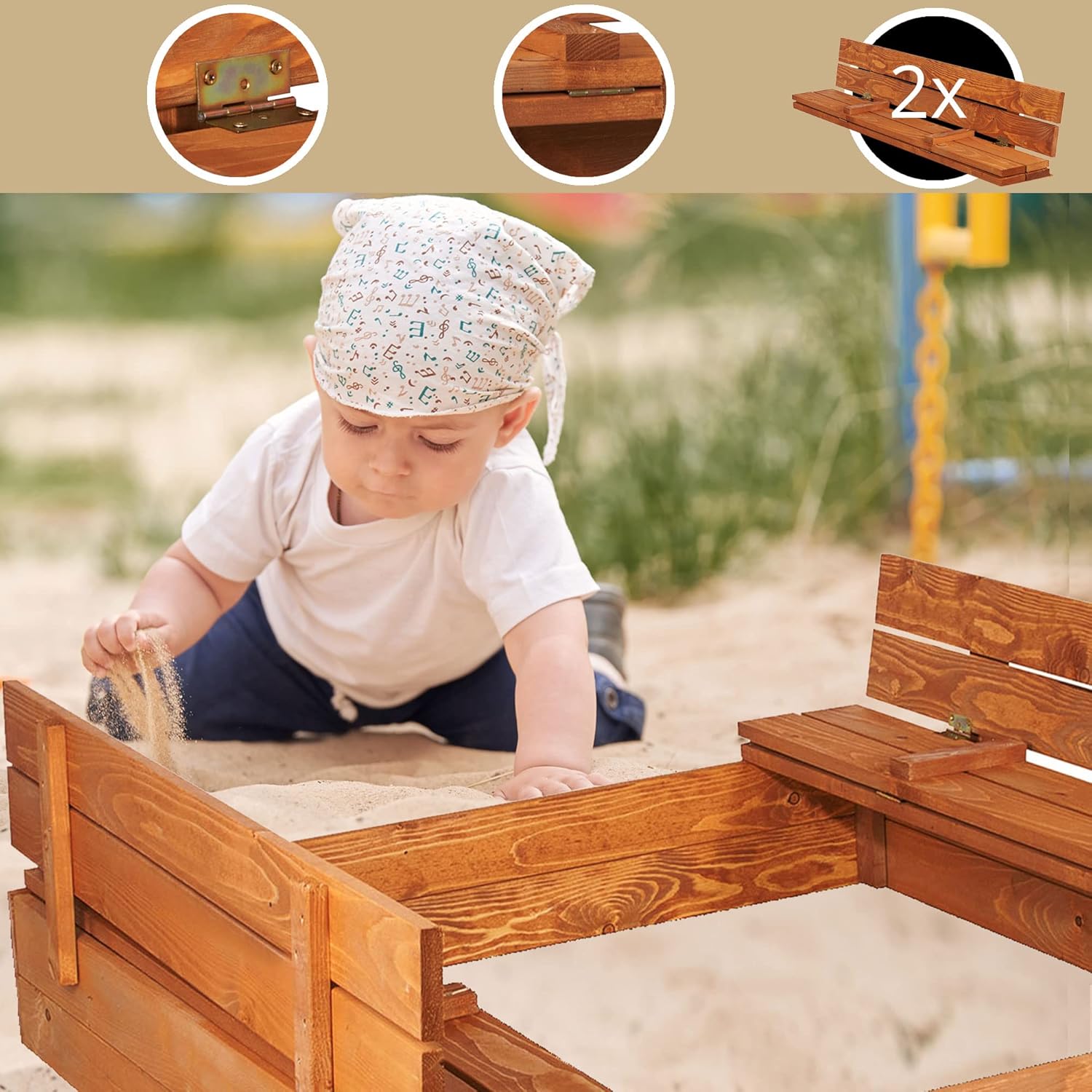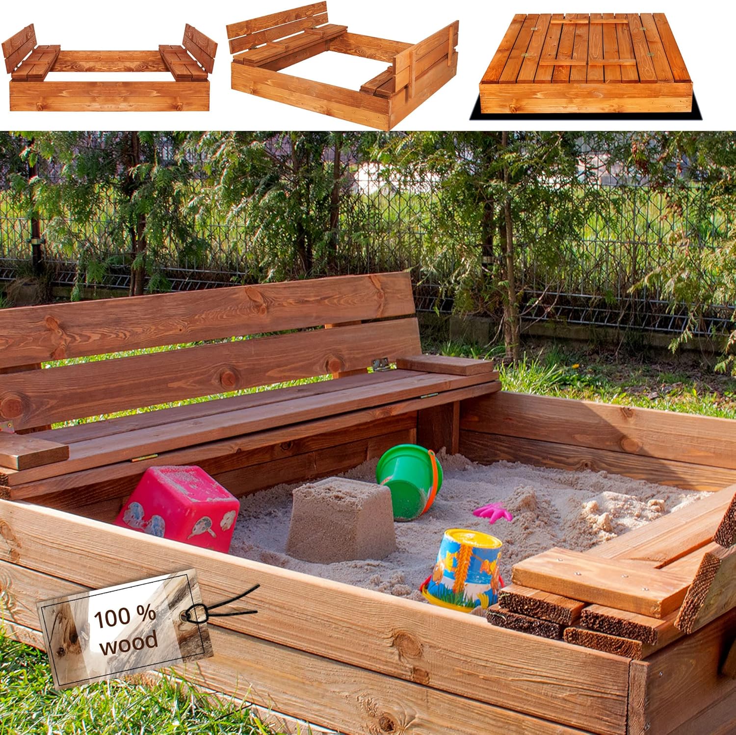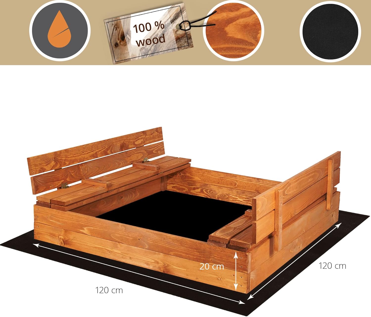 SABBIA IN LEGNO: Abbiamo raggiunto l'alta qualità della sabbiera grazie all'impregnazione rispettosa della natura. La sabbiera quadrata era realizzata in resistente legno tenero, abbiamo accuratamente levigato e segato finemente la superficie delle assi. In una tale sandbox, non solo un bambino, ma un intero gruppo di bambini può giocare. SABBIA IN LEGNO: Abbiamo raggiunto l'alta qualità della sabbiera grazie all'impregnazione rispettosa della natura. La sabbiera quadrata era realizzata in resistente legno tenero, abbiamo accuratamente levigato e segato finemente la superficie delle assi. In una tale sandbox, non solo un bambino, ma un intero gruppo di bambini può giocare. SABBIA BASIC CON PANCHE: La sabbiera in legno con serratura ha due panche pieghevoli che possono essere utilizzate anche come sedili con schienale. Per ottenere delle panchine con schienale su cui più bambini possono giocare insieme è sufficiente aprire la sabbiera. COPERTURA PROTETTIVA: Le panchine con schienale servono anche per chiudere la sabbiera. In questo modo proteggono la sabbia da foglie, sporco e animali domestici. La tua sabbiera in legno diventa un parco giochi insostituibile per il tuo bambino, porta gioia e offre uno spunto per tanti giochi per bambini creativi ed evolutivi. OTTIMA ALTERNATIVA alla plastica che si scalda fino ad alte temperature al sole. Grazie alle ampie sedute i bambini potranno sedersi comodamente, giocare e sviluppare la loro creatività con i loro amici. PARAMETRI: Sabbiera realizzata in legno massiccio impregnato a pressione, che ne garantisce la durata e la resistenza alle intemperie. Larghezza: 120 cm, lunghezza: 120 cm, altezza dopo la piegatura: 20 cm, spessore delle tavole: 18-20 mm. Telo pavimento incluso.