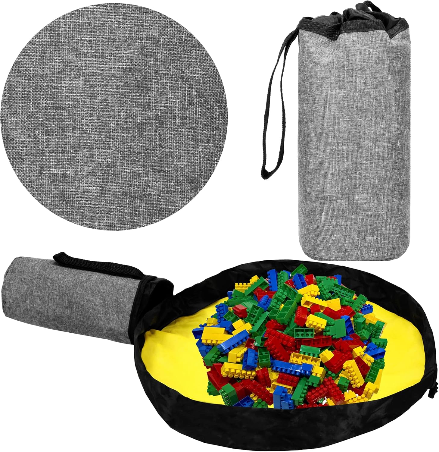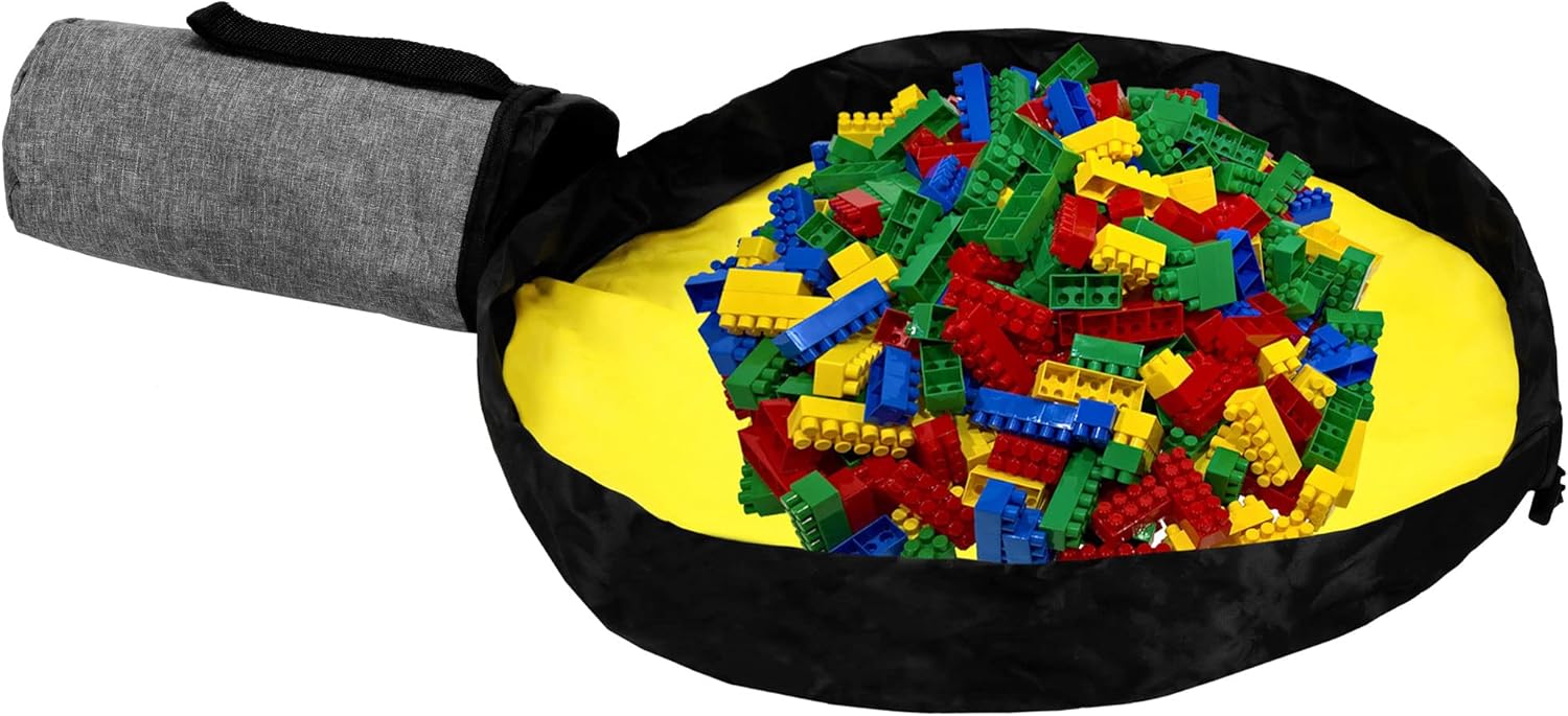 2 in 1: il prodotto ha due funzioni, per conservare e organizzare rapidamente puzzle in legno, blocchi o orsacchiotti FORMA: sacchetto richiudibile in grigio, con coulisse, tappetino cucito all'interno. Il design ricorda un sacco da mare, facile da trasportare grazie ai manici lunghi MATTE: la borsa è dotata di un tappetino giallo integrato in tessuto di poliestere con un diametro di 45 cm Per tutti i bambini: questa borsa è adatta per ragazzi e ragazze e rappresenta un accessorio pratico per ogni cameretta dei bambini, questa borsa è anche perfetta per viaggi di vacanza e weekend, come ad esempio ai nonni Parametri: sacco giocattolo, con tappetino giallo e maniglia. Il volume della borsa è di 24 litri, altezza totale 20 cm, diametro 11 cm, materiale esterno: grigio, interno: nero