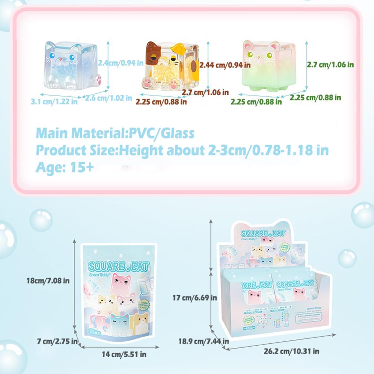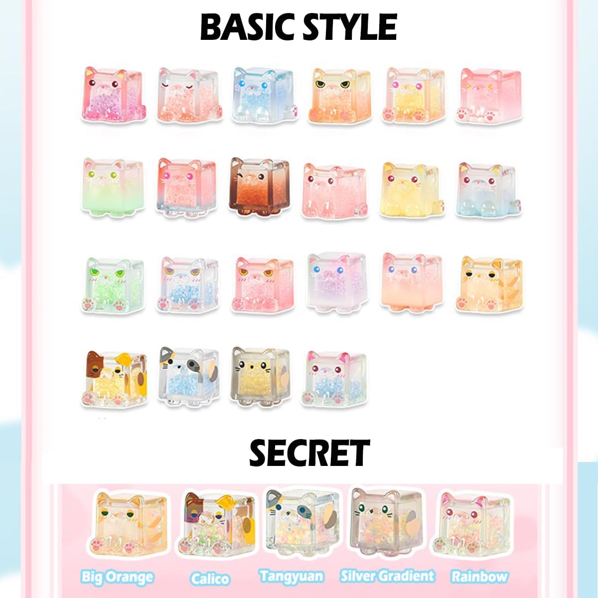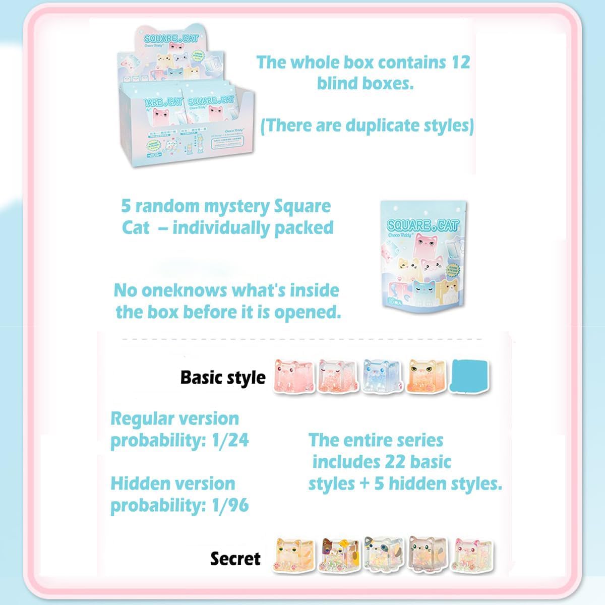 Nome del prodotto: i giocattoli Square Cat Series Blind Box sono oggetti da collezione forniti in una scatola sigillata. Il contenuto è sconosciuto agli acquirenti fino all'apertura. Questa serie include 22 personaggi regolari e cinque versioni nascoste. Giocattolo grazioso: l'altezza di ogni personaggio è compresa tra 0,9 e 1,1 pollici. Misuriamo manualmente la dimensione. Lievi variazioni sono considerate normali. Design casuale: ogni borsa cieca è disposta in modo casuale. È possibile ottenere l'output nascosto in ogni singola scatola con una probabilità di 1/96. Quindi, se lo ottieni, congratulazioni, sei molto fortunato! Materiale: PVC/vetro atossico, innocuo e inodore. I simpatici personaggi della scatola portafortuna dei colori dei personaggi sono vivaci e non sbiadiscono facilmente. La superficie è liscia e ha un'alta qualità. Regalo perfetto: regalo a sorpresa per gli amici per compleanni, Natale, Halloween, San Valentino e molto altro ancora. Da mostrare in casa, bomboniere, accessori da scrivania o in auto. I personaggi sono carini e un regalo giocattolo da collezione. Un'opera d'arte che esprime sentimenti ed emozioni.