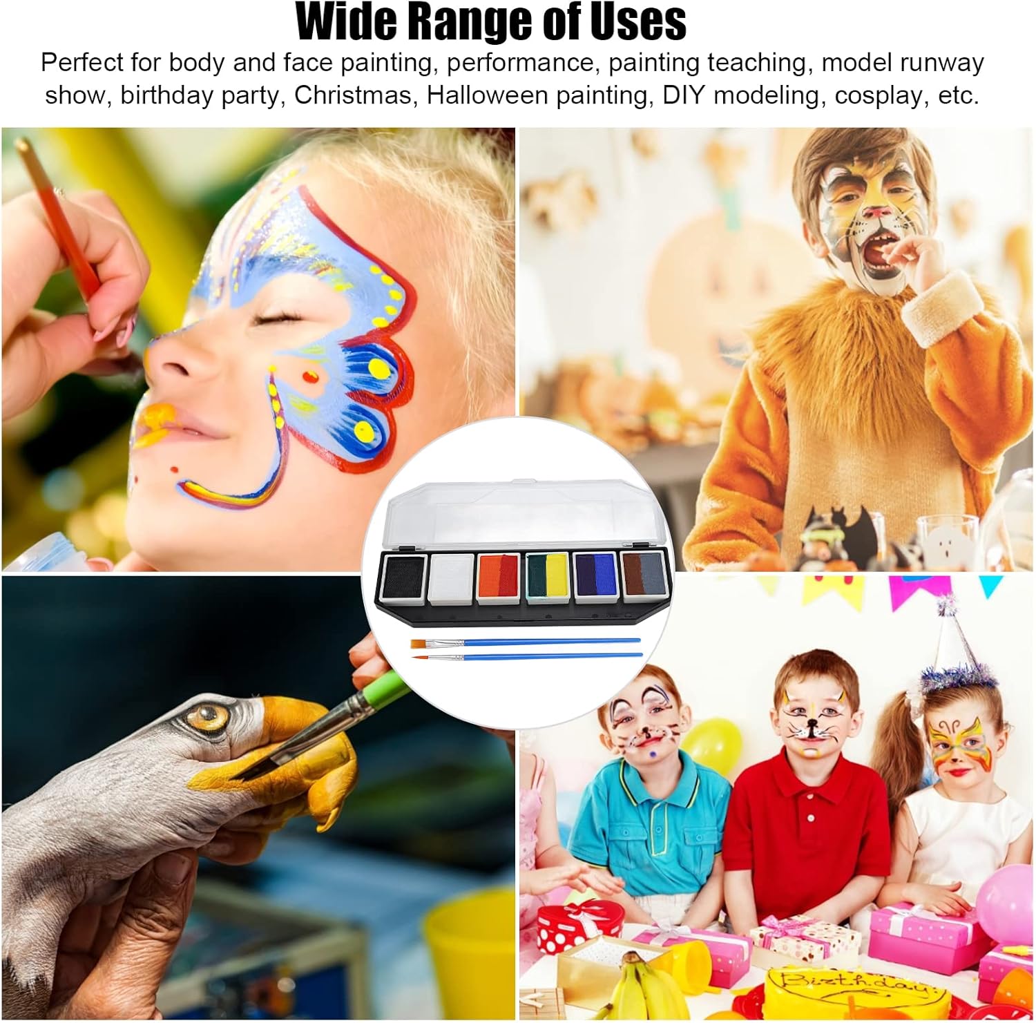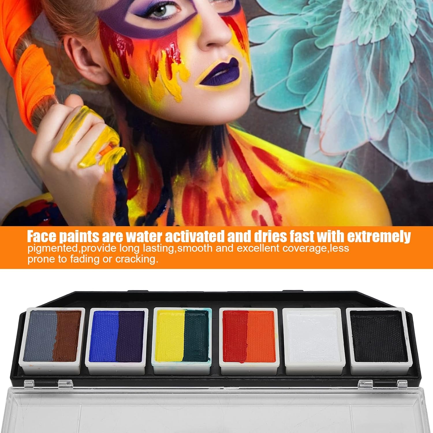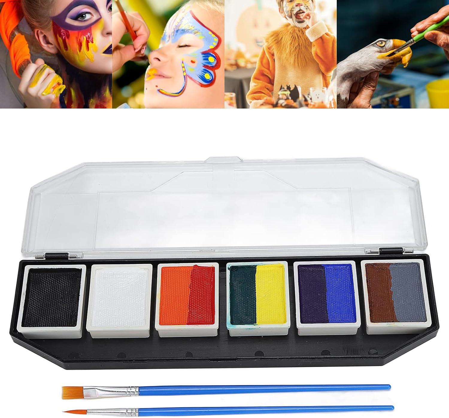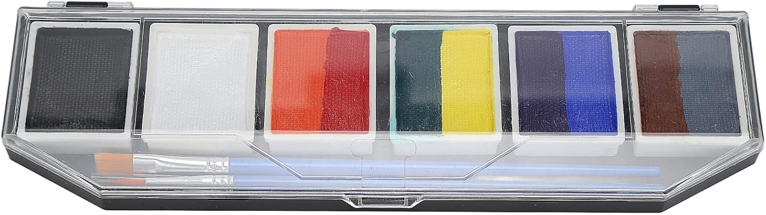 Il set per la pittura del viso e del corpo è realizzato in materiale atossico, ipoallergenico ed ecologico, utilizzabile sia dai bambini che dagli adulti. Utilizzo semplice: purché il pennello sia immerso nell'acqua per sfumare la vernice alla concentrazione appropriata, è possibile verniciarlo. Prestazioni eccellenti: le vernici per il viso sono attivate con acqua e si asciugano rapidamente con estremamente pigmentate, forniscono una copertura duratura, liscia ed eccellente, meno soggette a sbiadimento o screpolature. Facile pulire: le salviette umidificate possono essere rimosse direttamente o lavate con acqua. Per alcuni colori, utilizzare acqua e sapone o un detergente per il viso per lavarli via. Ampiamente usato: buono per la pittura del corpo e del viso, performance, insegnamento della pittura, sfilate di modelli, feste di compleanno, Natale, pittura di Halloween, modellismo fai--te, cosplay, ecc.