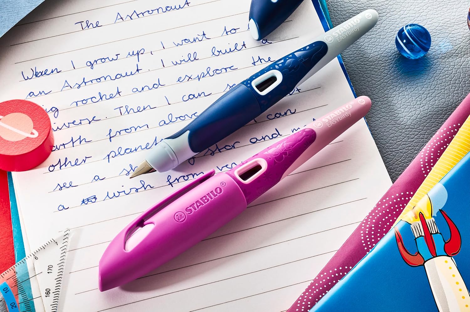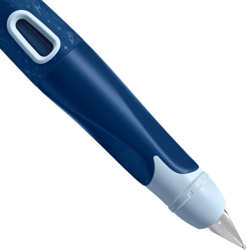 2 diversi mondi colorati con una struttura 3D tattile Zona di presa ergonomica e antiscivolo, in versioni speciali per utenti mancini e destrimani Angolo della punta regolabile individualmente per una scrittura morbida e un carattere pulito Pennino con grana di iridio per una facile guida di scrittura e un carattere pulito - non macchia, non si graffia Pennino protetto dalle dita blu Finestra di visualizzazione per controllare il livello dell'inchiostro