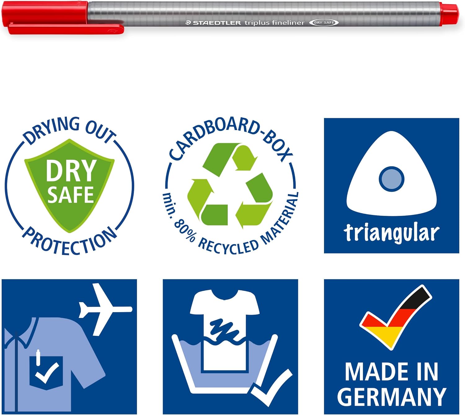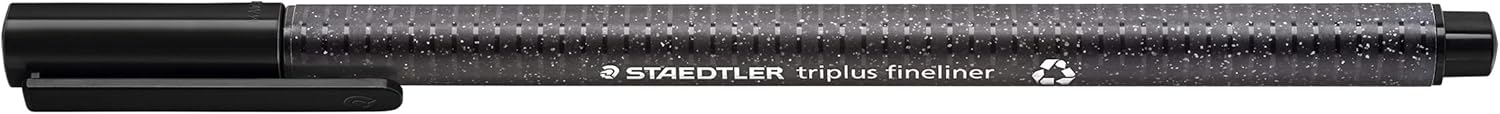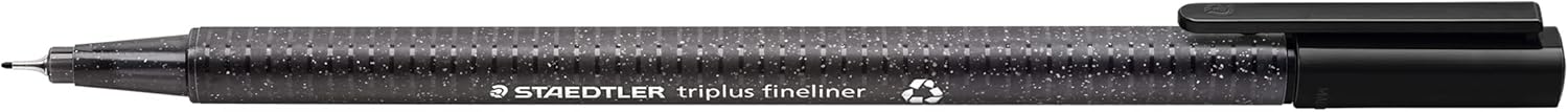 Fineliner con fusto triangolare ergonomico per scrivere e disegnare liberamente; con punta superfine, rivestita in metallo. Larghezza della linea: circa 0,3 mm L'alloggiamento è realizzato in plastica riciclata al 97% Inchiostro a base d'acqua, facilmente lavabile dalla maggior parte dei tessuti Funzione anti-essiccamento: possono rimanere per giorni senza seccarsi; il fusto in polipropilene garantisce una lunga durata Contenuto della confezione: 4 penne fineliner triplus nere in blister
