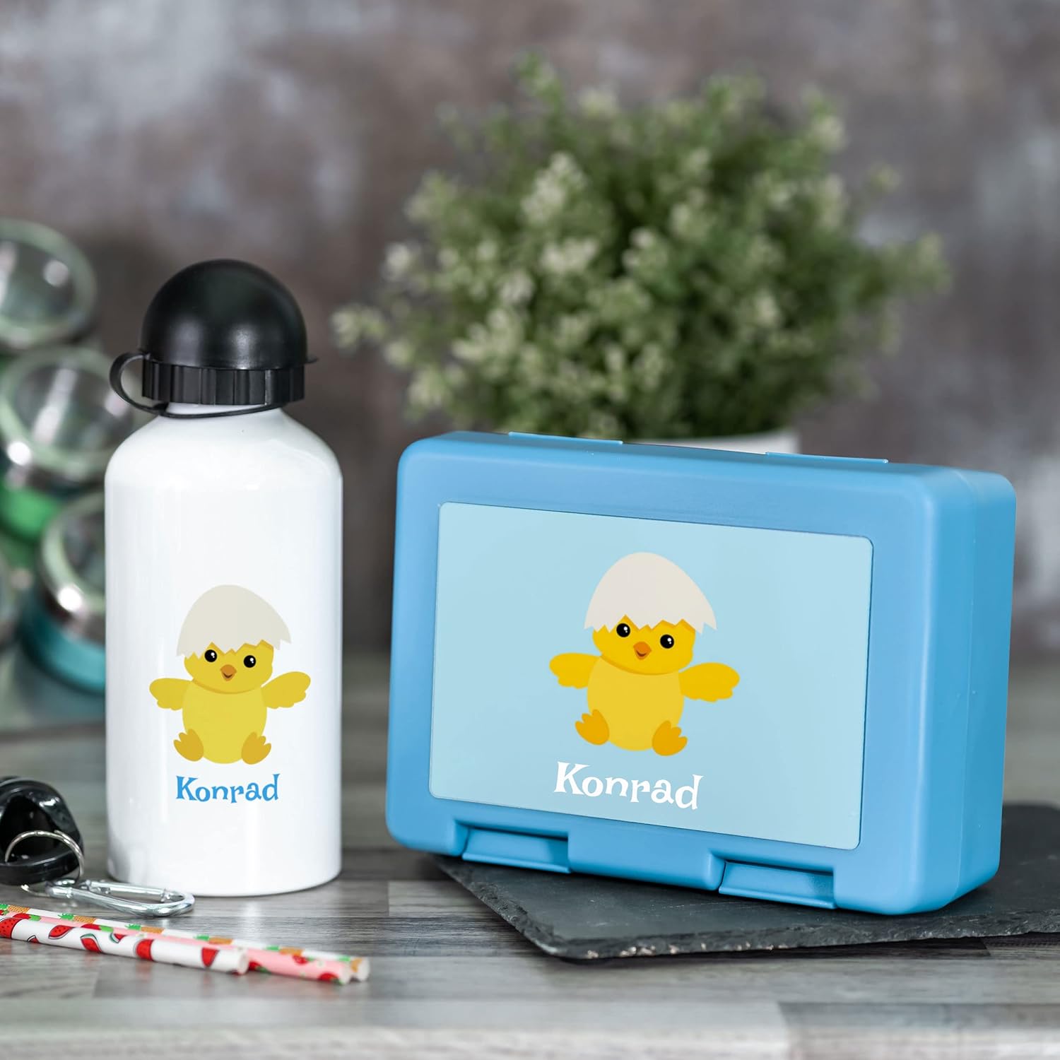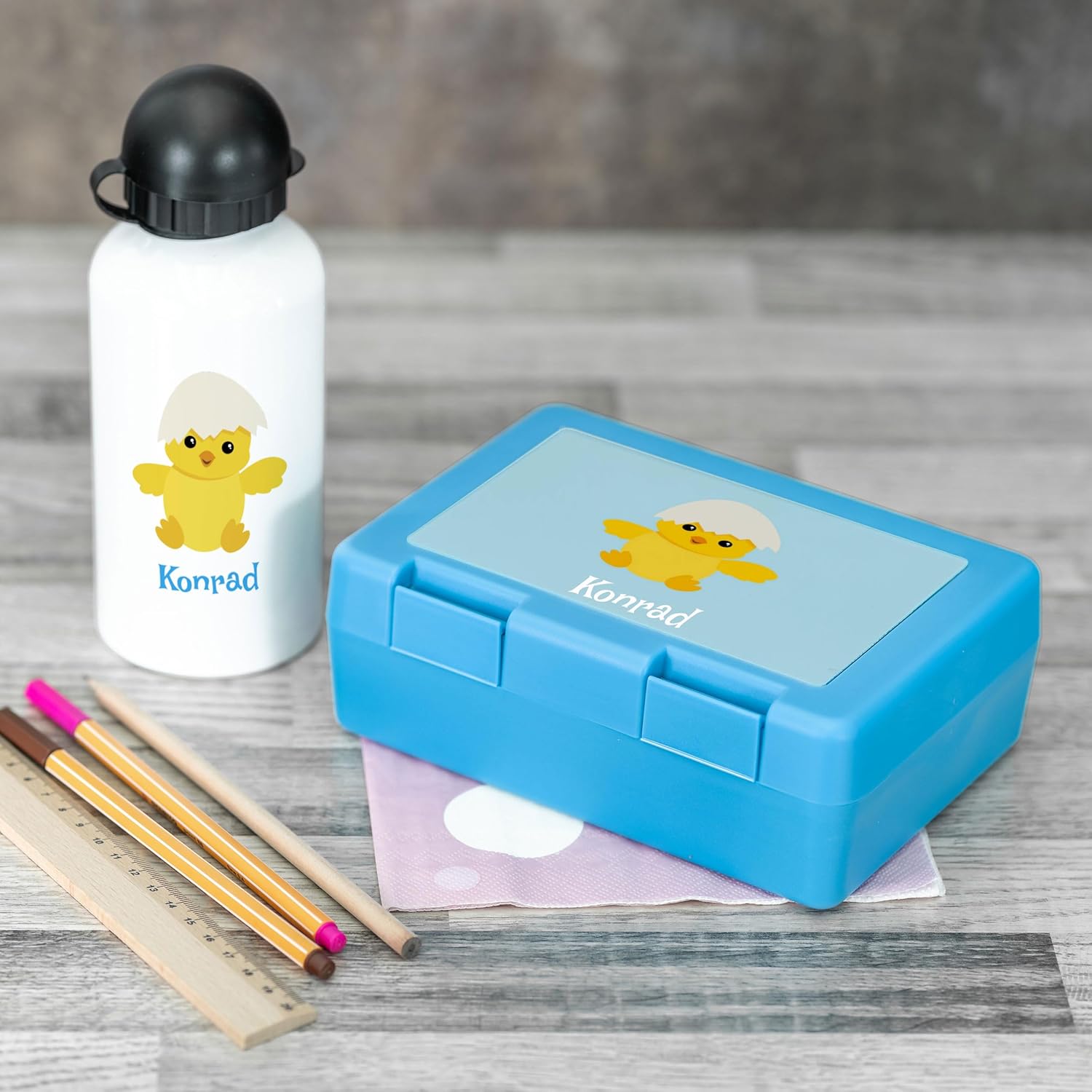 MATERIALE: Il nostro fantastico contenitore per il pranzo è realizzato in plastica resistente ai graffi e alla rottura. È particolarmente ben protetto dalla doppia chiusura. La borraccia è realizzata in alluminio e comprende un boccaglio con coperchio, tappo a vite e moschettone. IDEA REGALO PERFETTA: all'asilo o a scuola: la pausa è il momento migliore. Naturalmente non dovrebbe mancare un esclusivo set per il pranzo. Un regalo fantastico, pratico e individuale, ideale per iniziare l'asilo o iniziare la scuola. Gli occhi dei bambini brilleranno. STAMPA PRECISA: per garantire una qualità costante, i contenitori per il pranzo e le borracce sono stampati a mano con colori brillanti e duraturi. Aggiungi il tuo tocco personale al set da pranzo. PERSONALIZZAZIONE FACILE: il set può essere personalizzato direttamente su Amazon. Per fare ciò, è sufficiente fare clic sul pulsante "Personalizza ora", scegliere tra diversi caratteri e colori e inserire qualsiasi testo. DETTAGLI DEL PRODOTTO: La fornitura comprende un contenitore per il pranzo azzurro di 18,5 x 12,8 x 6,5 cm e una borraccia bianca. La borraccia è alta 19 cm e ha una capacità massima di 500 ml. Naturalmente lo snack box è adatto agli alimenti ed è conforme al regolamento CE n. 1935/2004 e UE n. 10/2011. La borraccia è conforme al regolamento REACH (CE) n. 1907/2006. Consigliamo di lavare i prodotti a mano
