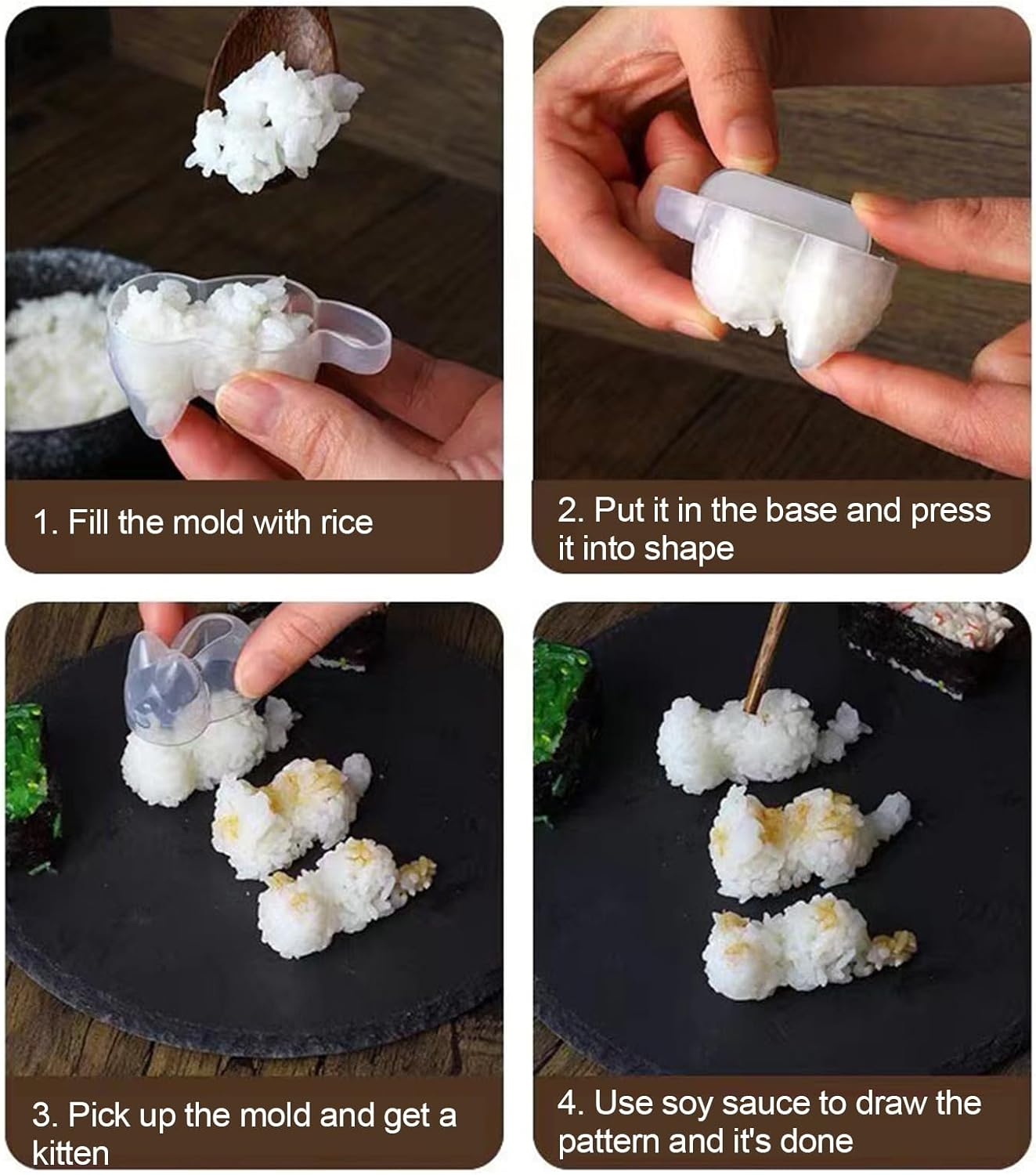 Affascinante forma di gatto: il nostro riso per gatti è amato con il suo simpatico design a forma di gatto, trasformando il riso normale in deliziose forme di gatto che rendono ogni pasto più interessante e attraente. Il modo perfetto per migliorare la tua esperienza culinaria. Facile da realizzare: riempi lo stampo per palline di riso con riso senza sforzo, anche i principianti apprezzeranno la comodità di creare forme perfette ad ogni tentativo. Grado alimentare e sicuro: stai certo che il cibo è sicuro e sano con il nostro riso per gatti. Realizzato con robusti materiali PP per uso alimentare, fiducia nella durata e nella qualità. Facile sformatura: ottieni stampi precisi per riso per gatti senza sforzo con il nostro stampo per riso per gatti antiaderente e demografico. Mantiene la sua forma completa senza residui appiccicosi. Sperimenta la creatività culinaria: con il nostro stampo per riso per gatti, puoi rendere più divertenti vari cibi, dalle polpette di riso ai biscotti sagomati per feste o pasti quotidiani. Questa forma versatile è di grande aiuto in ogni cucina, permettendoti di stupire i tuoi ospiti e rendere i pasti entusiasmanti per tutti.