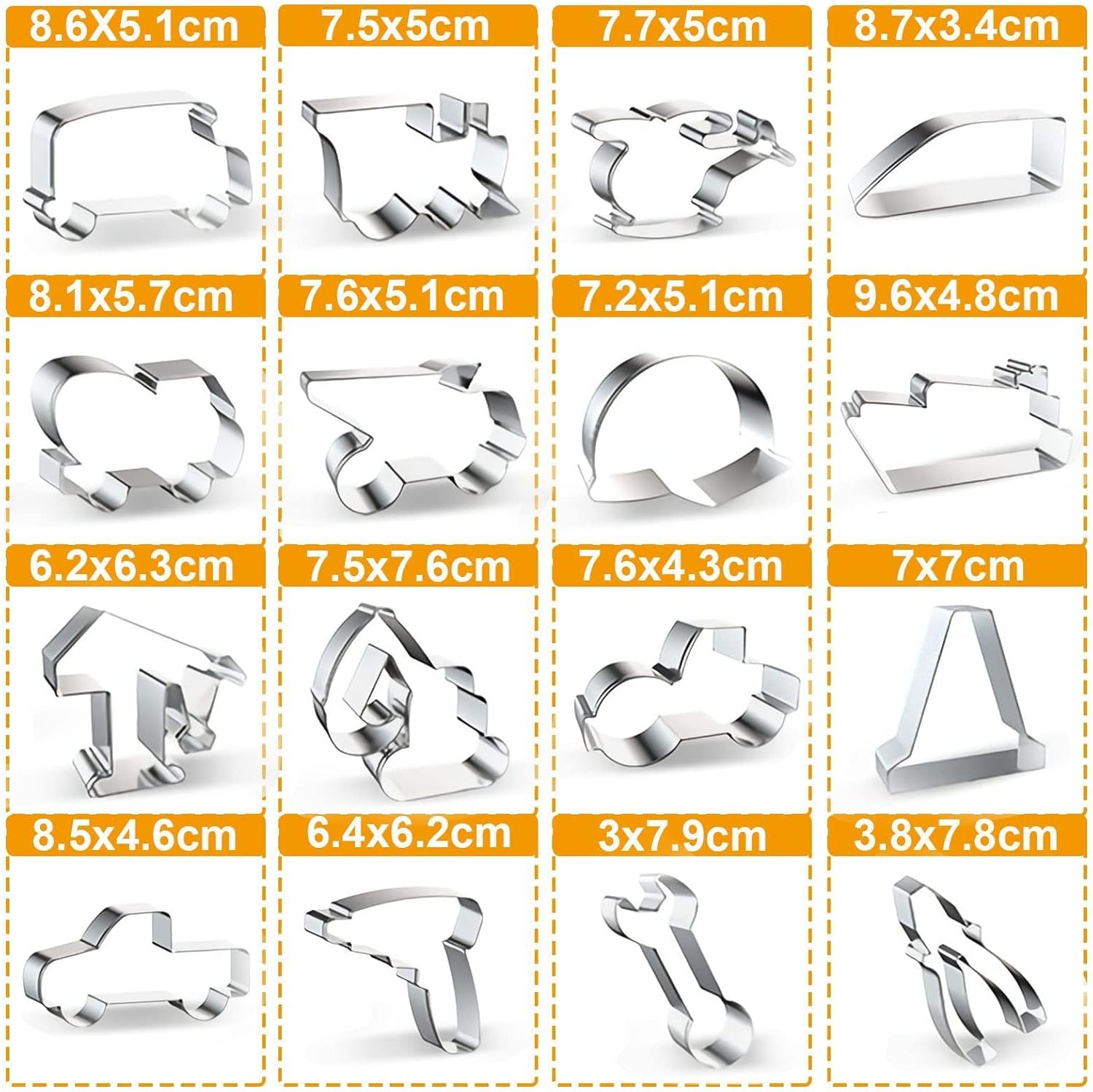 Qualità: tutto in acciaio inox di qualità alimentare, sicuro e durevole, non arrugginisce Fantastici motivi: escavatore, autobus, elicottero, treni, pollice, barche, archi stradali, blocco stradale, casco di protezione, trapano elettrico, pinza per chiavi inglesi per cantieri e veicoli di trasporto per divertirsi a feste, eventi per bambini e feste di compleanno Realizzazione: forme bellissime, soddisfano pienamente il loro scopo, lavorazione di buona qualità, bordo affilato per una forma perfetta. Facile da modellare: basta posizionare gli stampi per biscotti sull'impasto, premere leggermente e poi estrarre gli stampini, l'impasto si può modellare bene. Ideale per bambini, principianti e amanti della pasticceria Ampia gamma di spazi: le forme sono riconosciute dai bambini e hanno una buona dimensione. Per pane, crociera, frutta morbida, formaggio, melone, pizza, pancake, waffle, argilla artigianale, ecc.